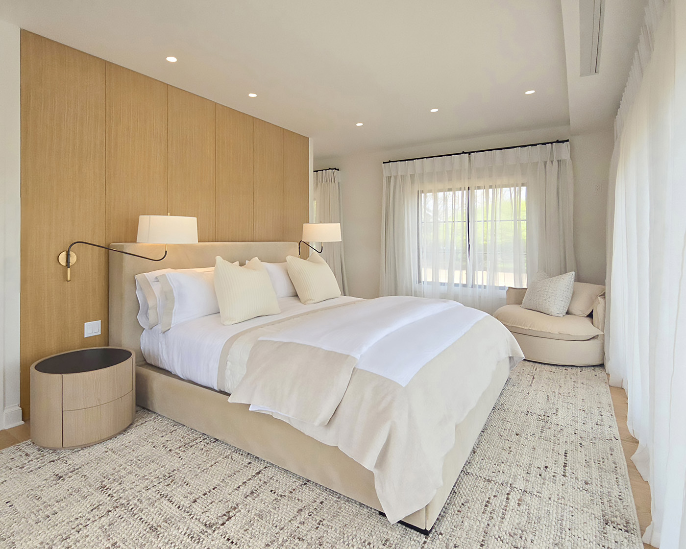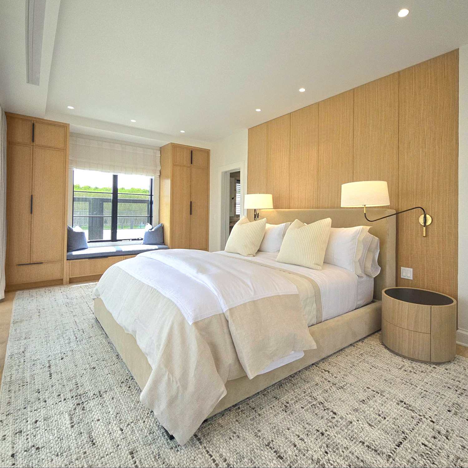 This fully paneled headboard wall in Saw-Cut Rift White Oak demonstrates the beauty of rich, vertically grained wood as an aesthetic backdrop.