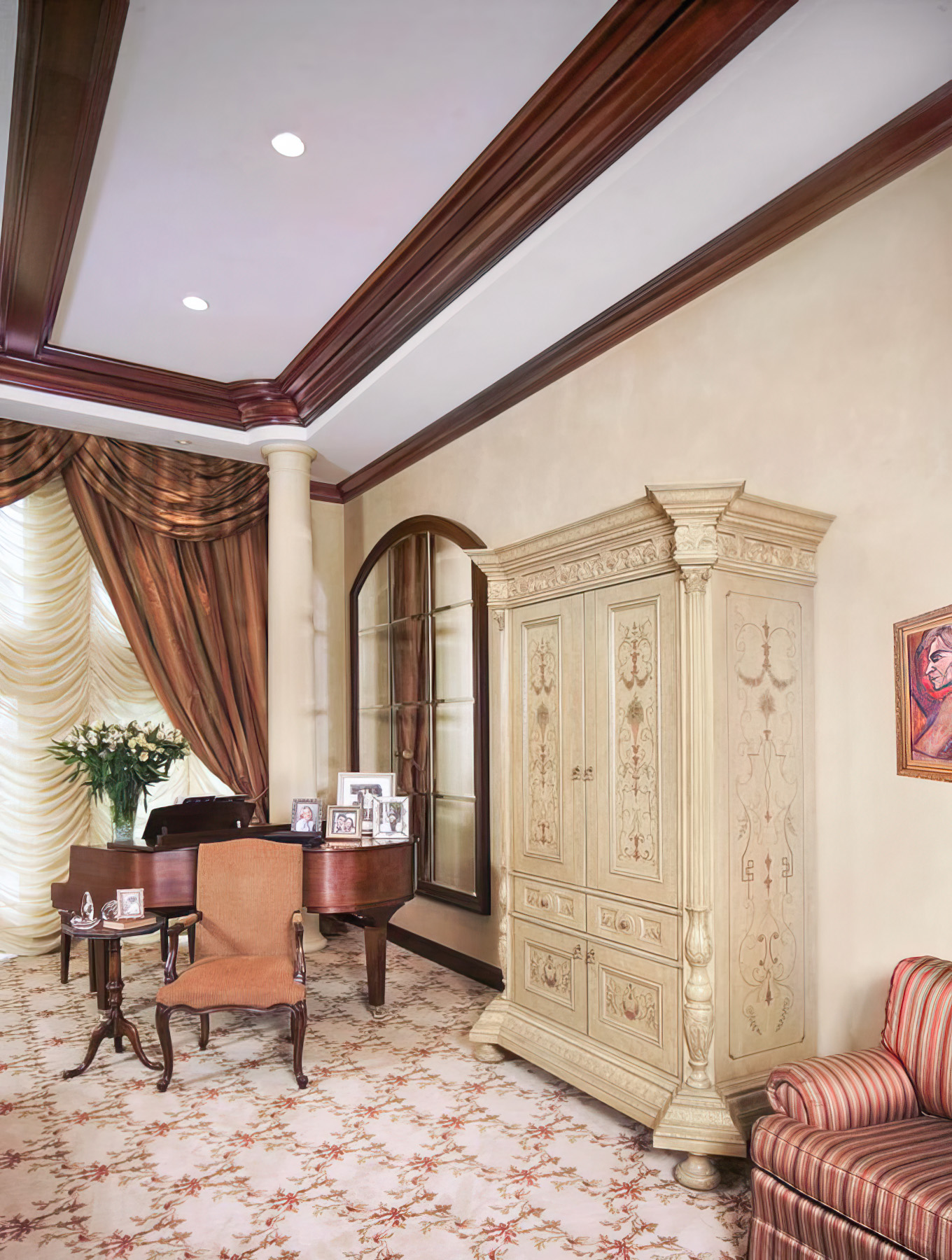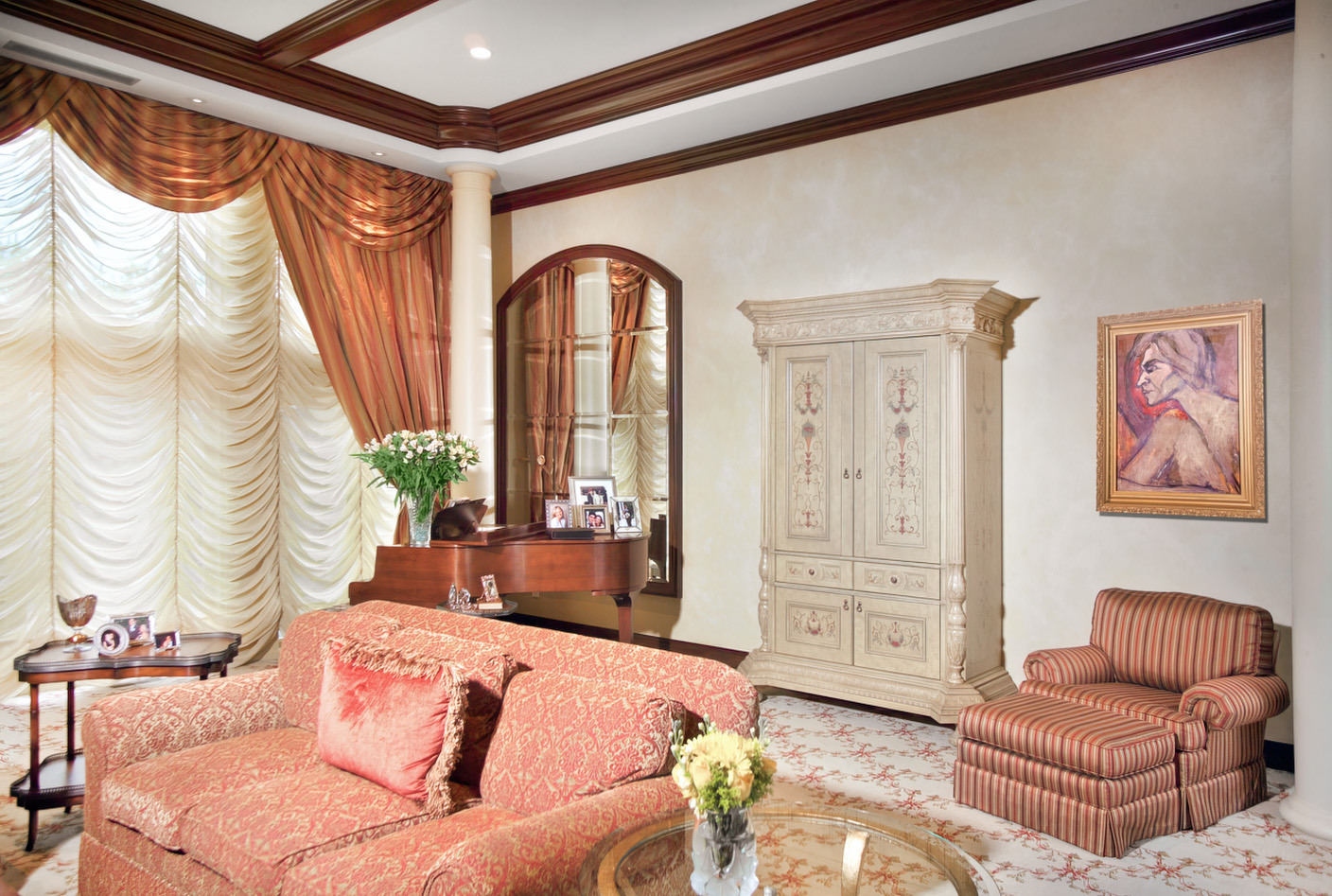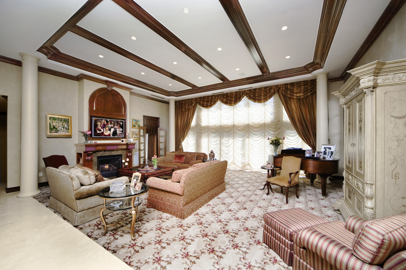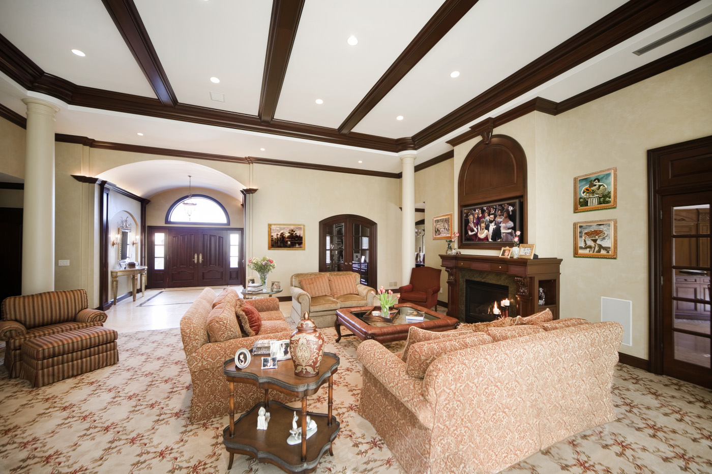 Classic Traditional Millwork with rich beamed ceiling, fine solid doors, elegantly detailed foyer and custom fireplace and TV enclosure.