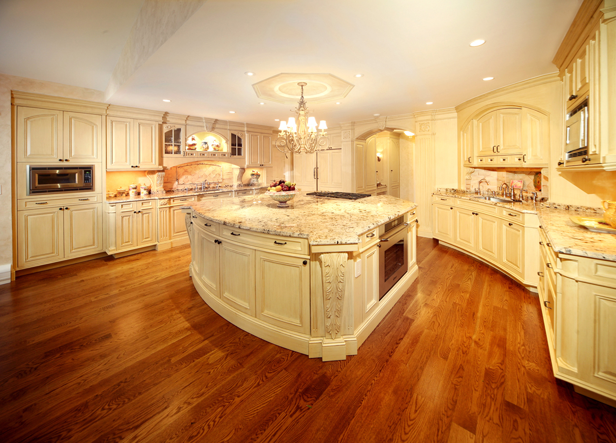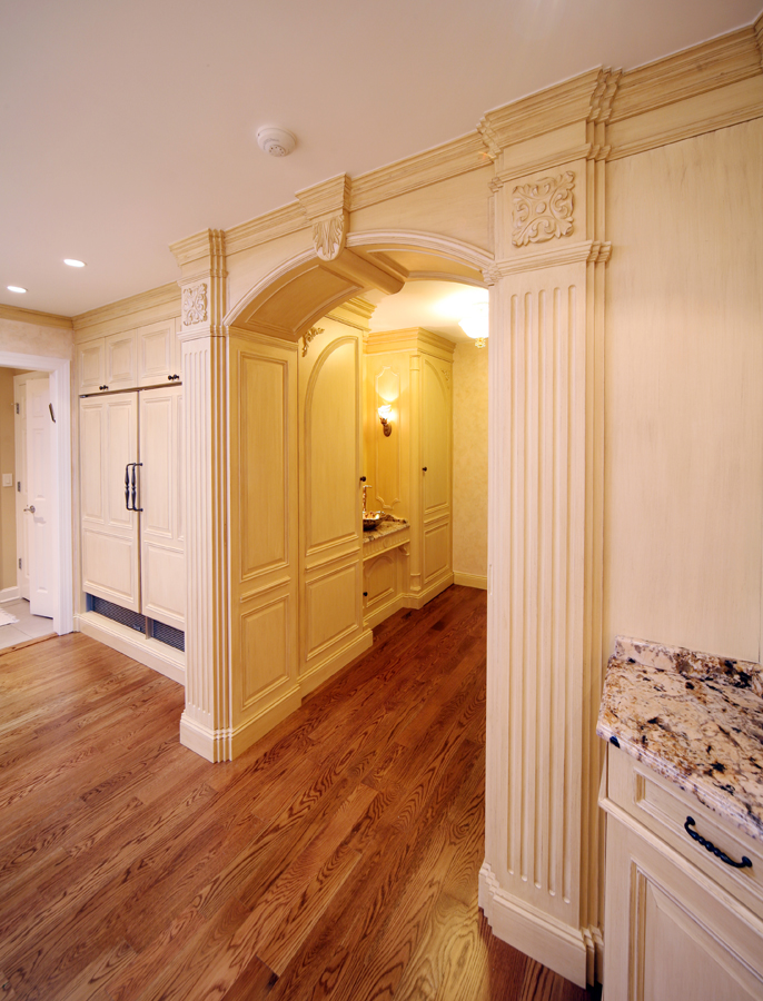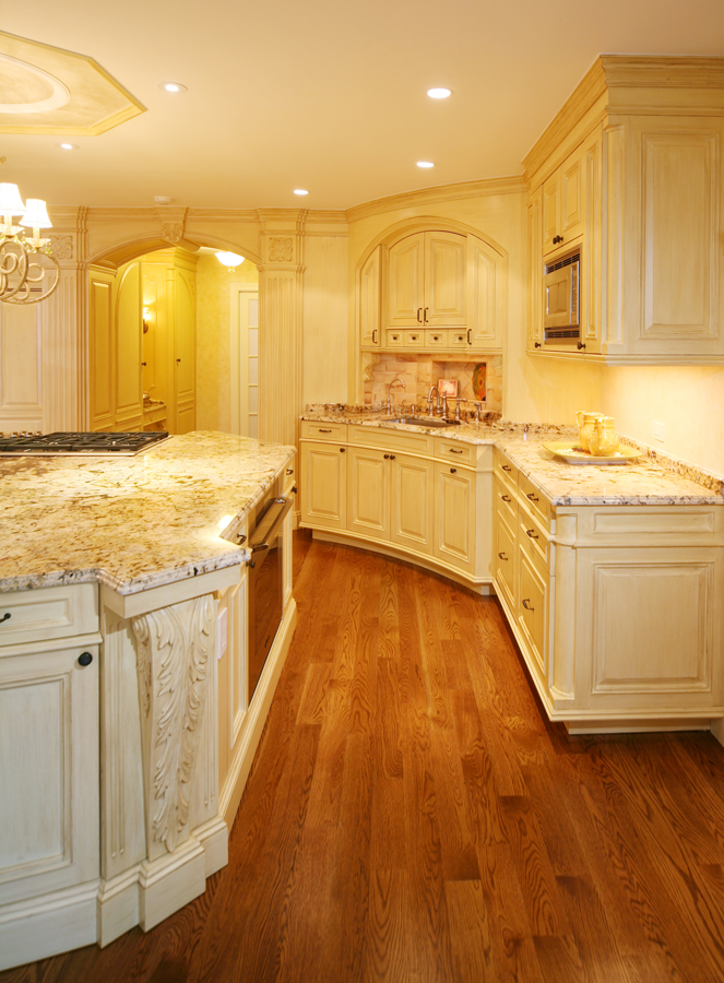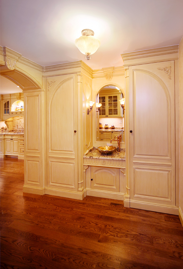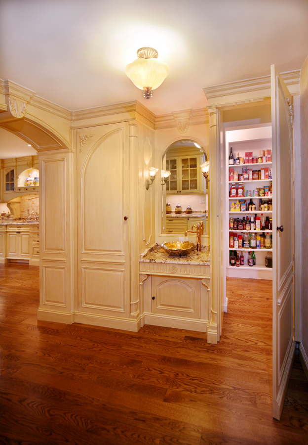 English Country Traditional Millwork with the finest hand carved details with unique hidden compartments to maximize storage in this beautiful kitchen.