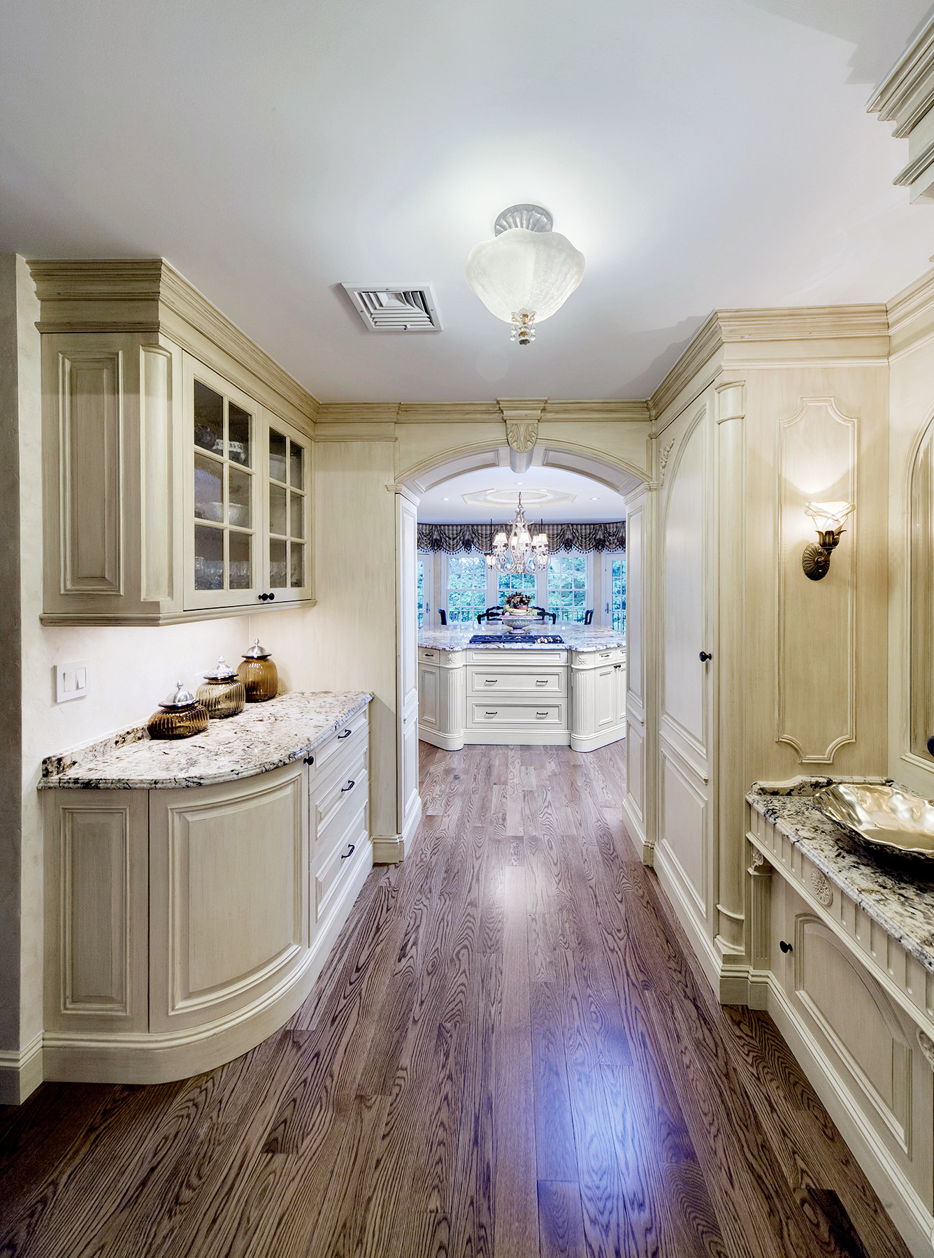 English Country Traditional Millwork with the finest hand carved details with unique hidden compartments to maximize storage in this beautiful kitchen.