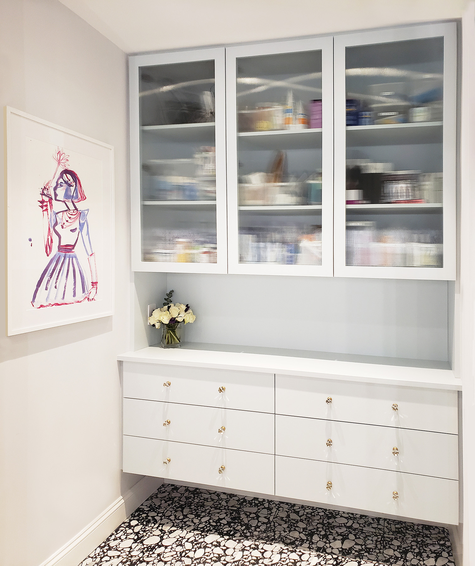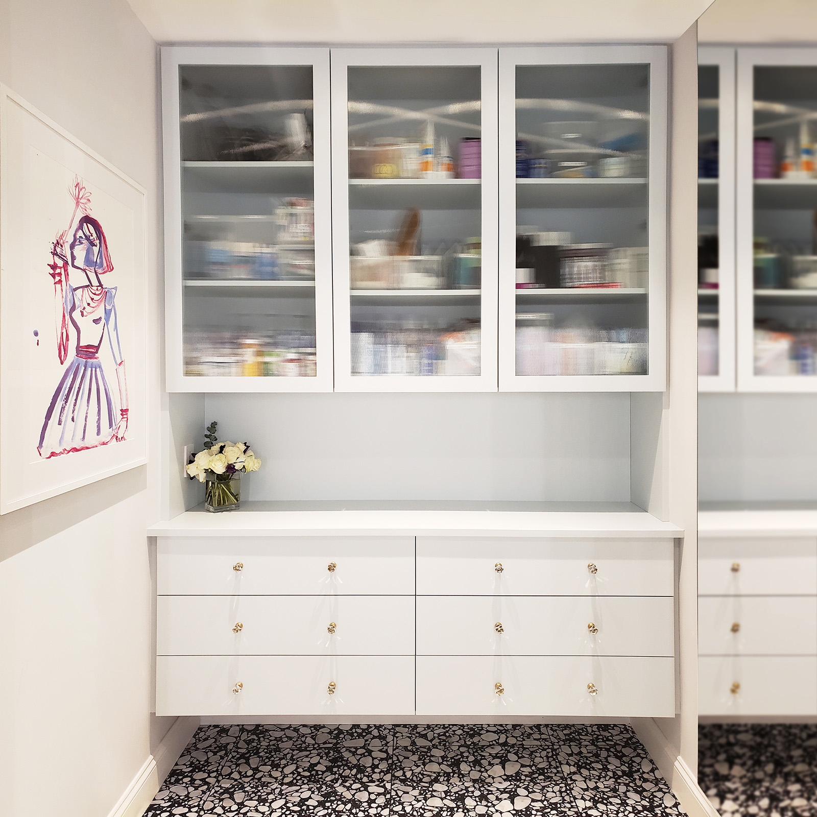 Ovation Armoire hand crafted in Paduk, Ebony and Birds Eye Maple with lined interior drawers and cubbies.