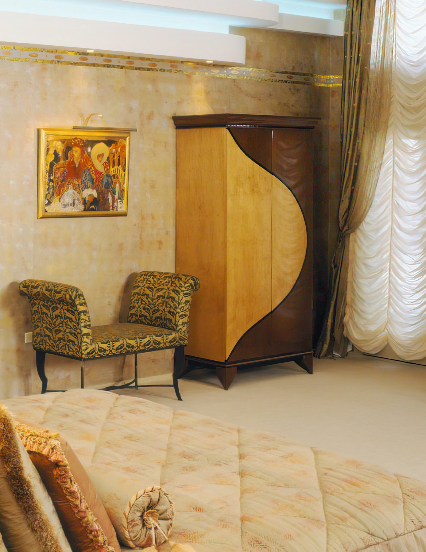 Yin Yang Armoires with design elements in Curly Maple, Mahogany and black lacquer with lined interior drawers and hanging.