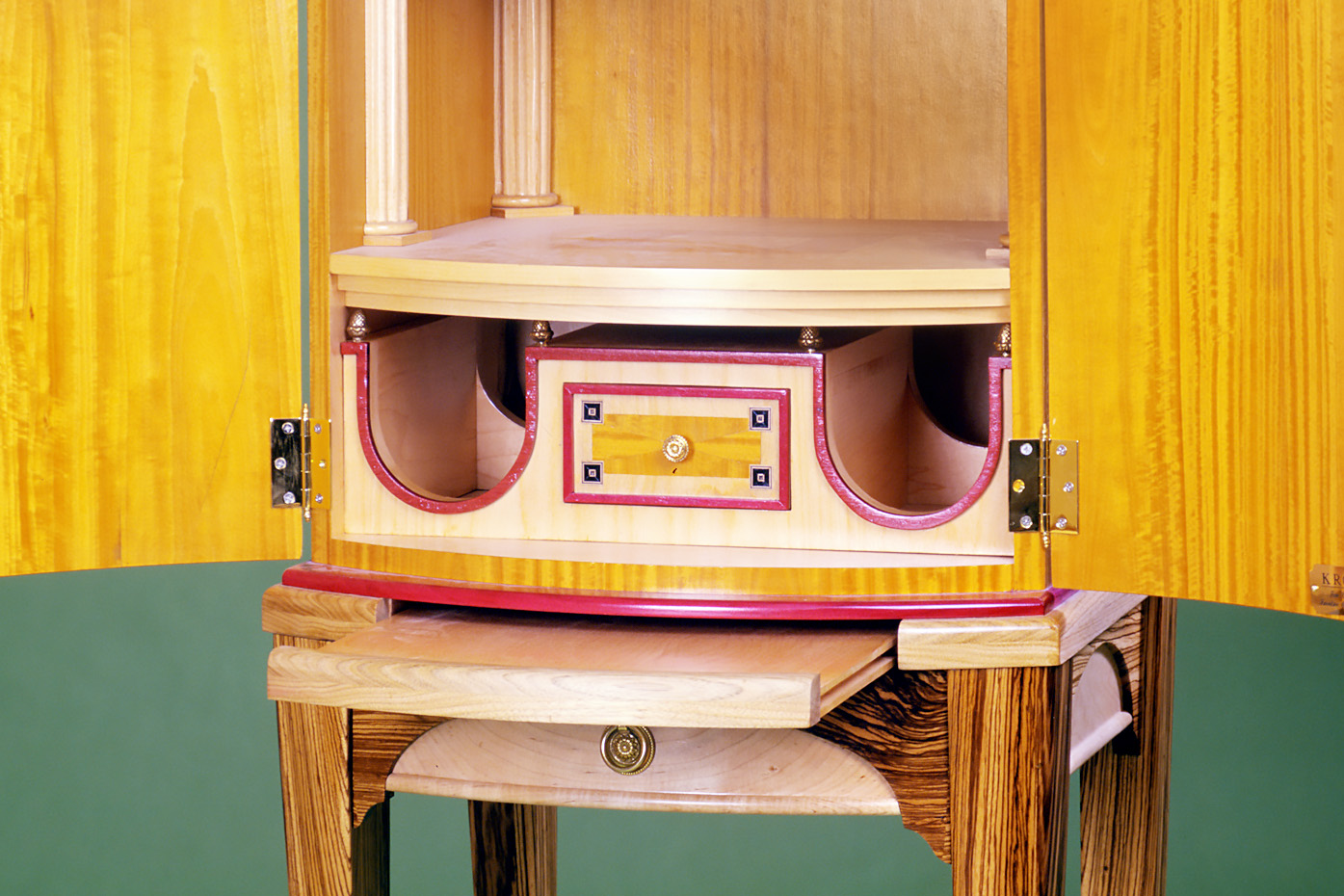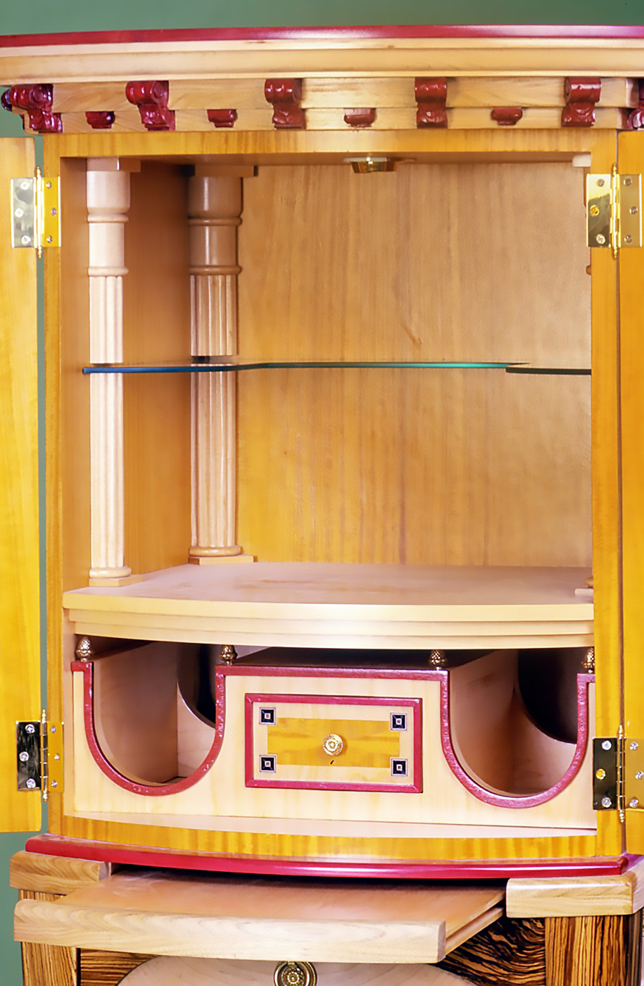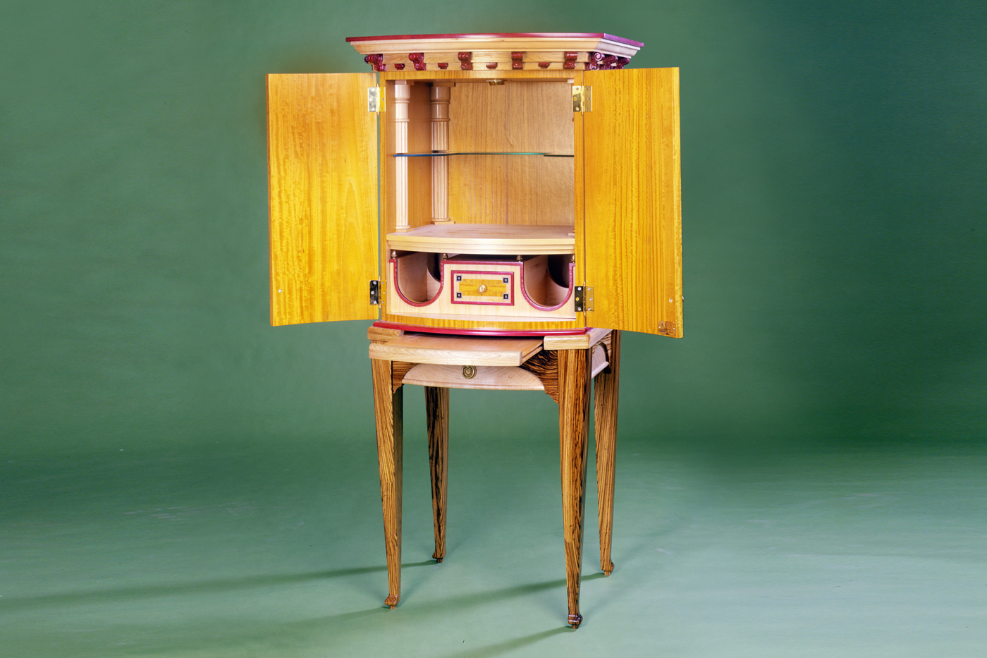 The Brownstone Liquor Cabinet crafted from Purple Heart, East Indian Satinwood, Maple and Zebrawood, & highlighted with hand made custom maquetry and detailed inlays.