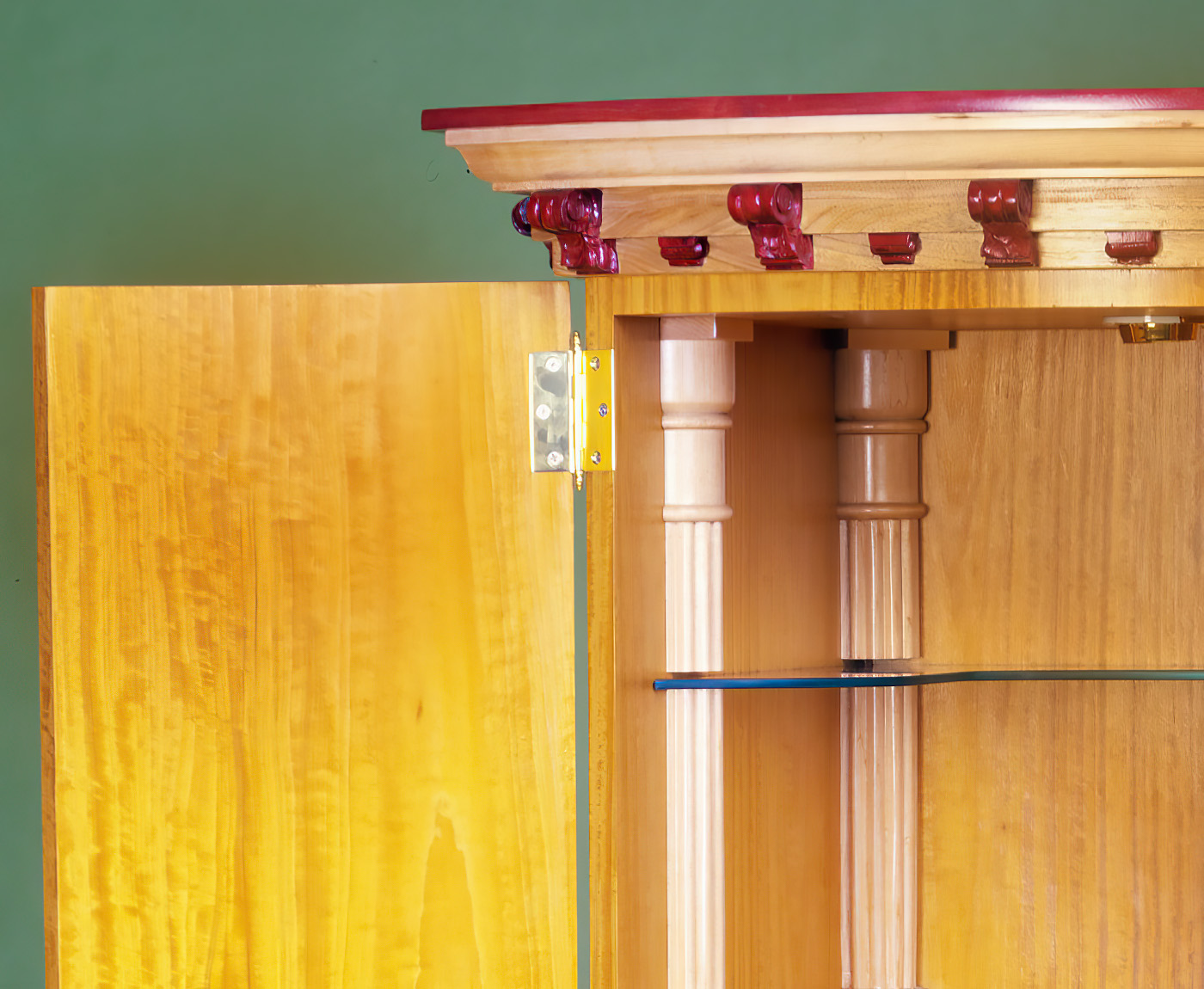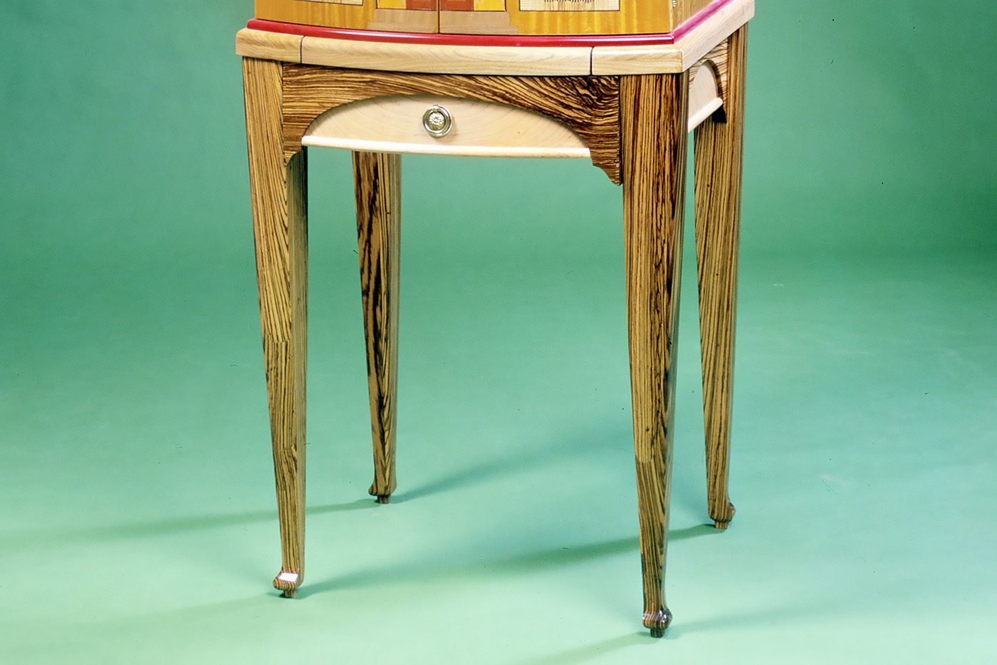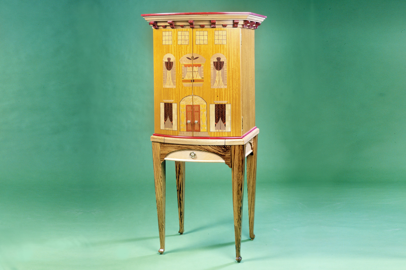The Brownstone Liquor Cabinet crafted from Purple Heart, East Indian Satinwood, Maple and Zebrawood, & highlighted with hand made custom maquetry and detailed inlays.