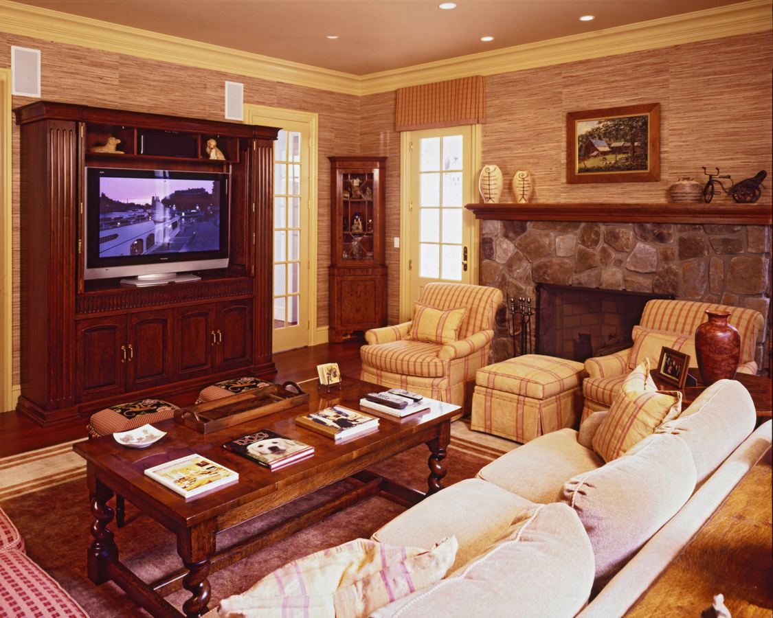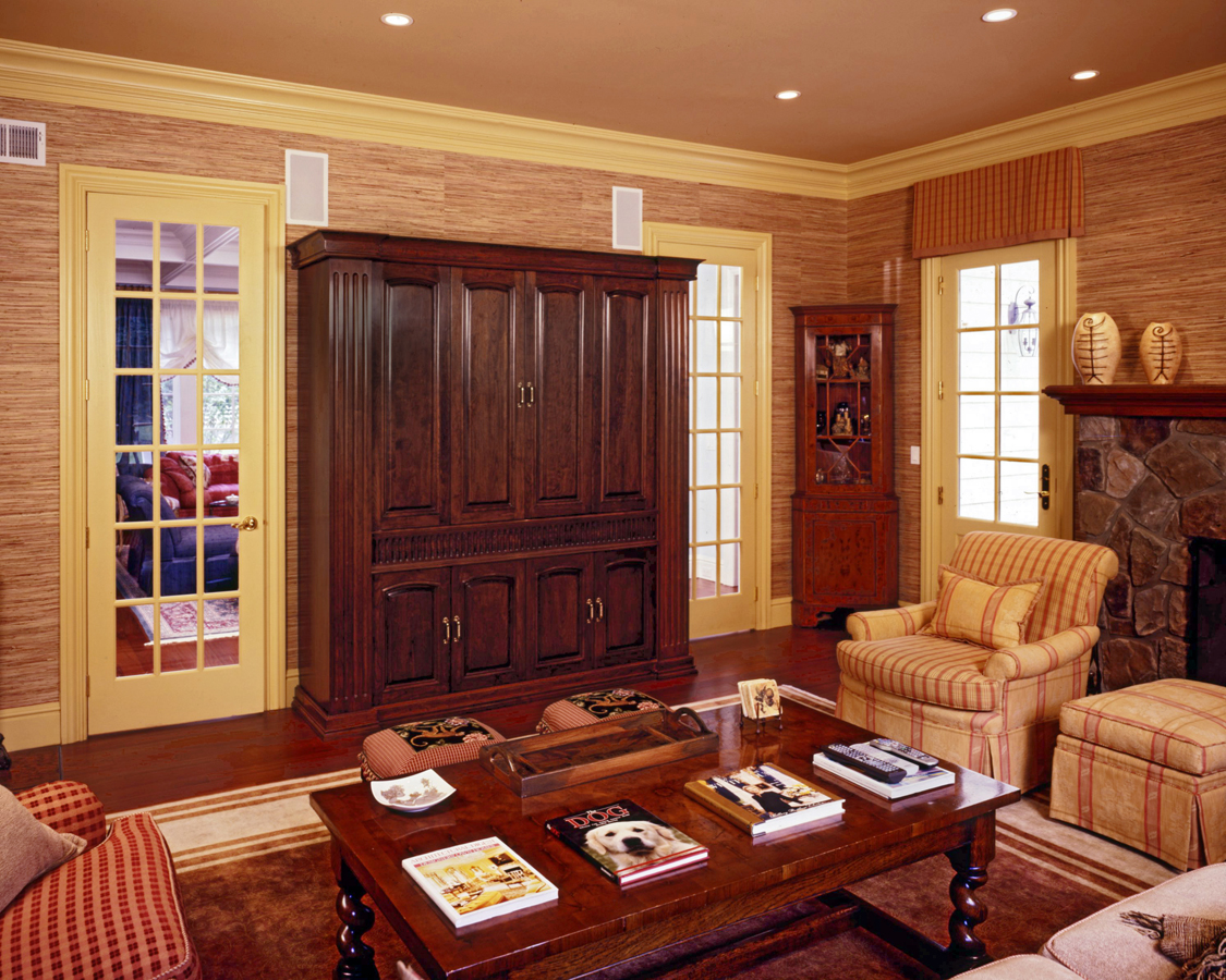 Family Room Multi Purpose Armoire with bi-fold TV pocket doors, and left and right pilasters which open to provide additional hidden storage.