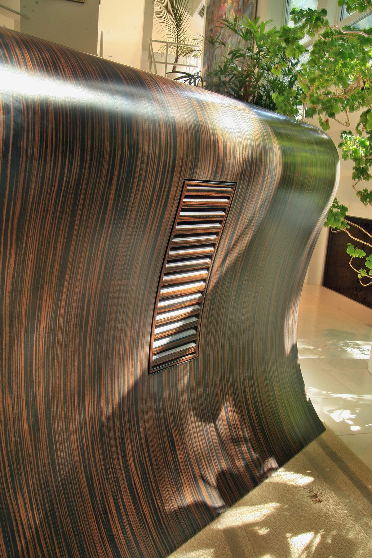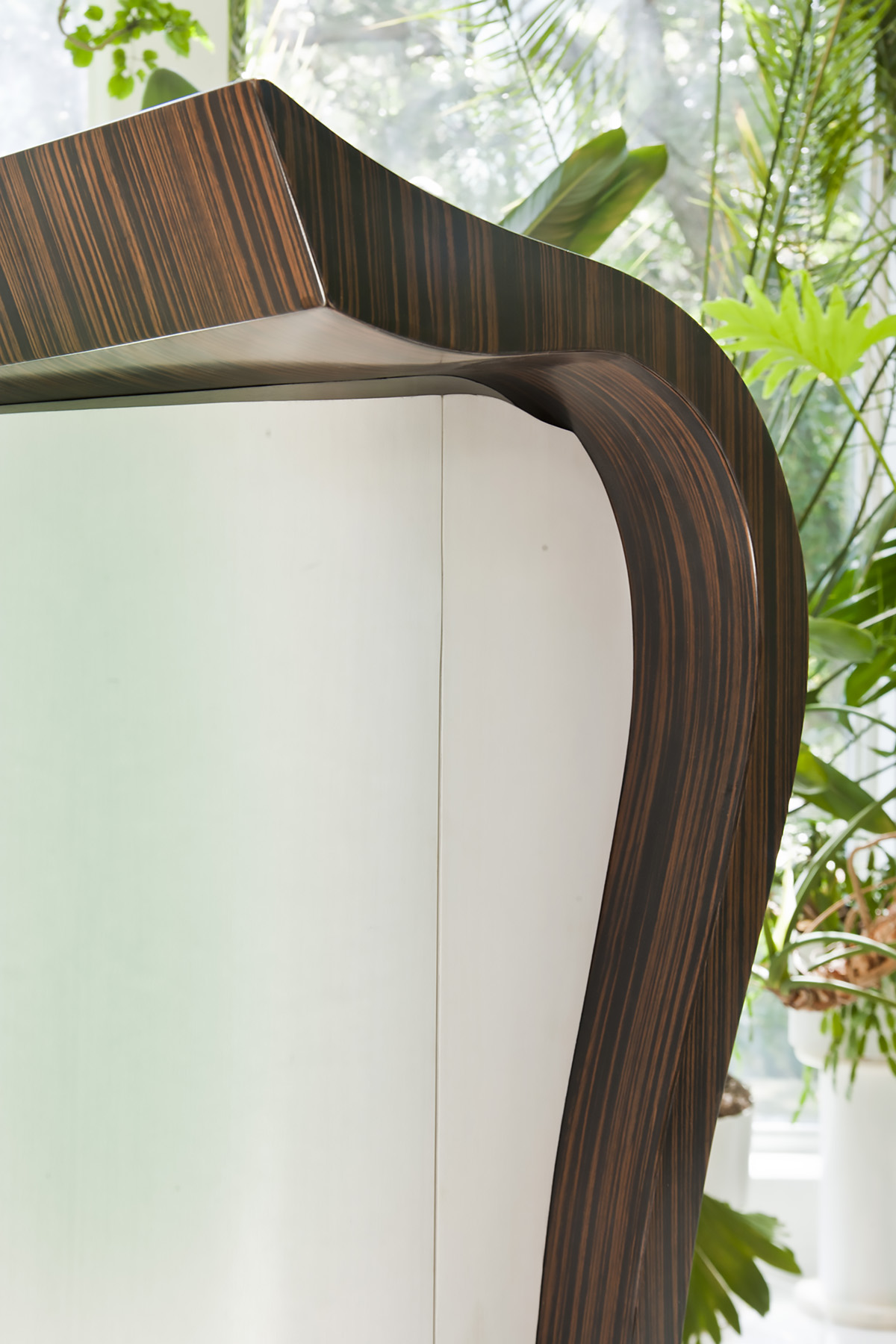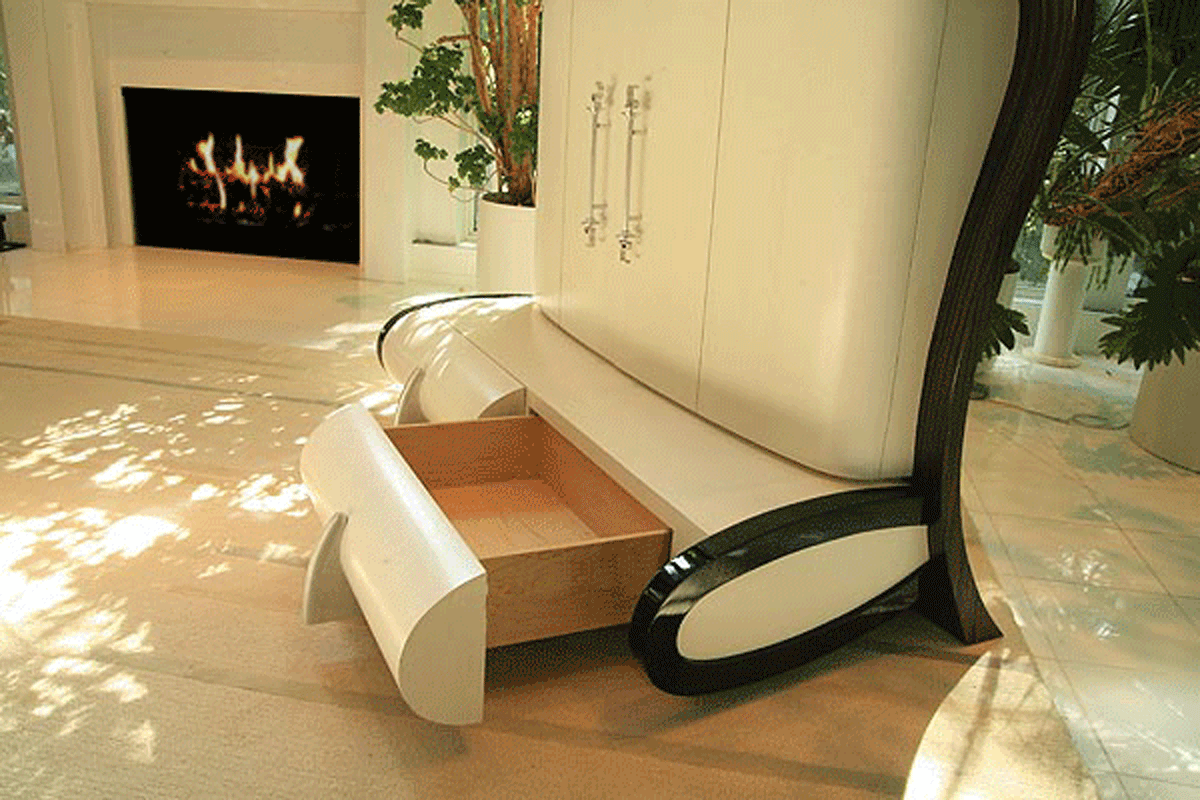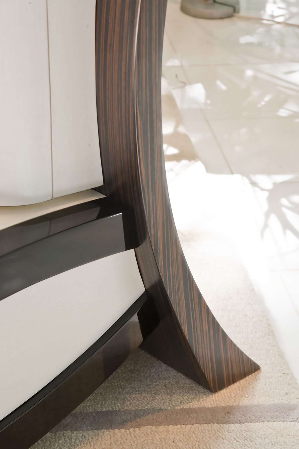 The a TV Cabinet featuring bi-fold doors with custom a handles, white English Sycamore body from Tabu with black lacquer accents, storage drawers, and Macassar Ebony shell with sexy back solid Ebony venting.