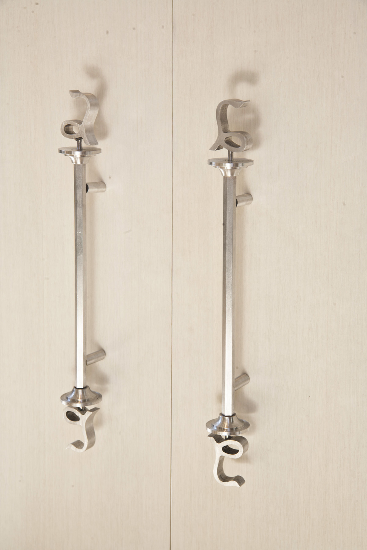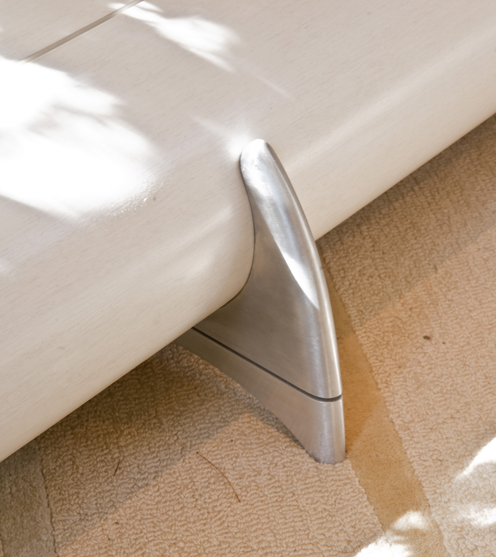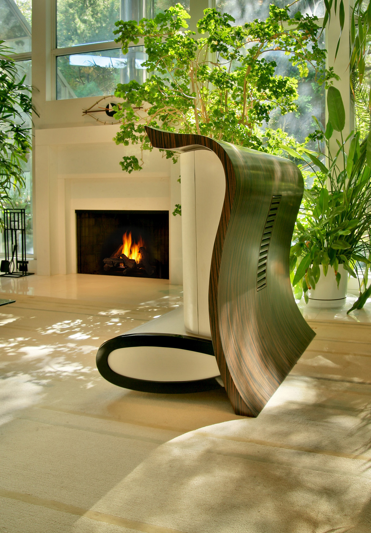The a TV Cabinet featuring bi-fold doors with custom a handles, white English Sycamore body from Tabu with black lacquer accents, storage drawers, and Macassar Ebony shell with sexy back solid Ebony venting.