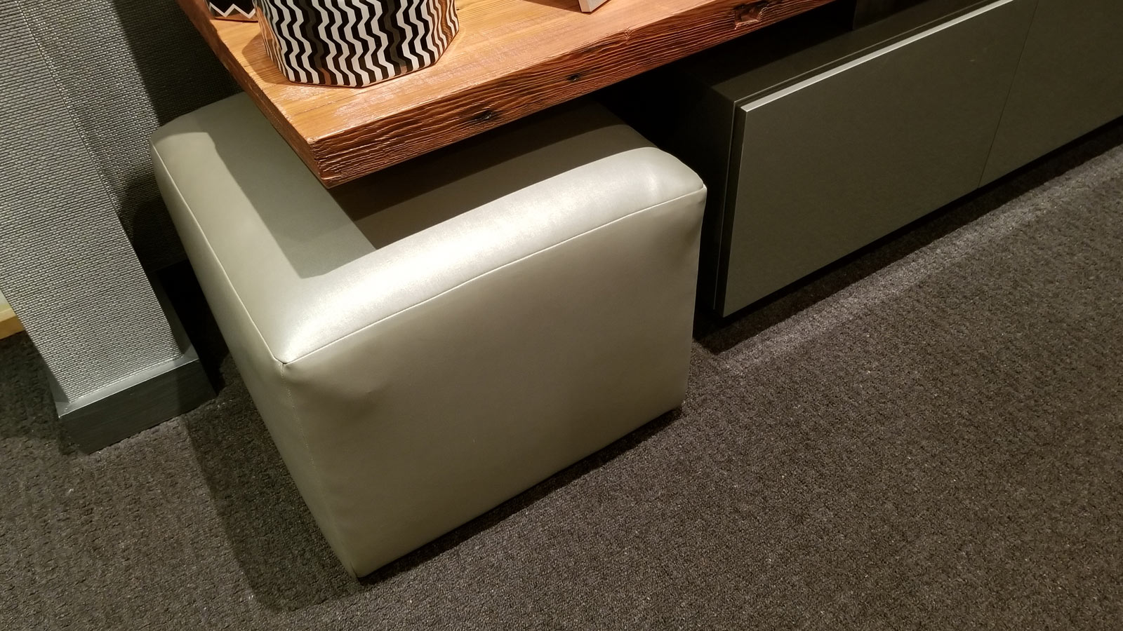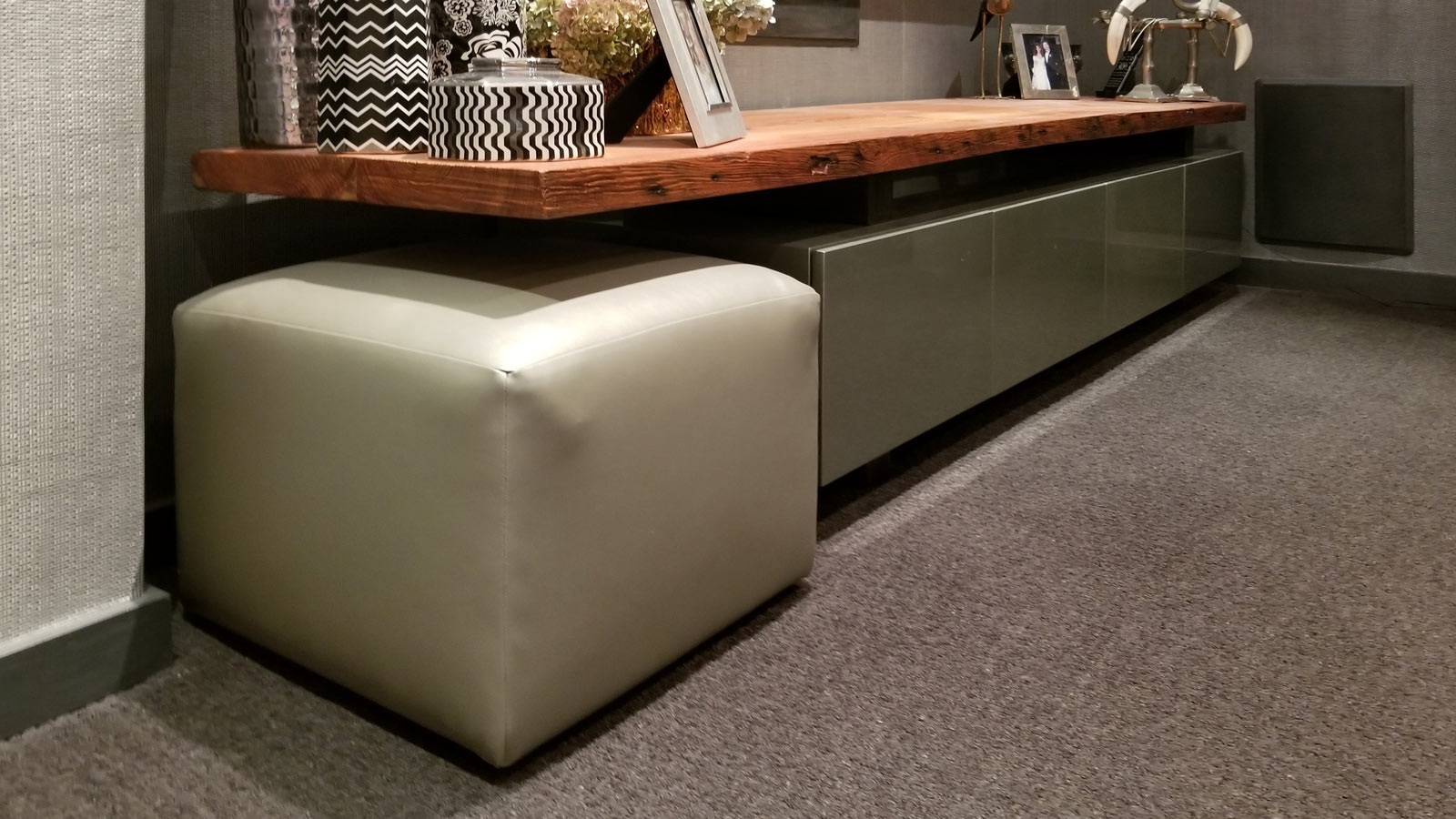 Lacquer and Reclaimed Lumber Audio Video Console finished in pearlescent lacquer with custom made bronze feet and counter supports that float the hand brushed reclaimed lumber top. A custom ottoman is also provided for additional comfort.