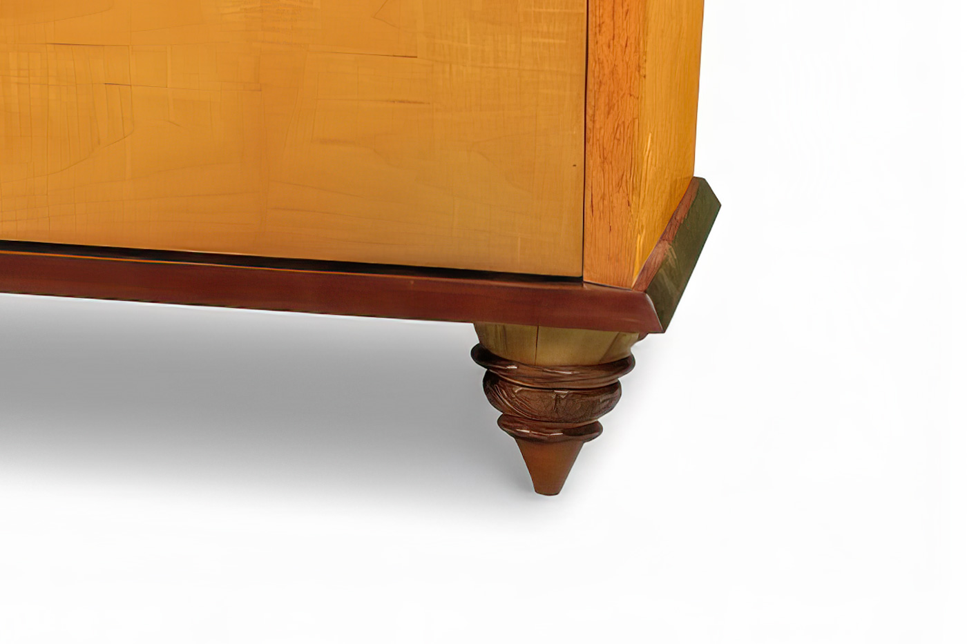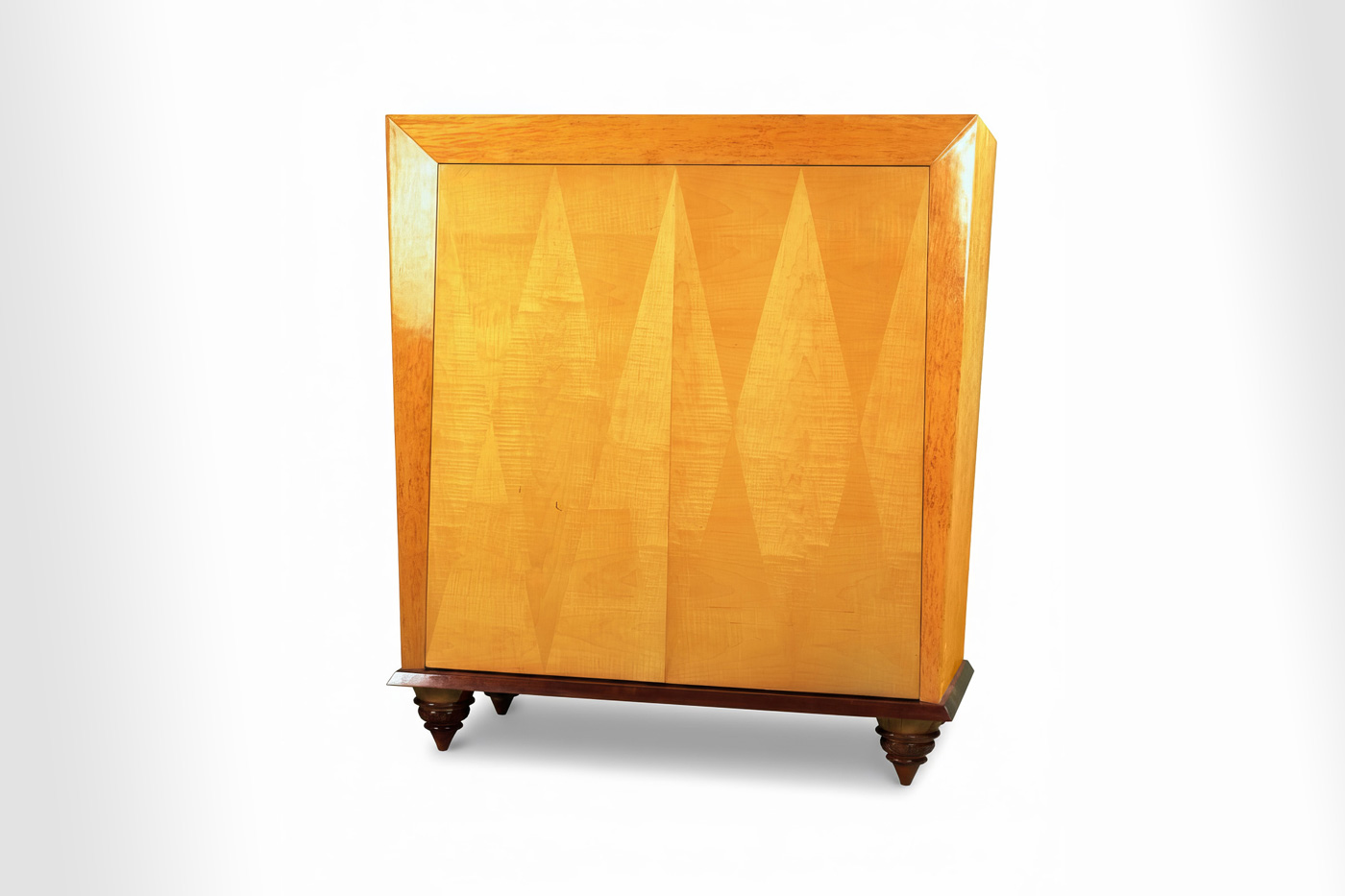 Avant Gard Diamond Armoire in Karelian Burl, Curly Maple and Mahogany with dual wood custom turned feet.