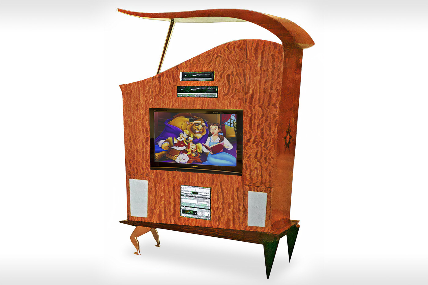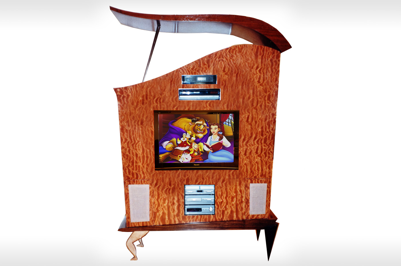 Little Maestro Audio Video Armoire crafted in exotic Bubinga and Rosewood veneers featuring the functioning pianoesque lift top for the subwoofer, two vertical storage drawers and whimsical custom metal feet