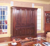 Family Room Multi Purpose TV Armoire with bi-fold pocket doors, and left and right pilasters which open to provide additional hidden storage.