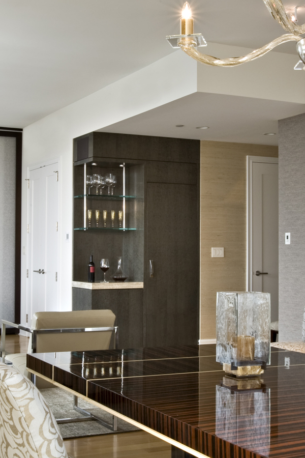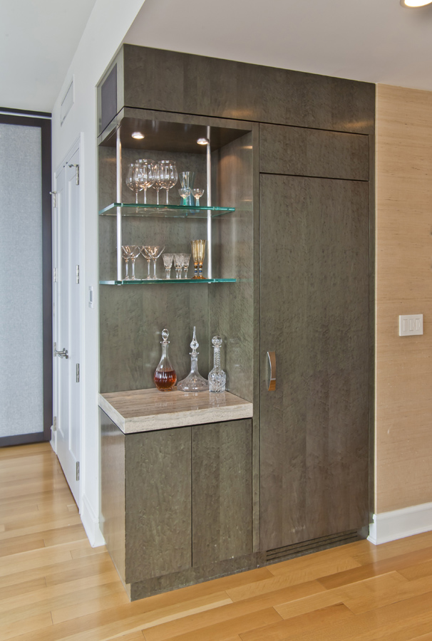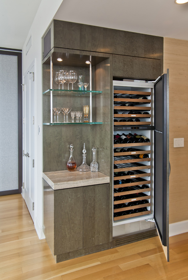 Contemporary Bar Cabinetry In Tabu Veneer featuring suspended glass shelving with steel rod supports and concealed Sub Zero Wine Refrigerator.