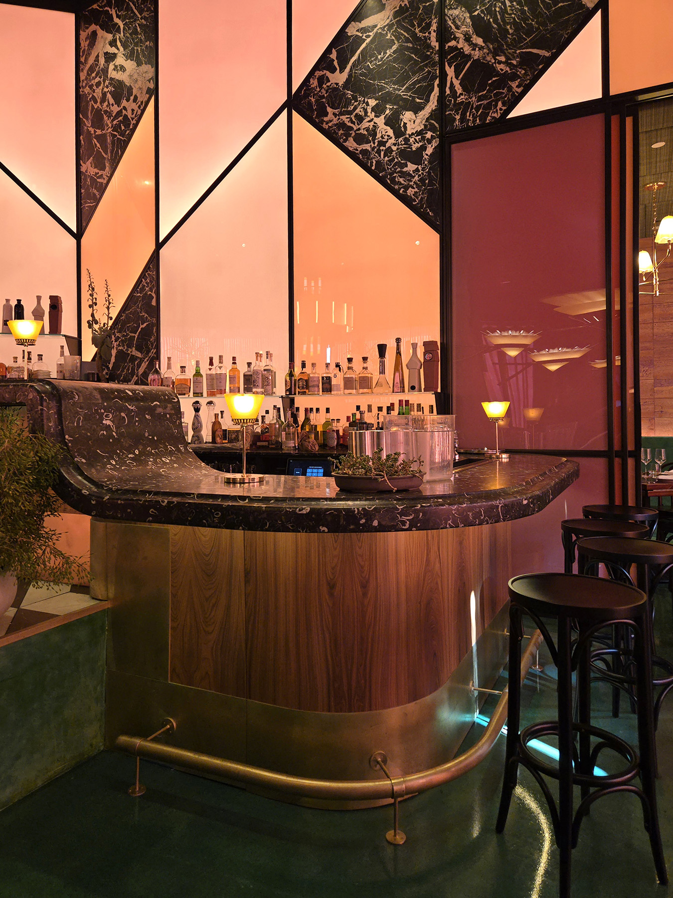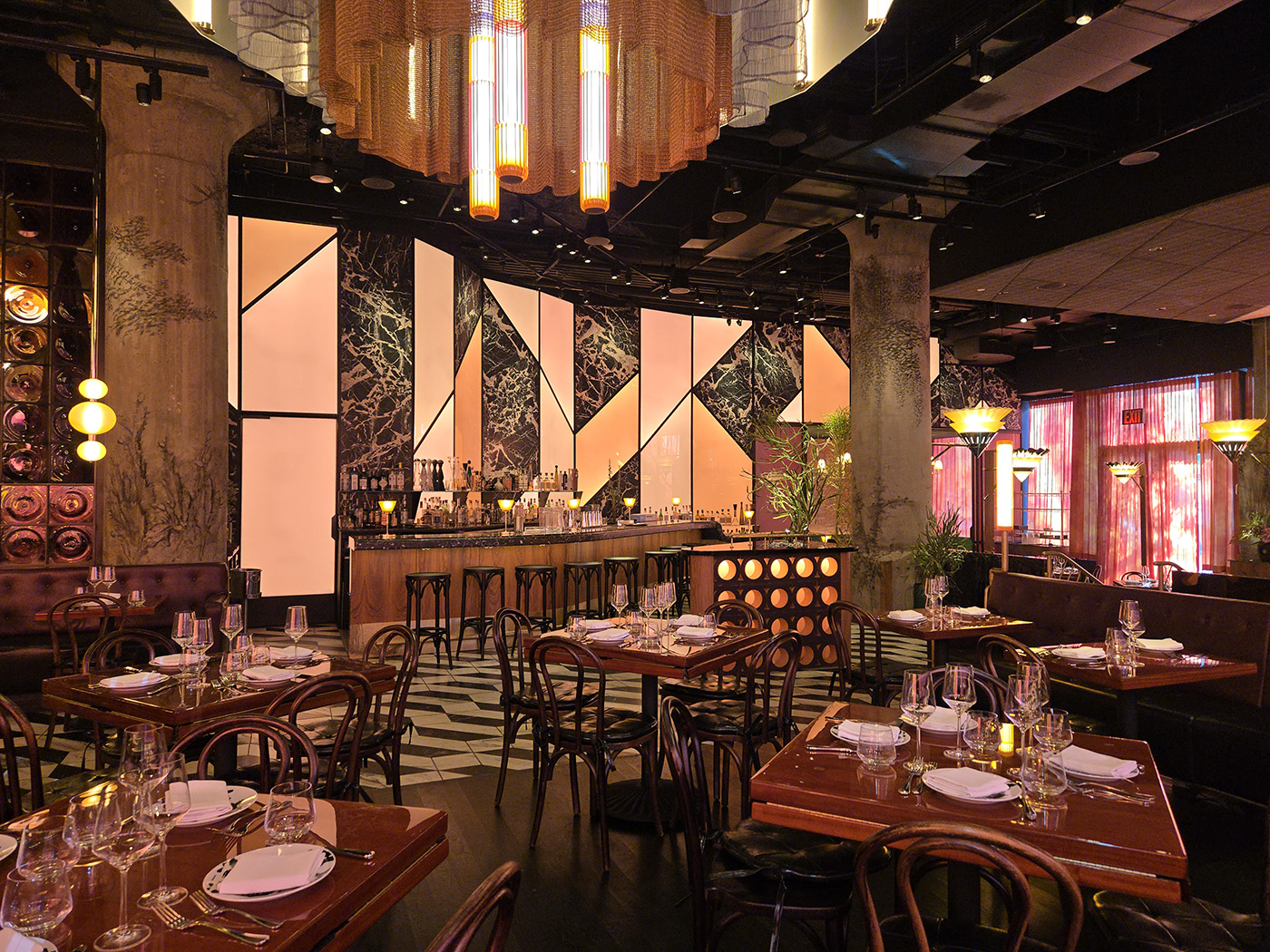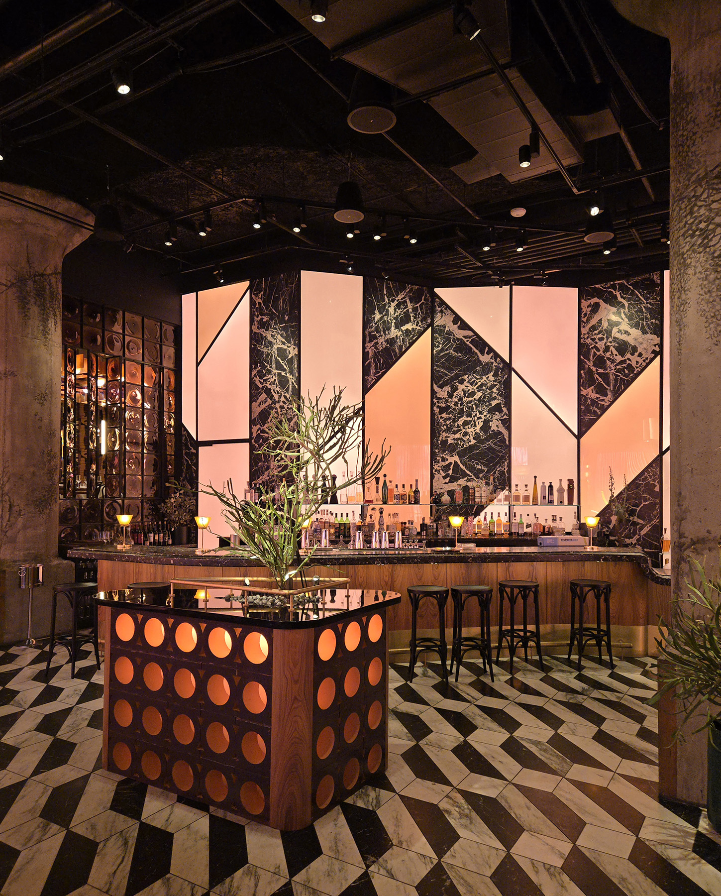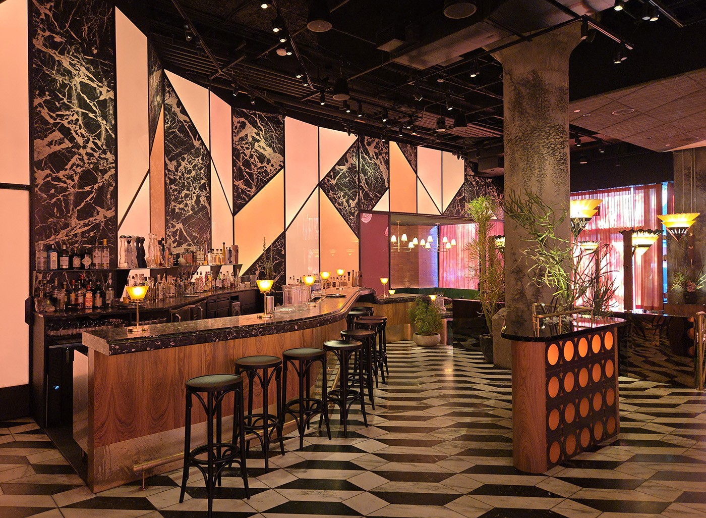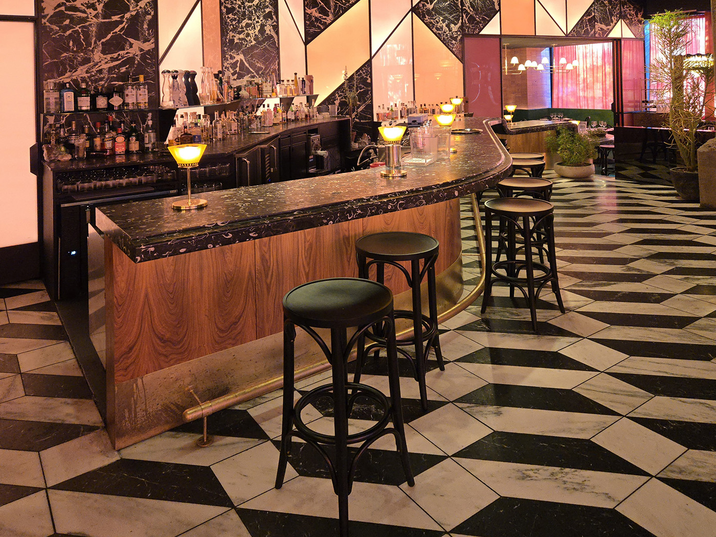 This long and exquisite restaurant bar is fabricated in Sequenced Matched Walnut, curves gently and then the stone countertop waterfalls down to a lower level. To the rear of the bar, above the required professionally specified cabinetry and liquor shelves is an exciting rear illuminated wall with varying shapes of both colored acrylic and stone set in custom fabricated Blackened Steel Framing.