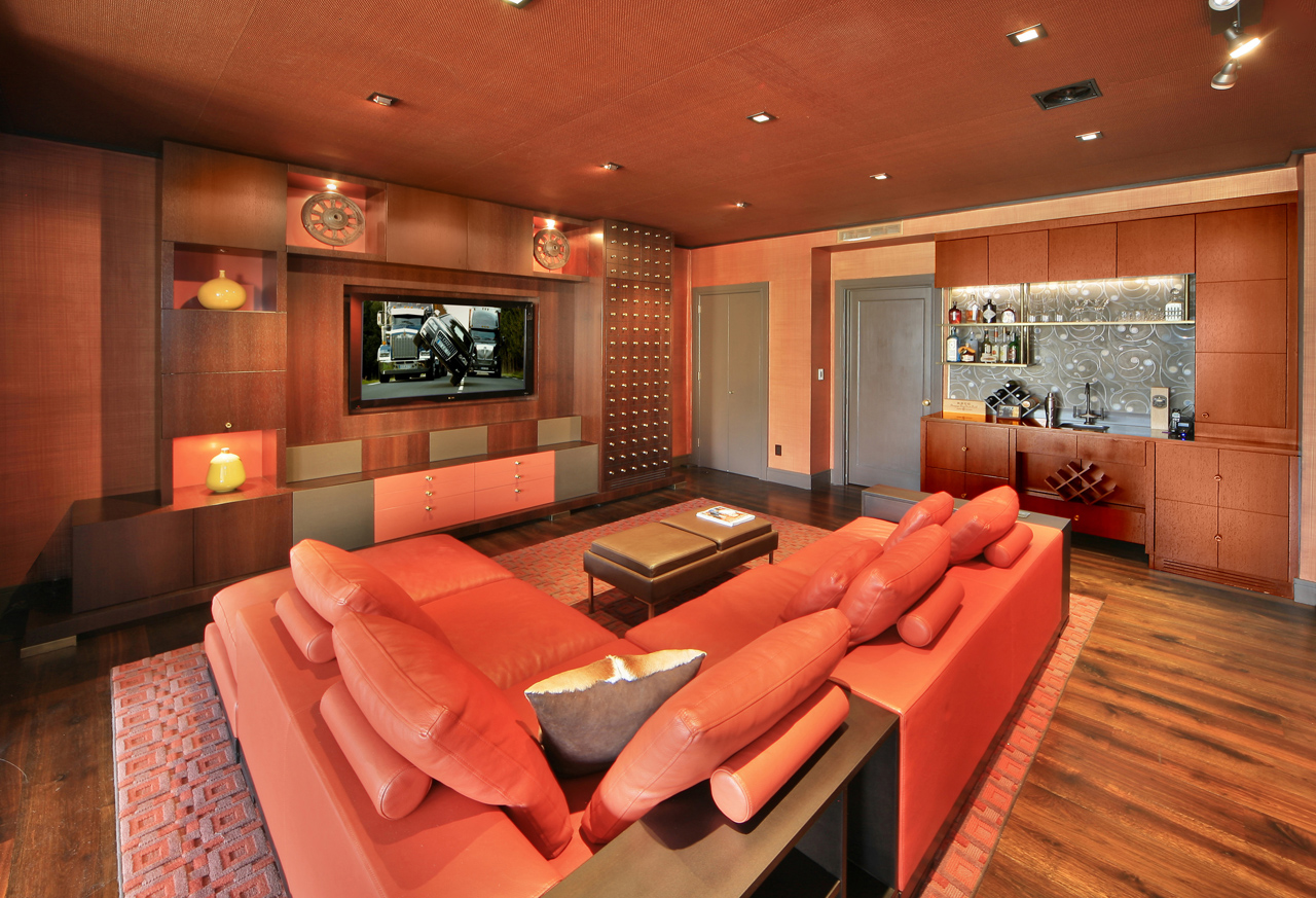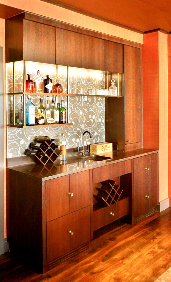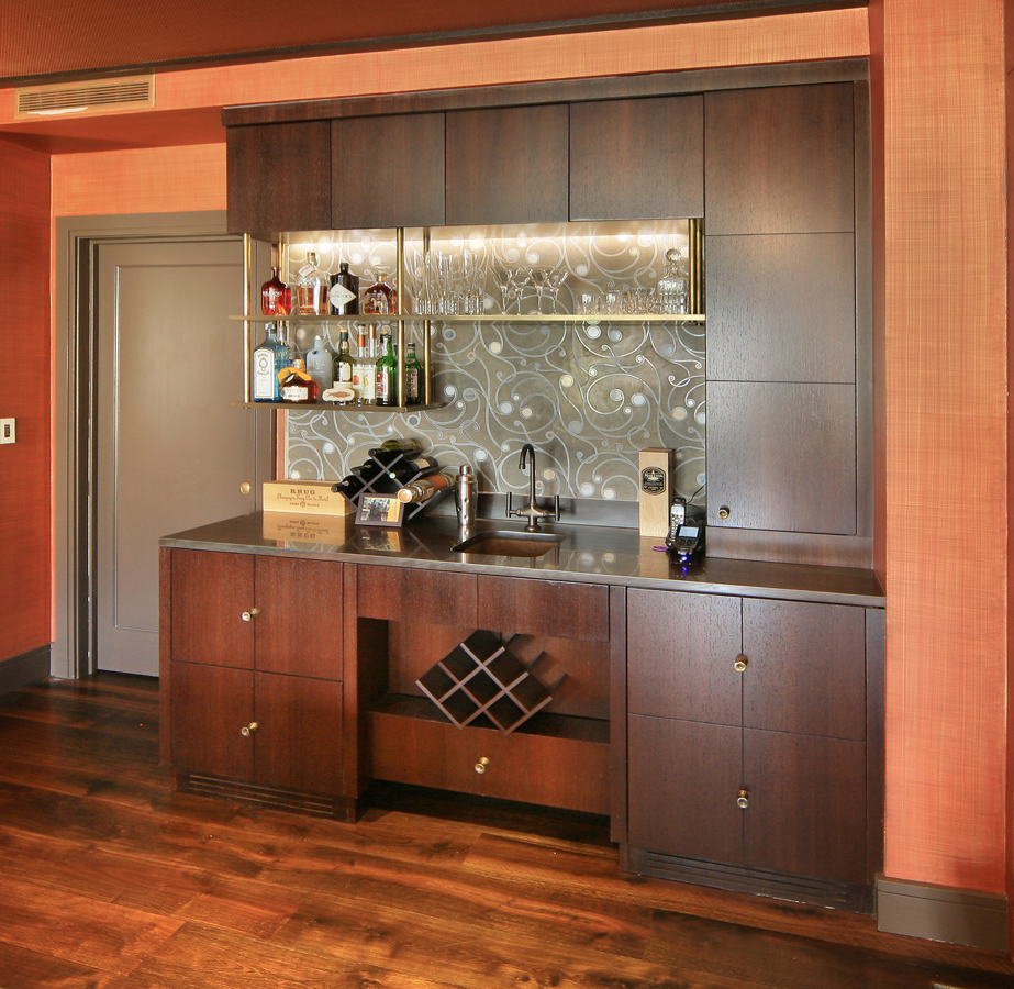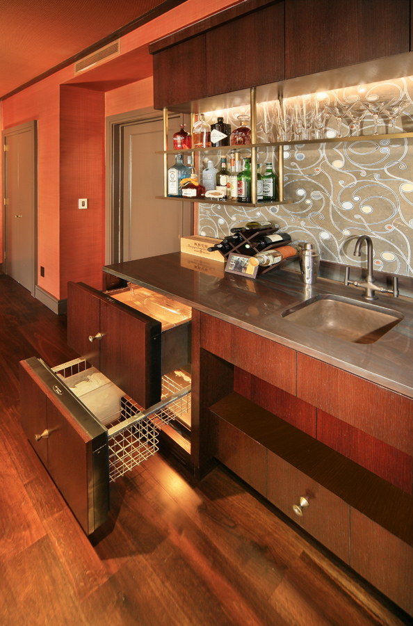 Stained Mahogany And Bronze Bar Design with floating shelves, storage and concealed refrigerated beverage center and dishwasher.