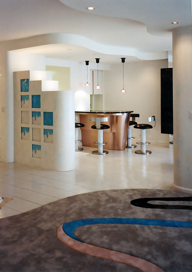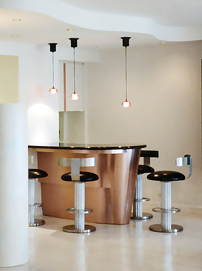 Modern Metallic Bar Design with step down rear counter and compartmentalized drawers for glasses and liquor.