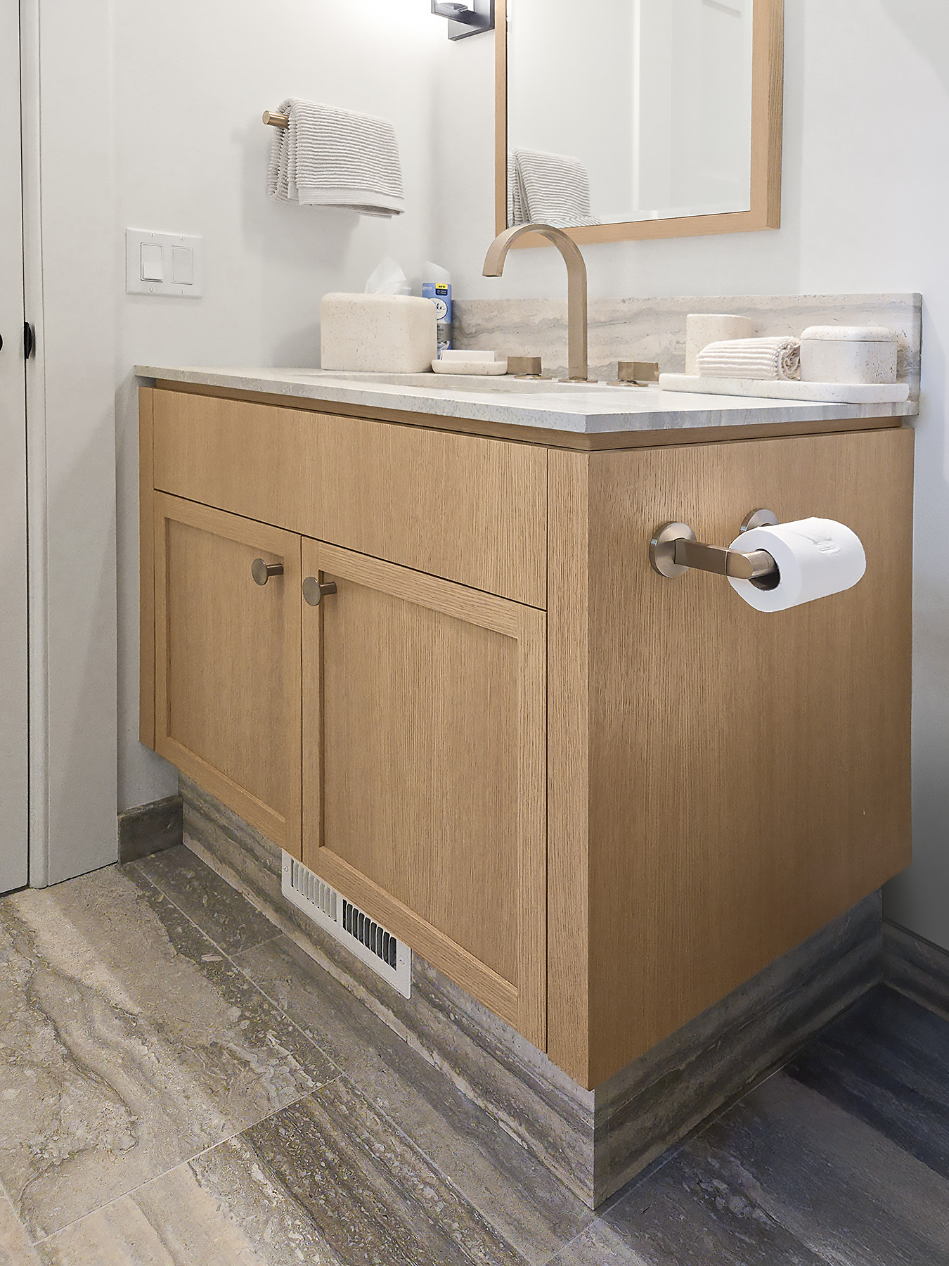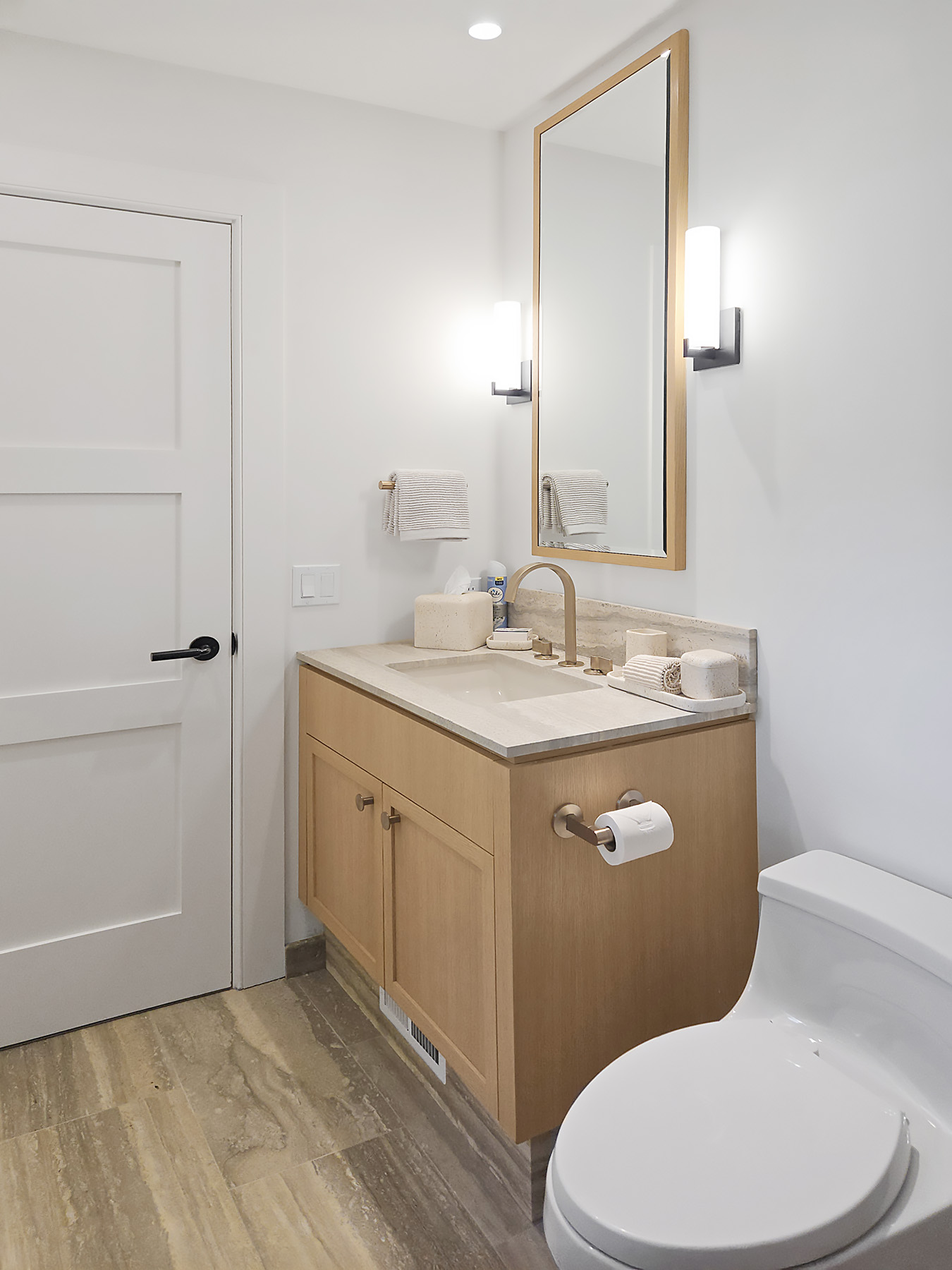Simple, yet elegant, this modern Guest Bathroom White Oak Vanity is impeccably installed with a toe space heater set in a stone base and also features a mirror with a micro frame in the same White Oak.