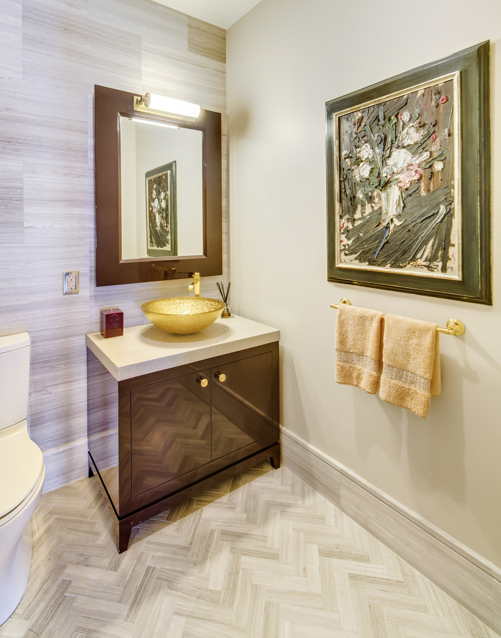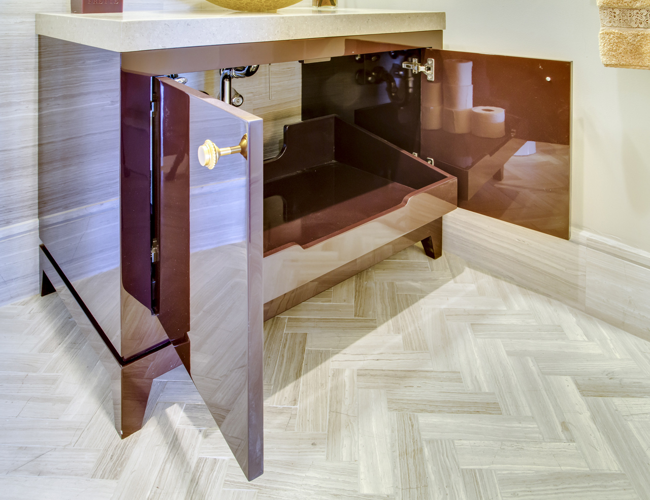 This high gloss plumb colored vanity with gold glass vessel sink and coordinating mirror design demonstrate the simplicity of modern elegance.