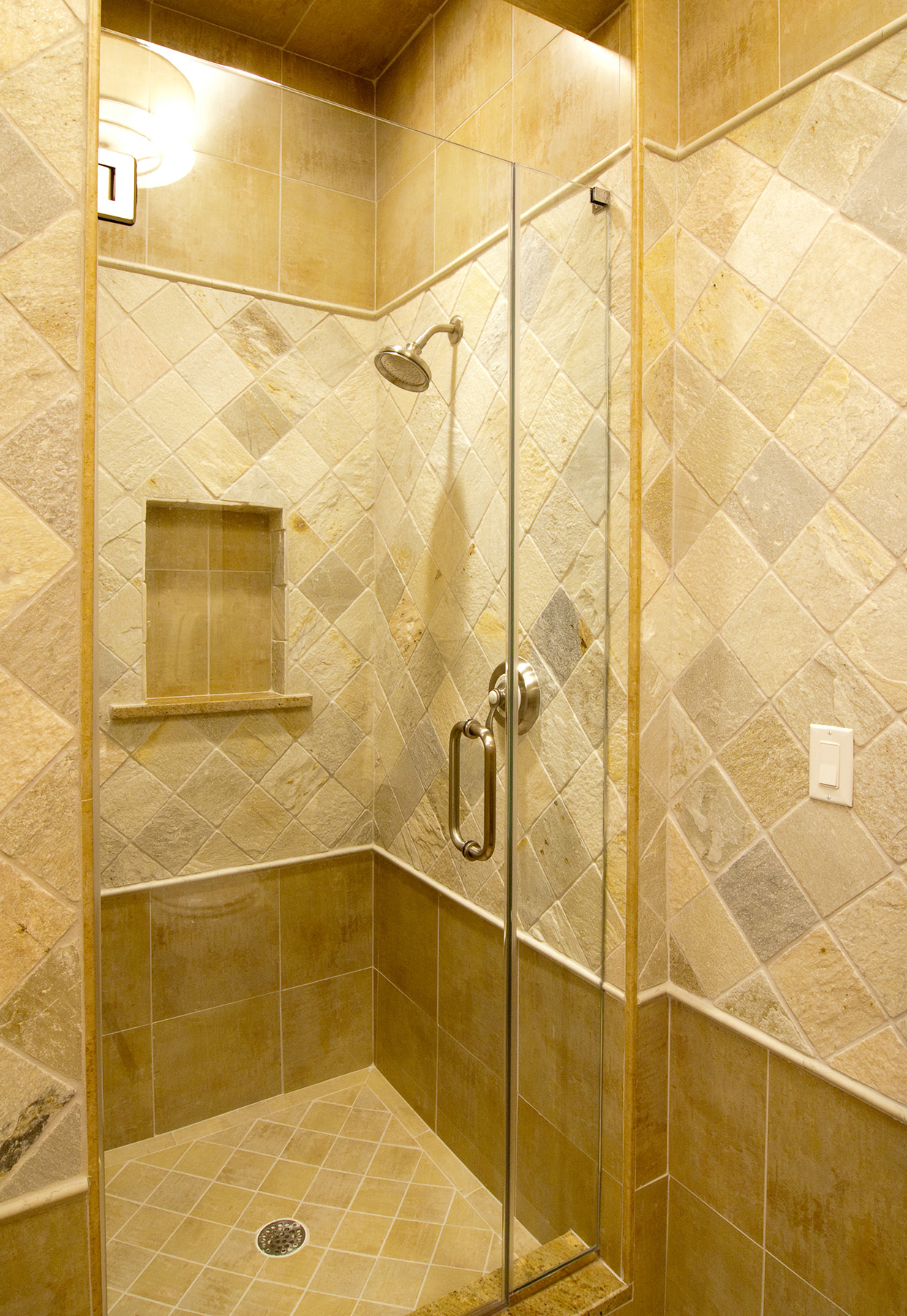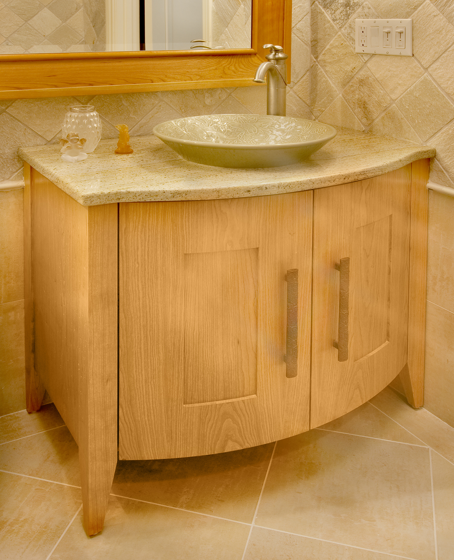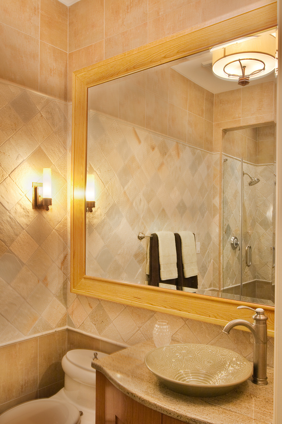 Transitional Bathroom Bathroom Design with vessel sink, custom Cherry vanity and picture frame mirror.