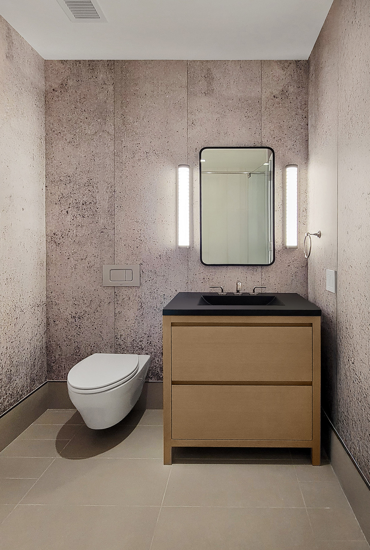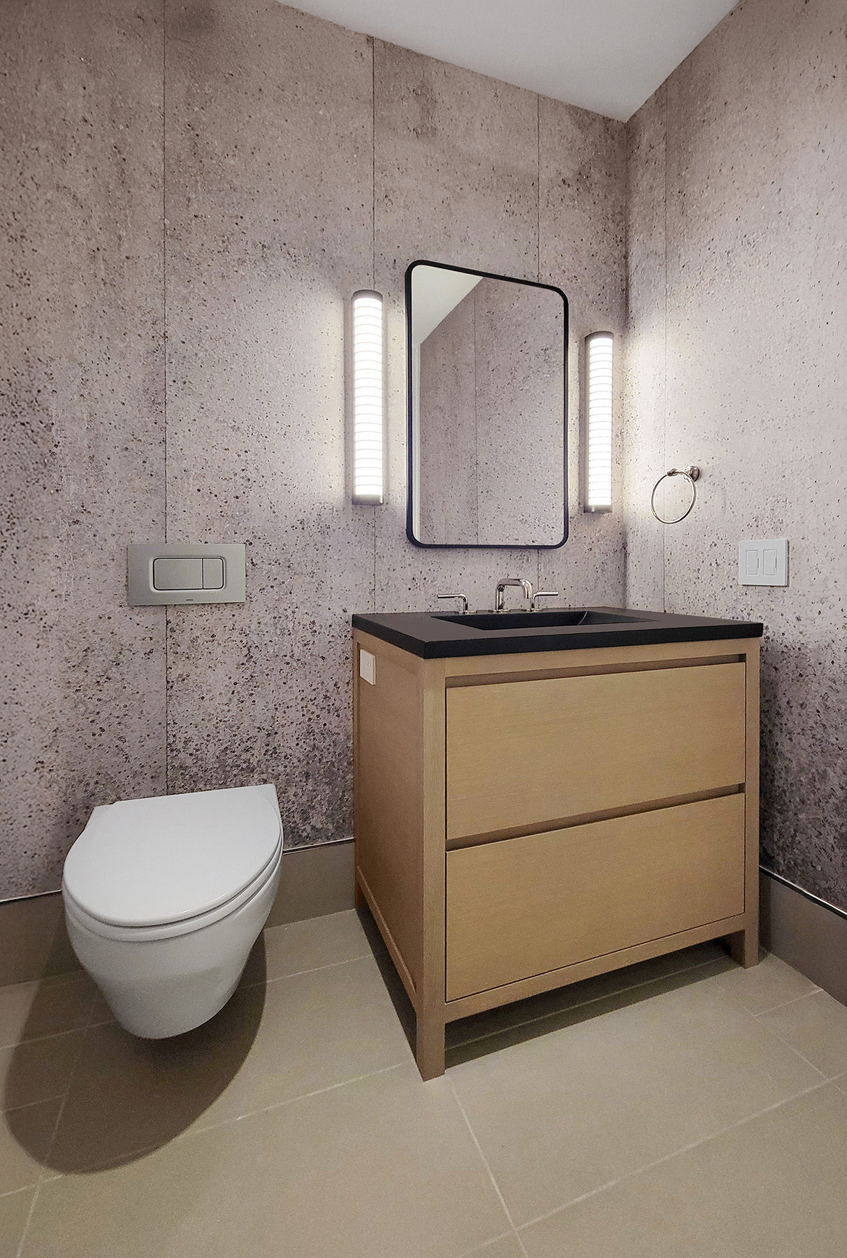This Parson Style Vanity with Two Large Drawers is finished in Stained White Oak and flows seamlessly in this modern bathroom.