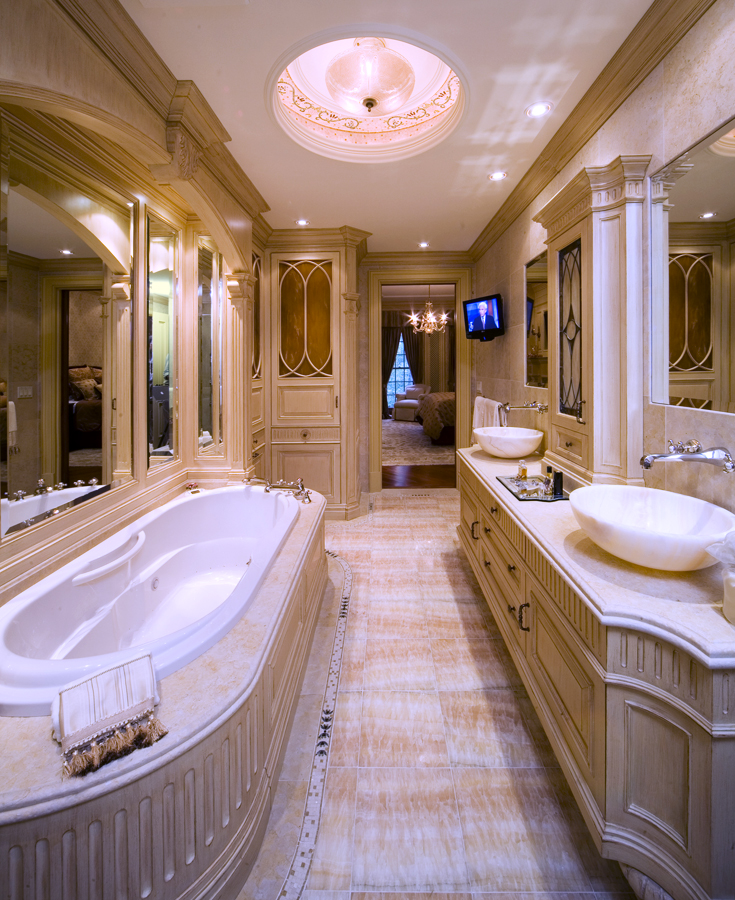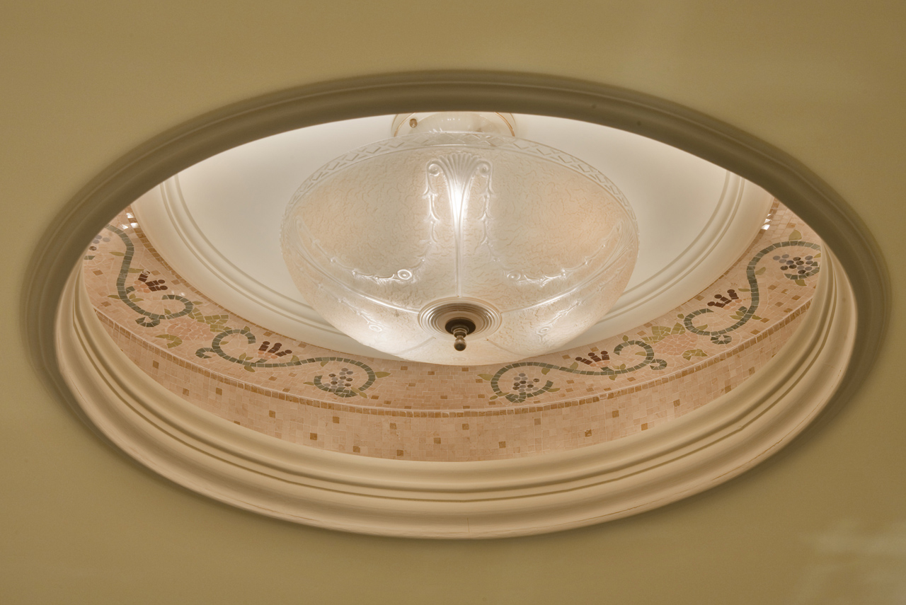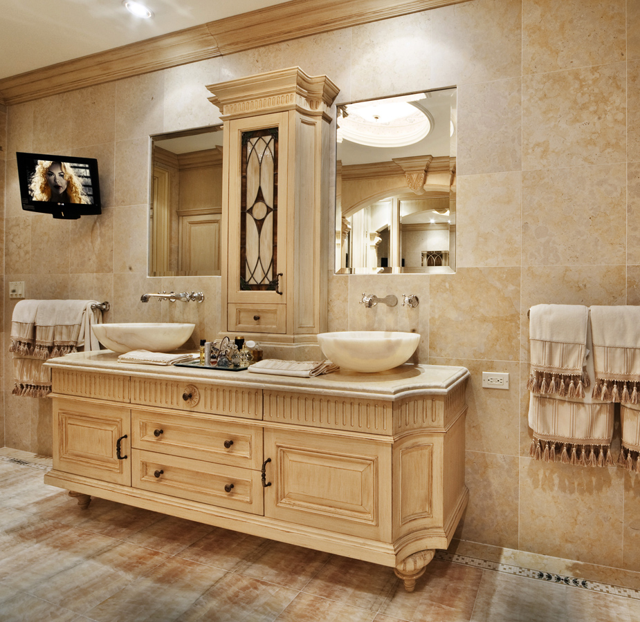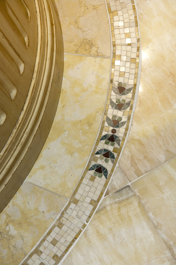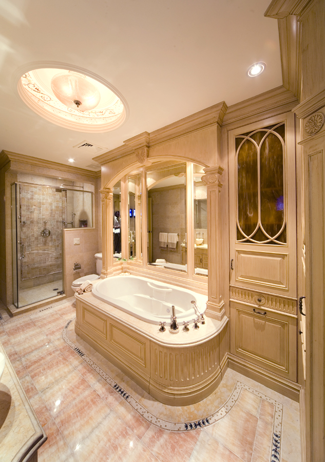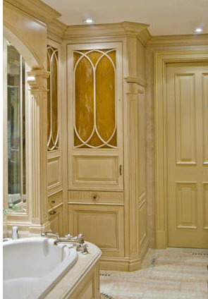 Classic Brownstone Bathroom in glazed antique finish with stained glass, and custom carved and turned details paired with mosaic tile inlays.