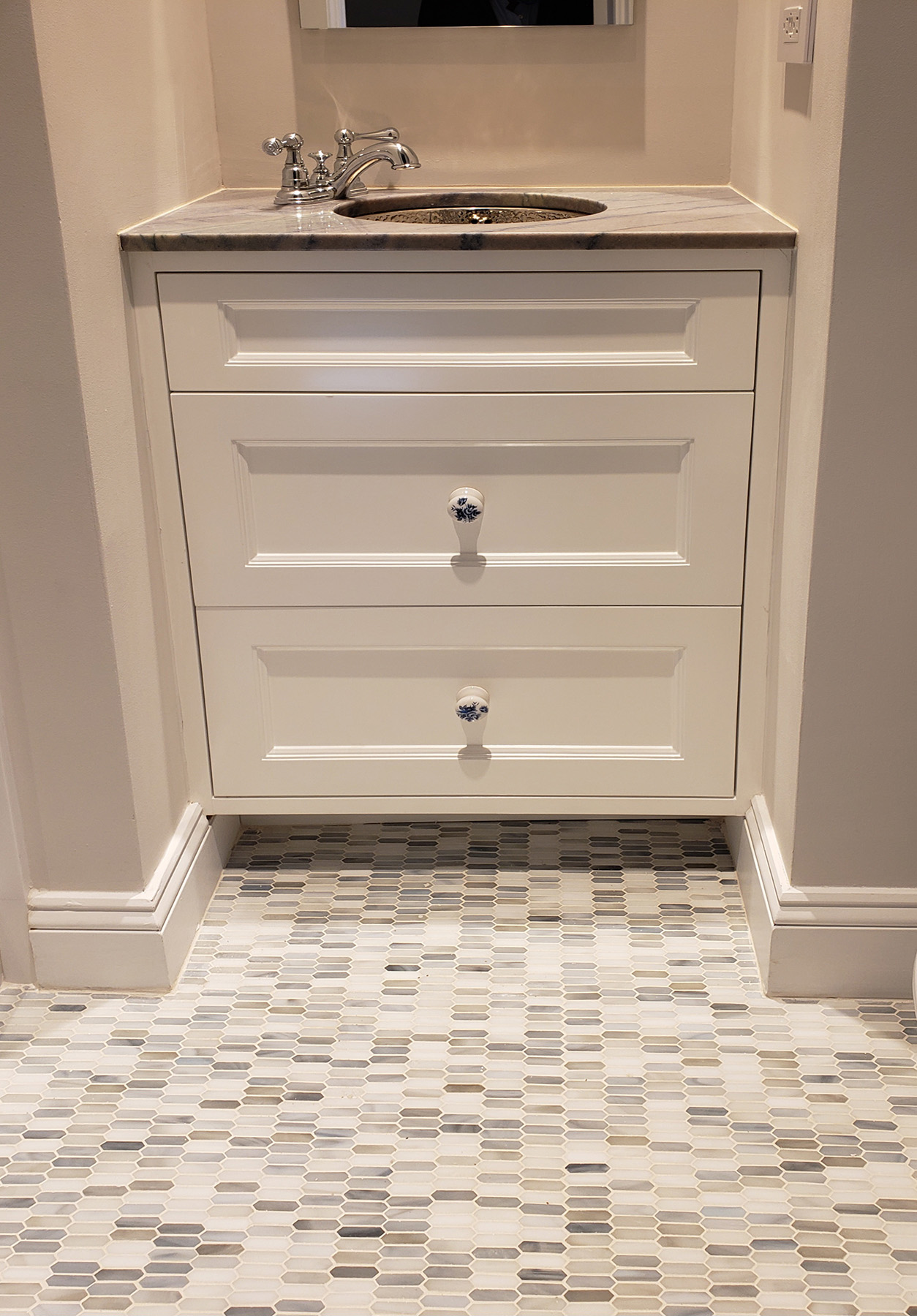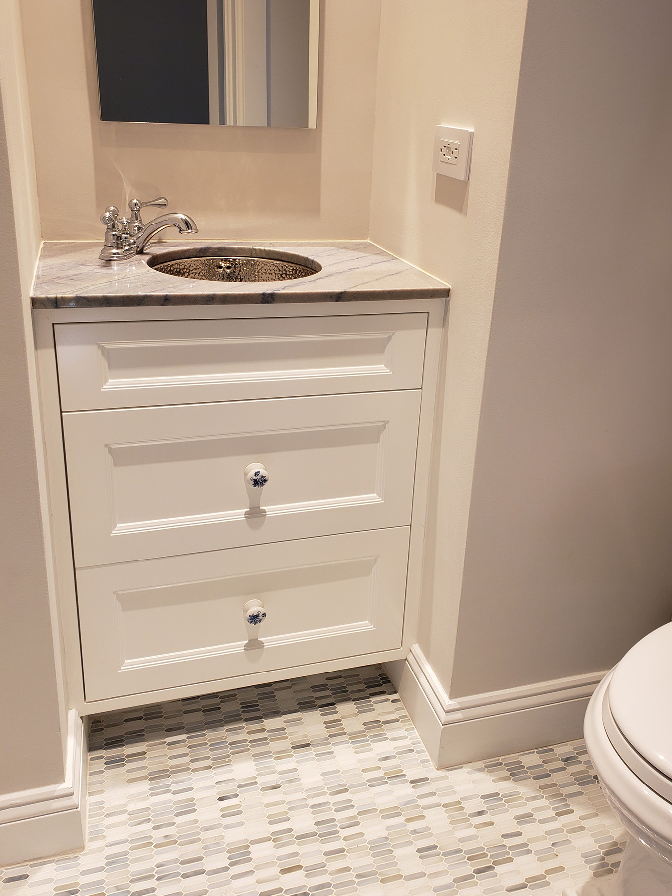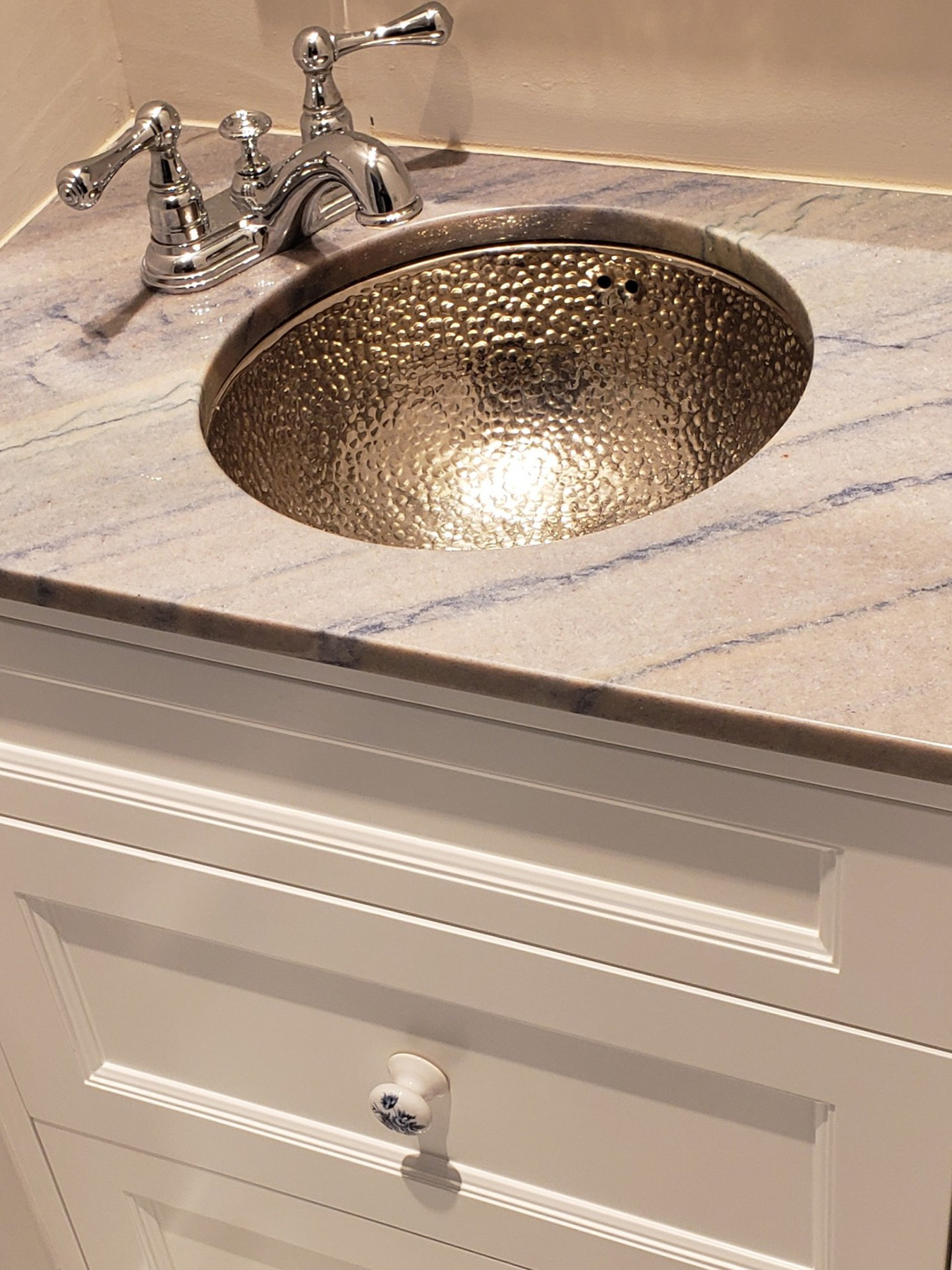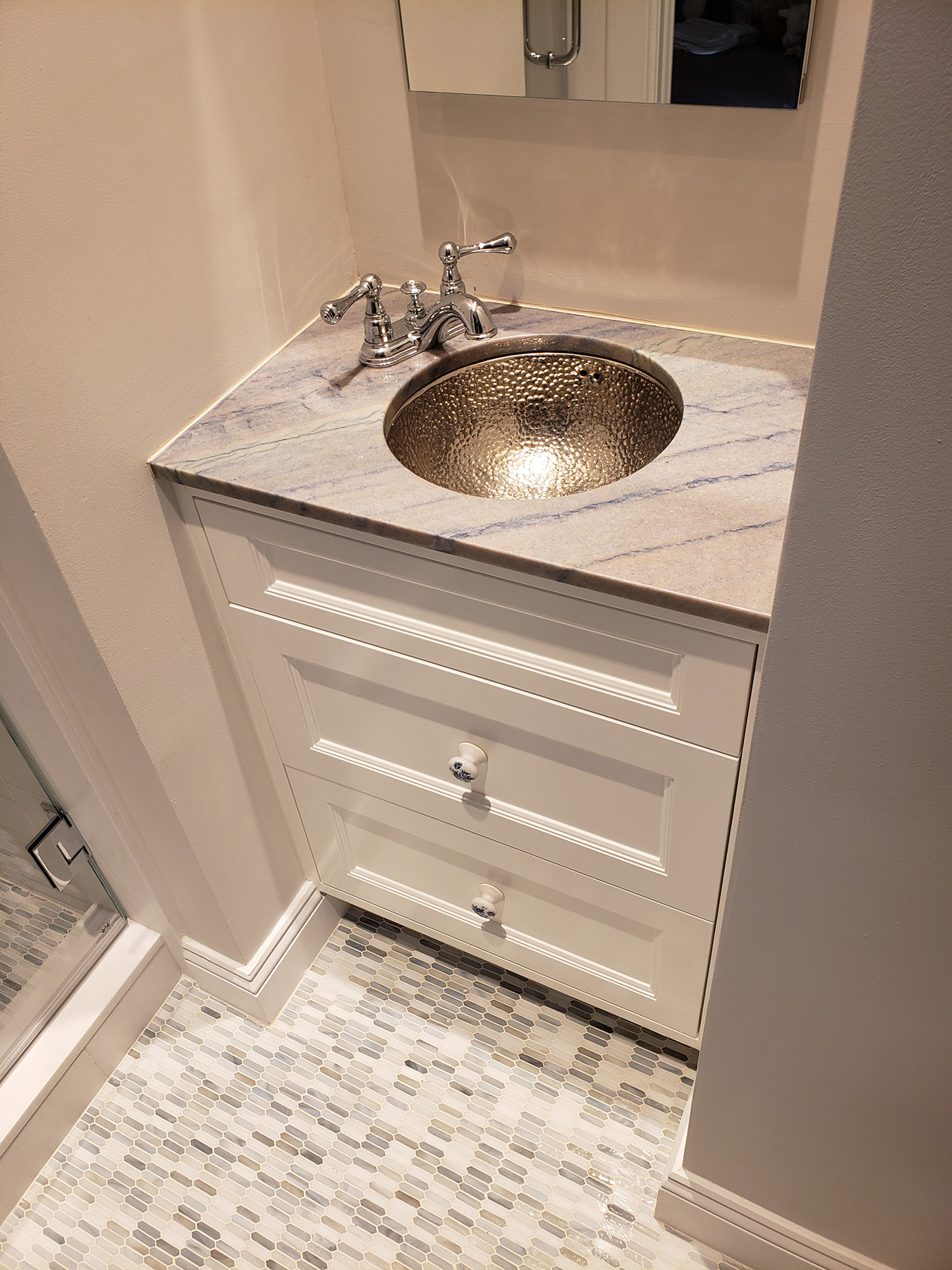 This Fine Traditional Floating Vanity Cabinet is nestled in a tight alcove and still looks quite elegant with three recessed panel drawers and a hammered metal sink.