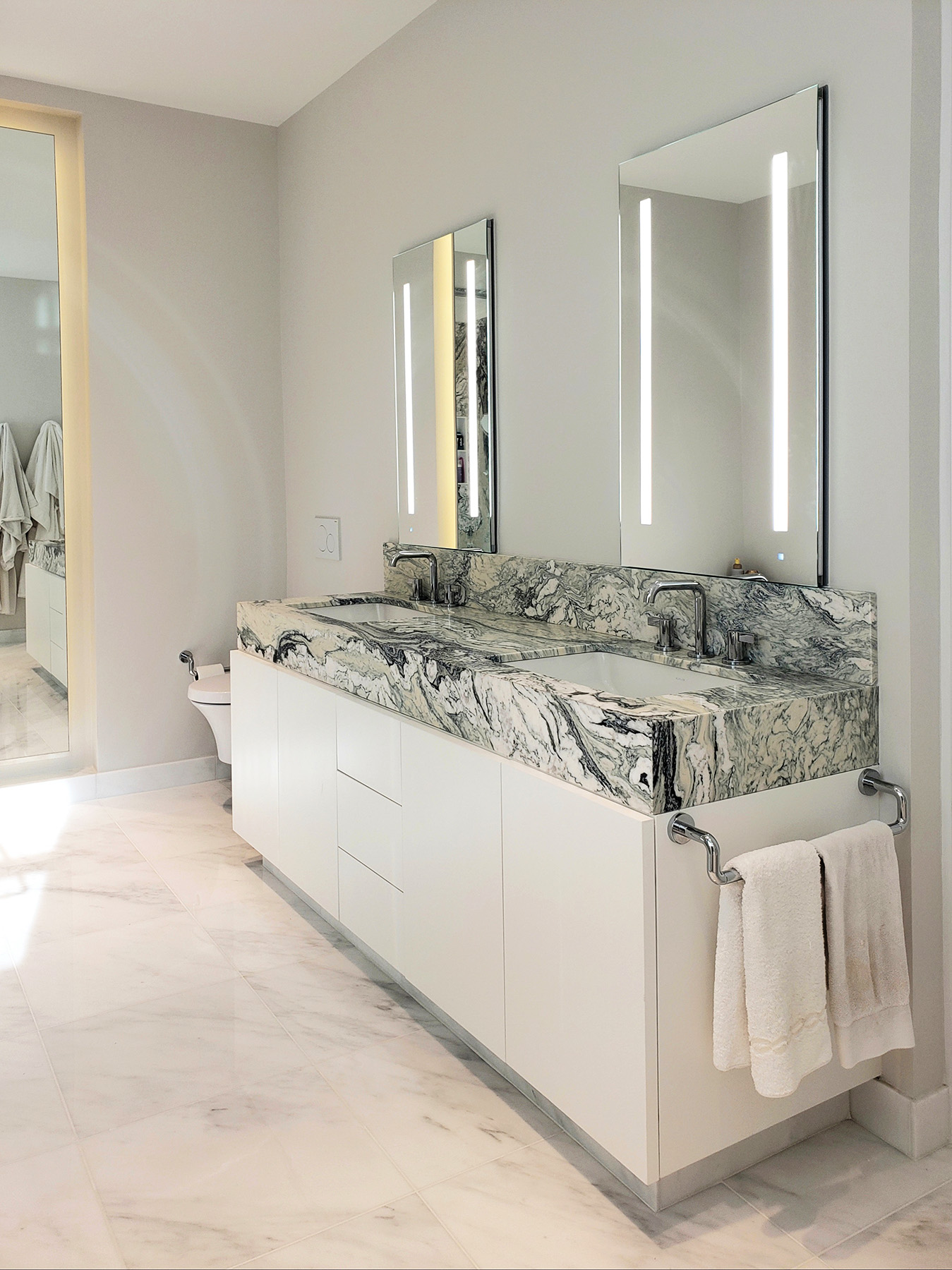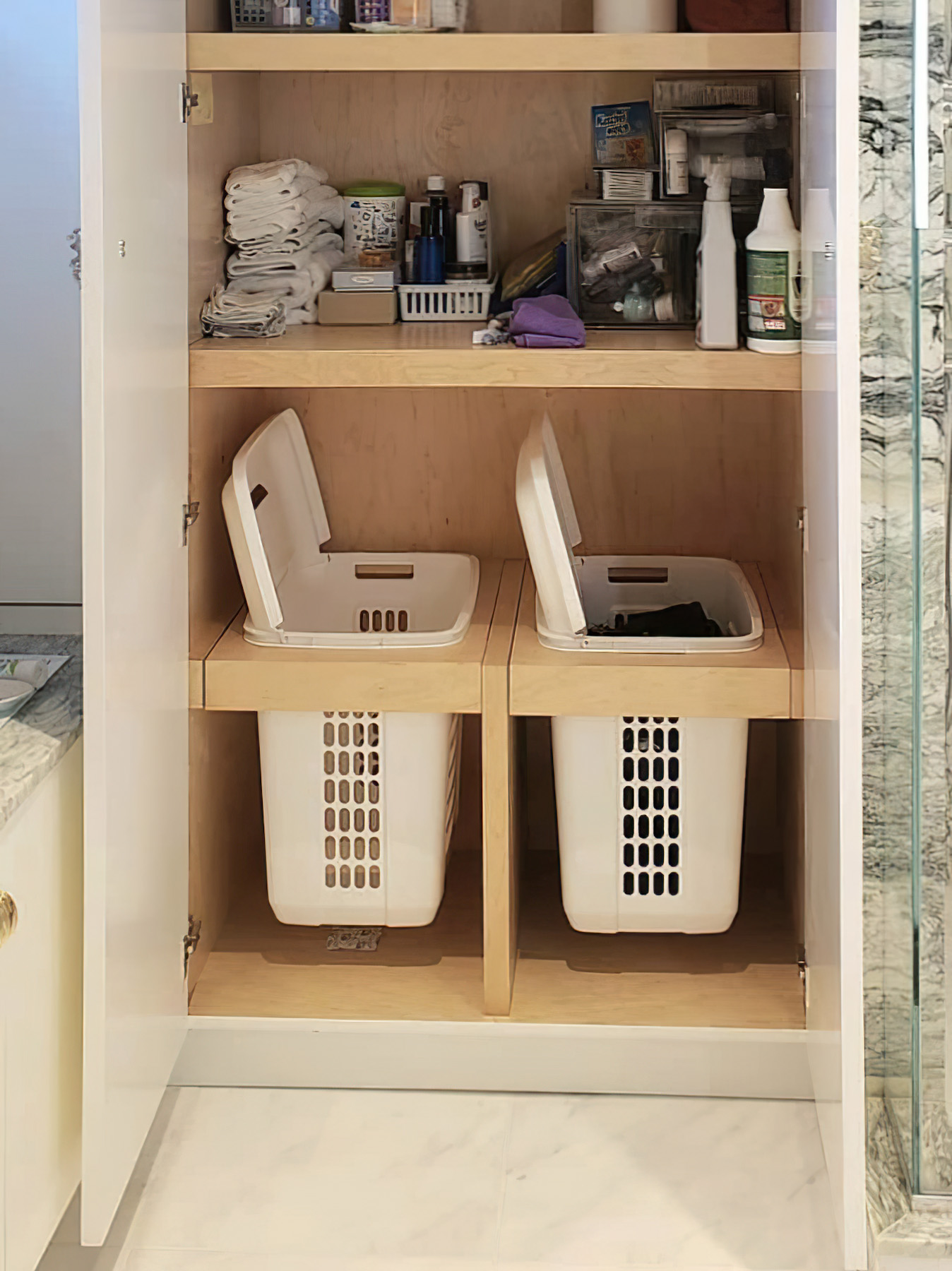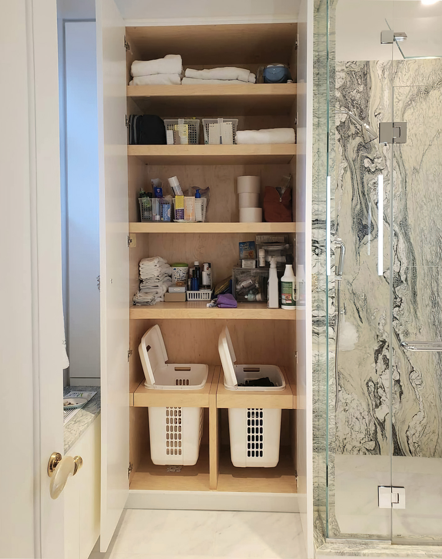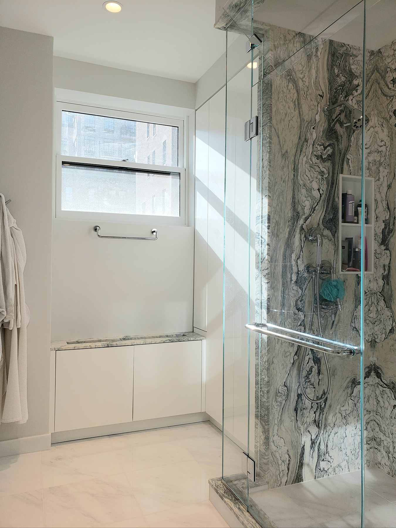 Our Custom Millwork in this Modern, Serene Master Bathroom include the Dual Vanity, the Radiator Cover and the Adjacent Corner Built-In with His and Her Pull-Out Laundry Hampers and Shelving for Towels and Other Necessities.