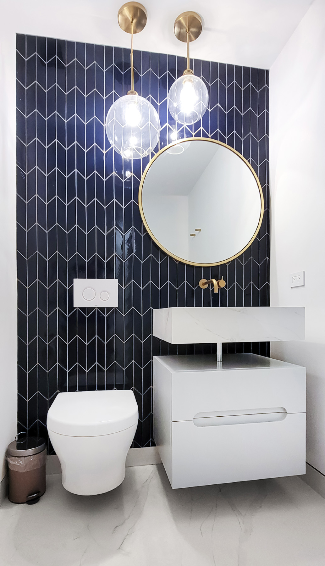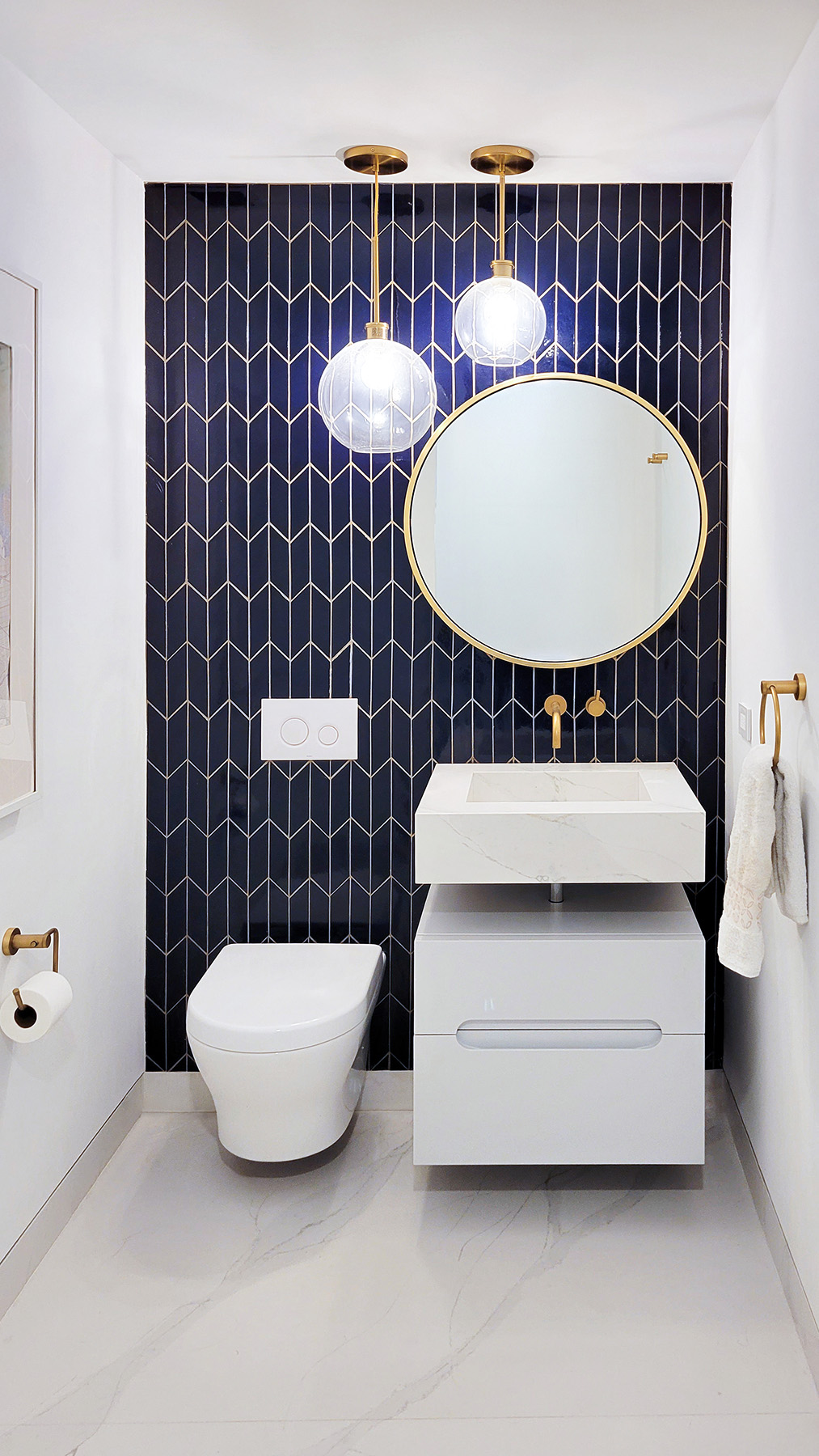 Modern Macassar Ebony & Corian Bathroom Design with built-in 3-way mirrored medicine chest blended with white porcelain and stainless steel accents.