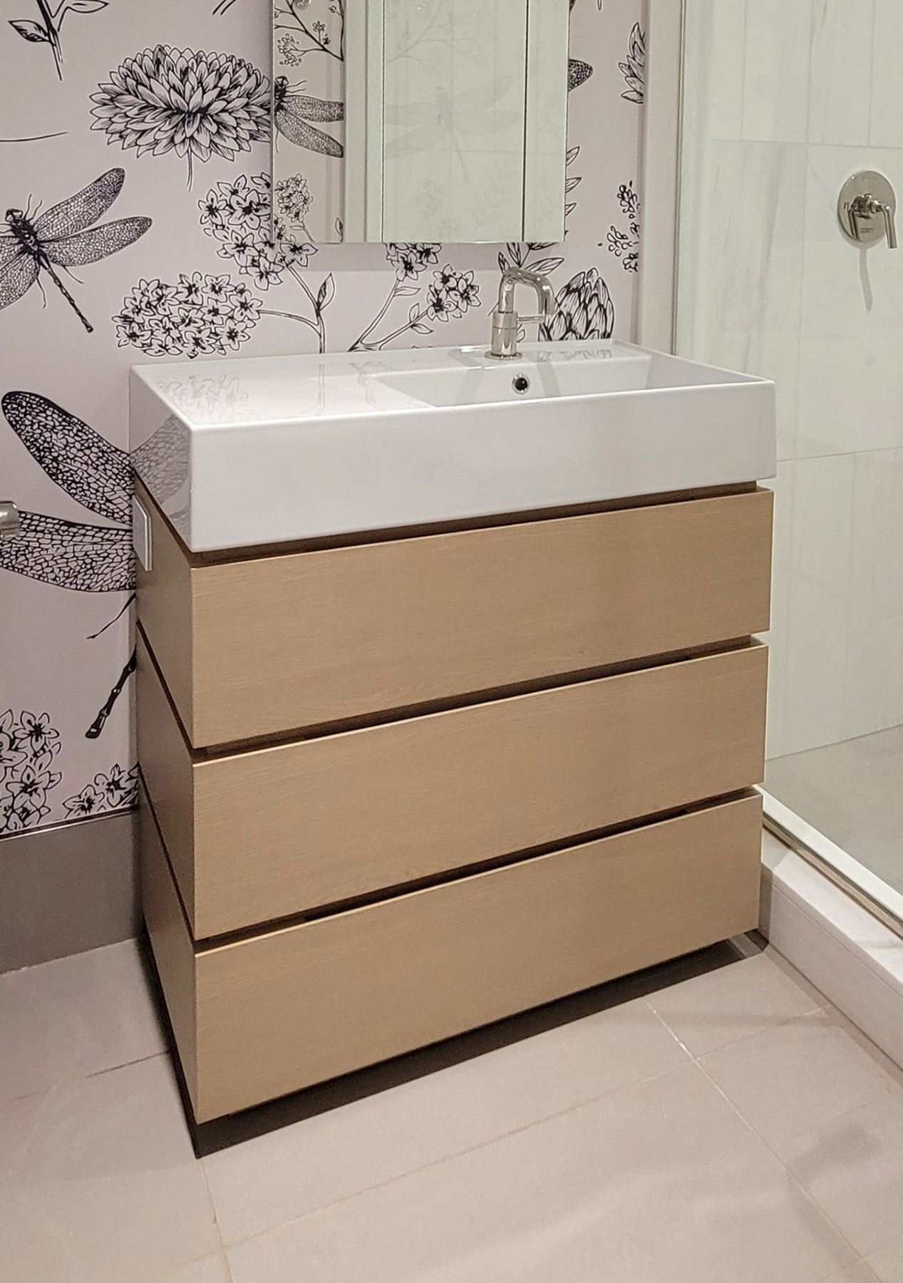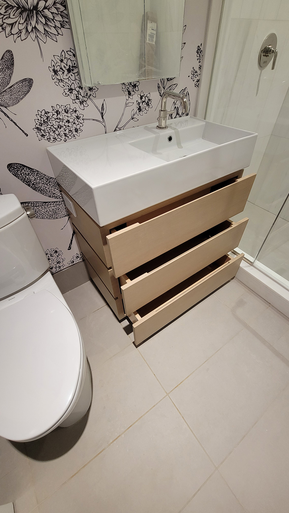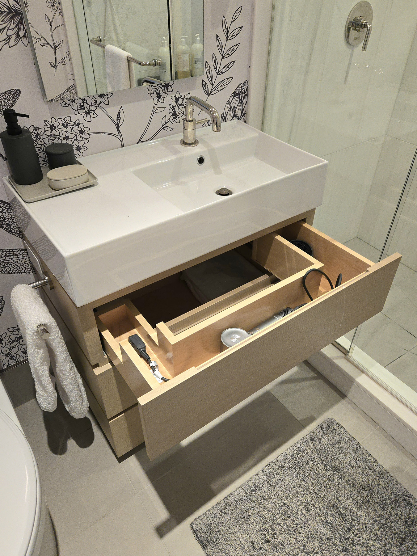 This Three Drawer White Oak Vanity features a Wrap-Around Reveal Design and provides Three Drawers with Integrated Contoured Top Center Finger Pulls.