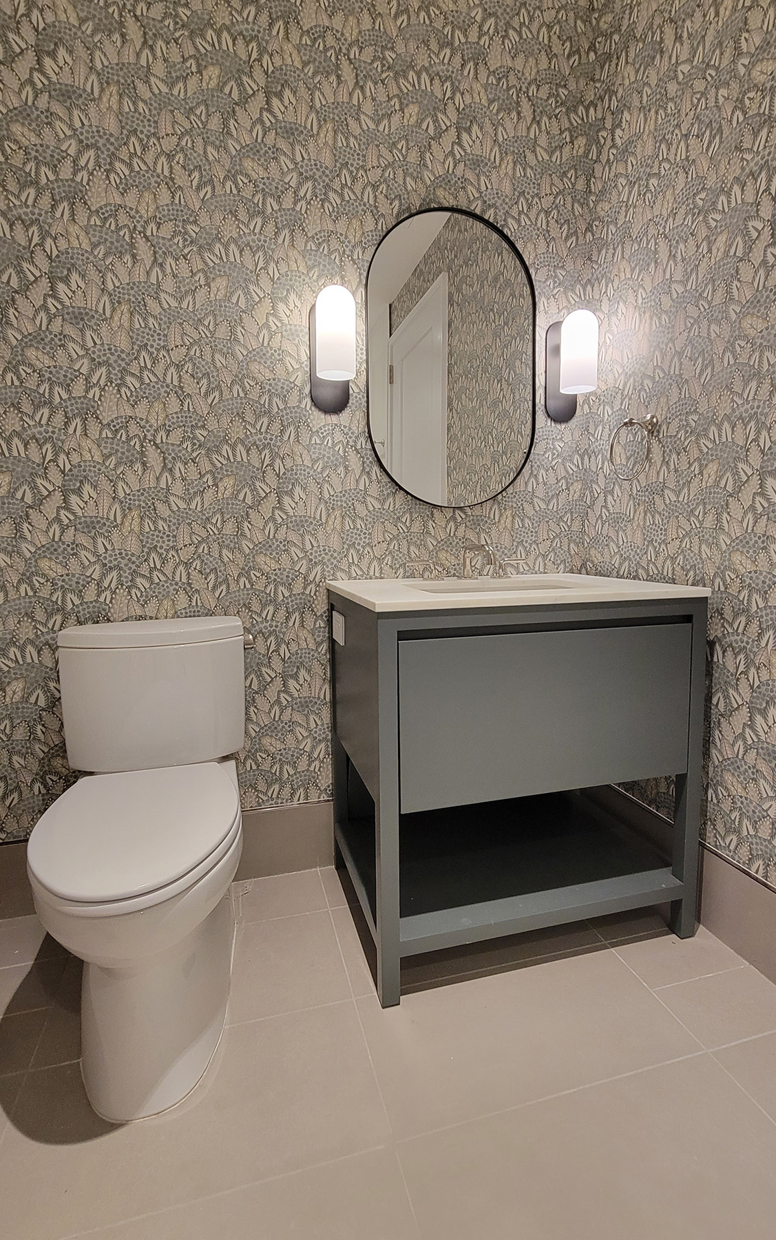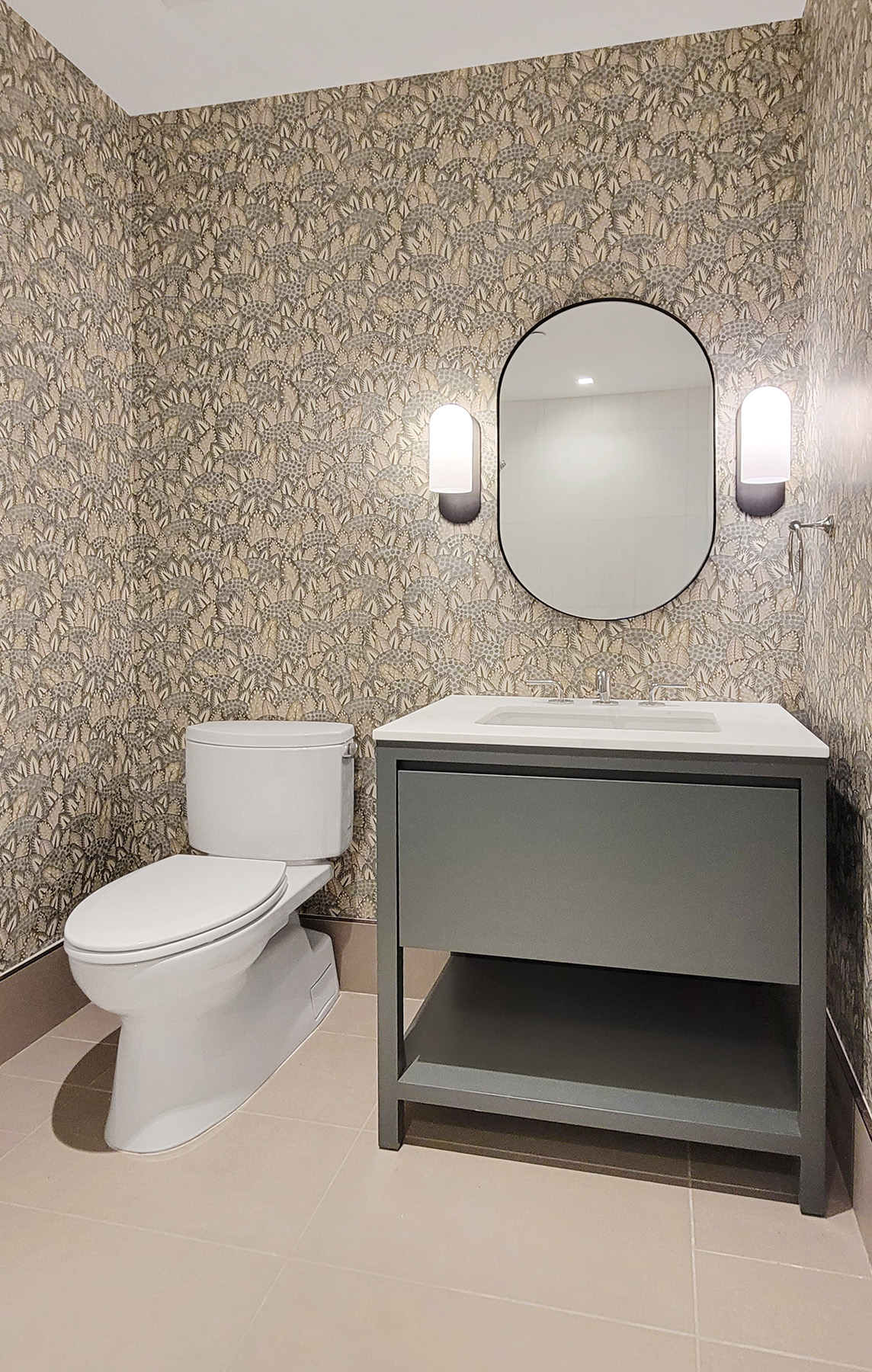 This Transitional Parson Style Vanity, finished in a Matte Grey Lacquer, offers a large drawer with plumbing chase and a lower shelf for towels and supplies.