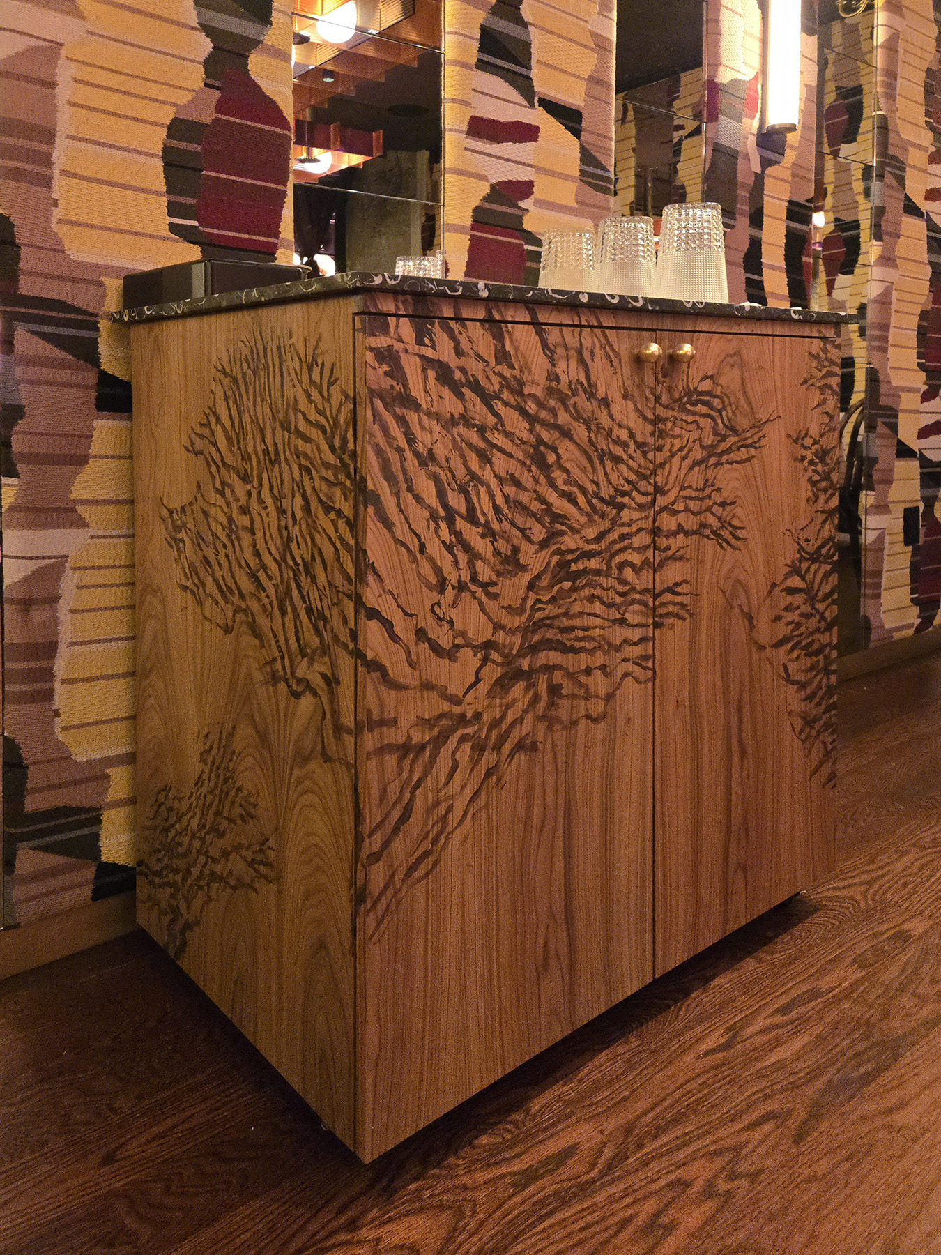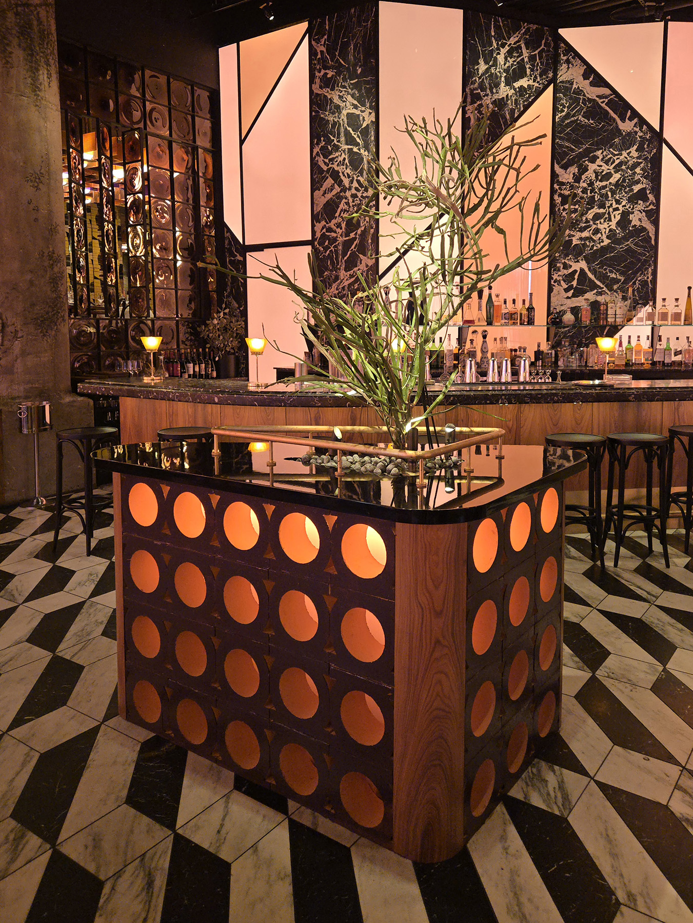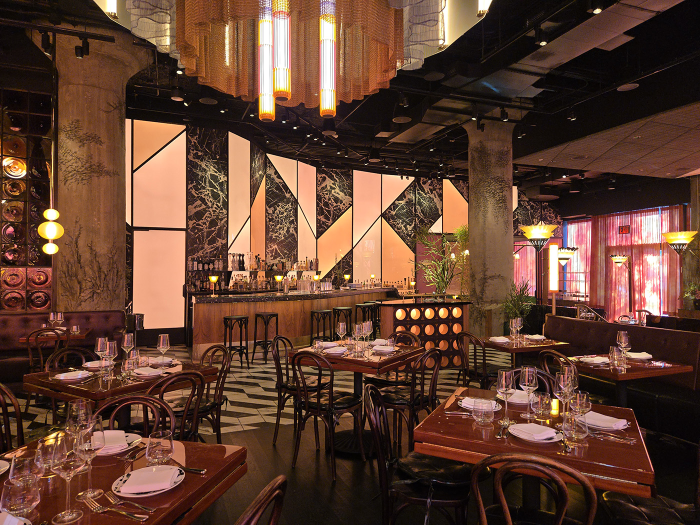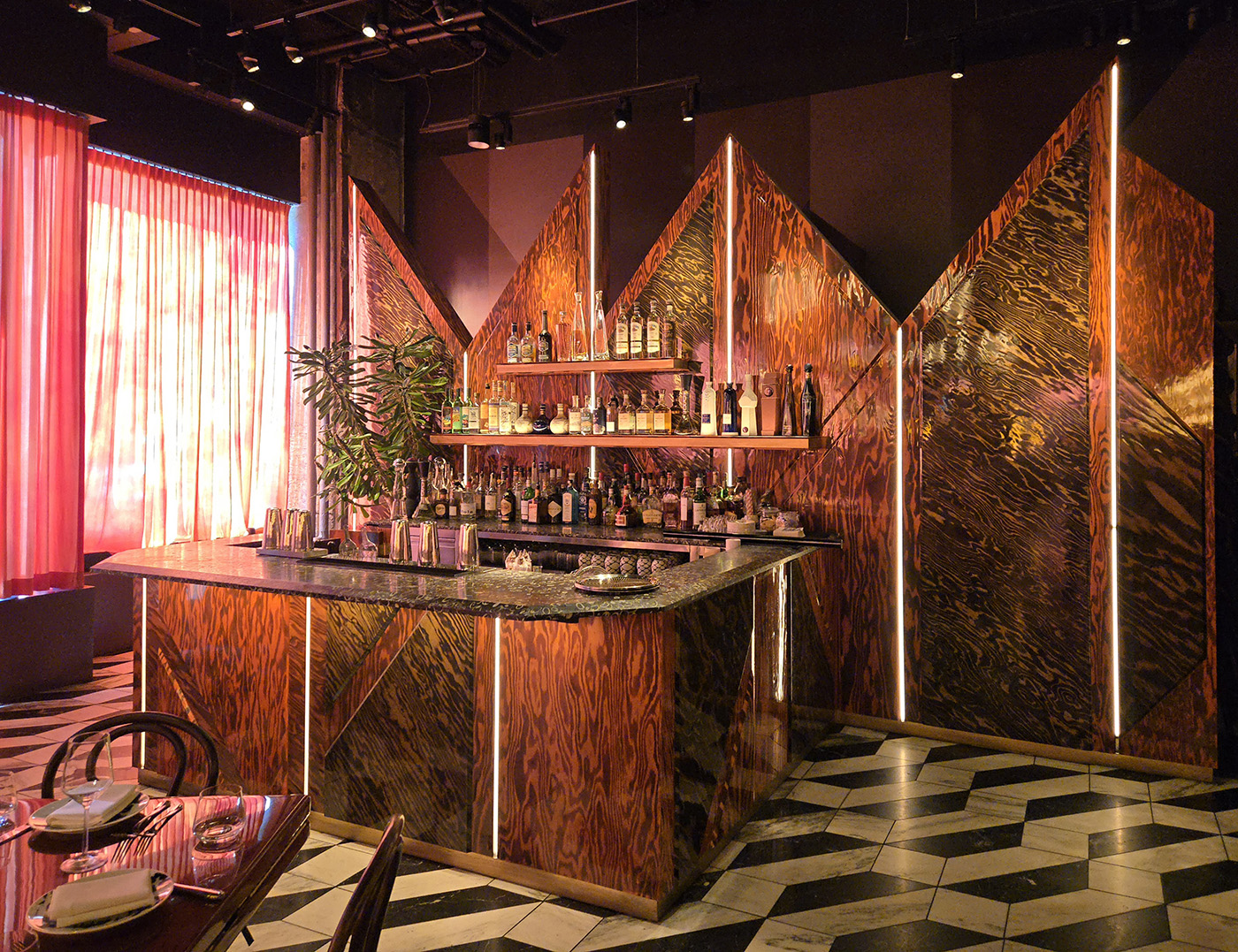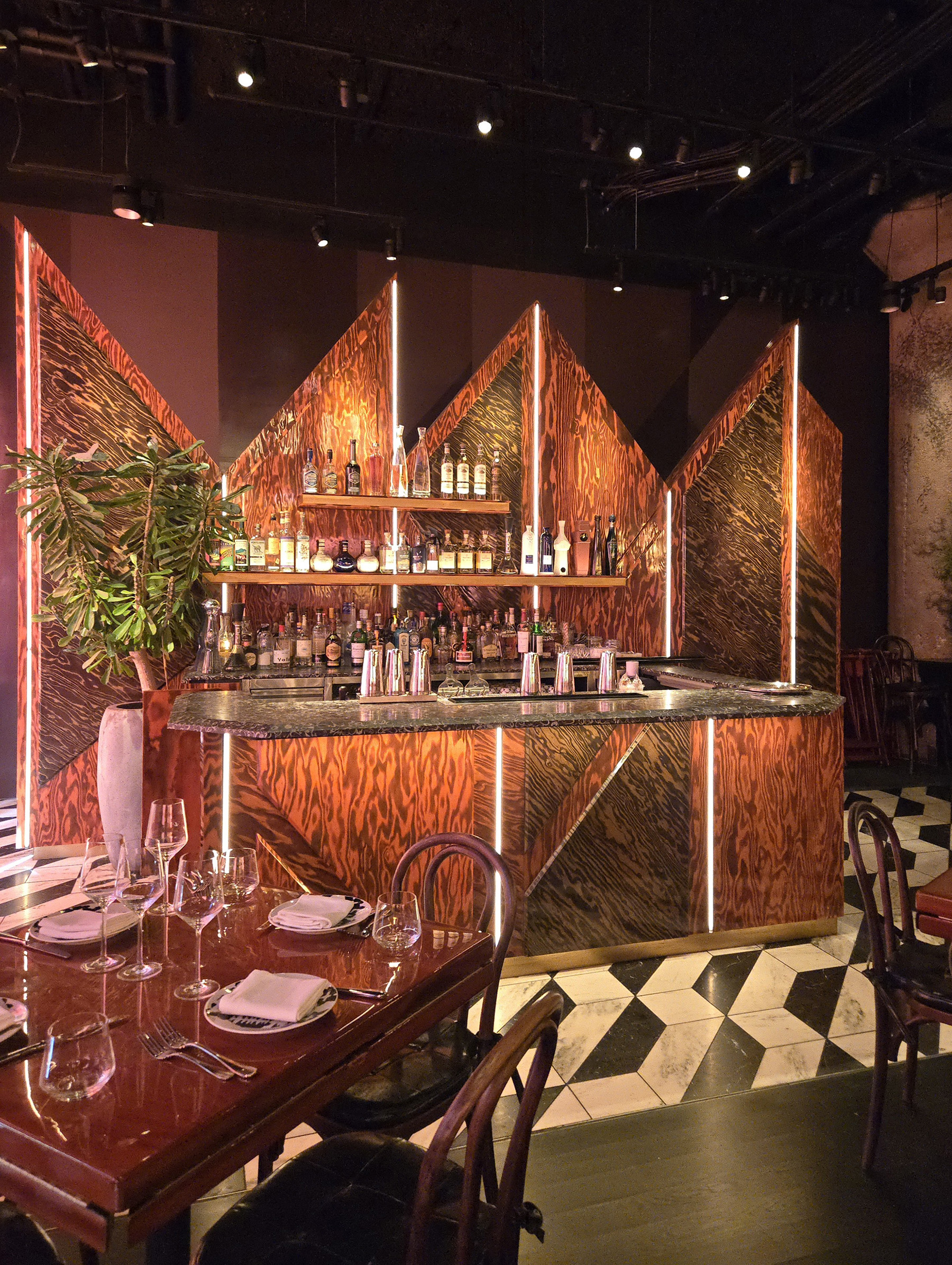 Flamed Oak, Walnut, Blackened Steel and Illuminated Acrylic merge to create an environment and delicious as the cuisine.