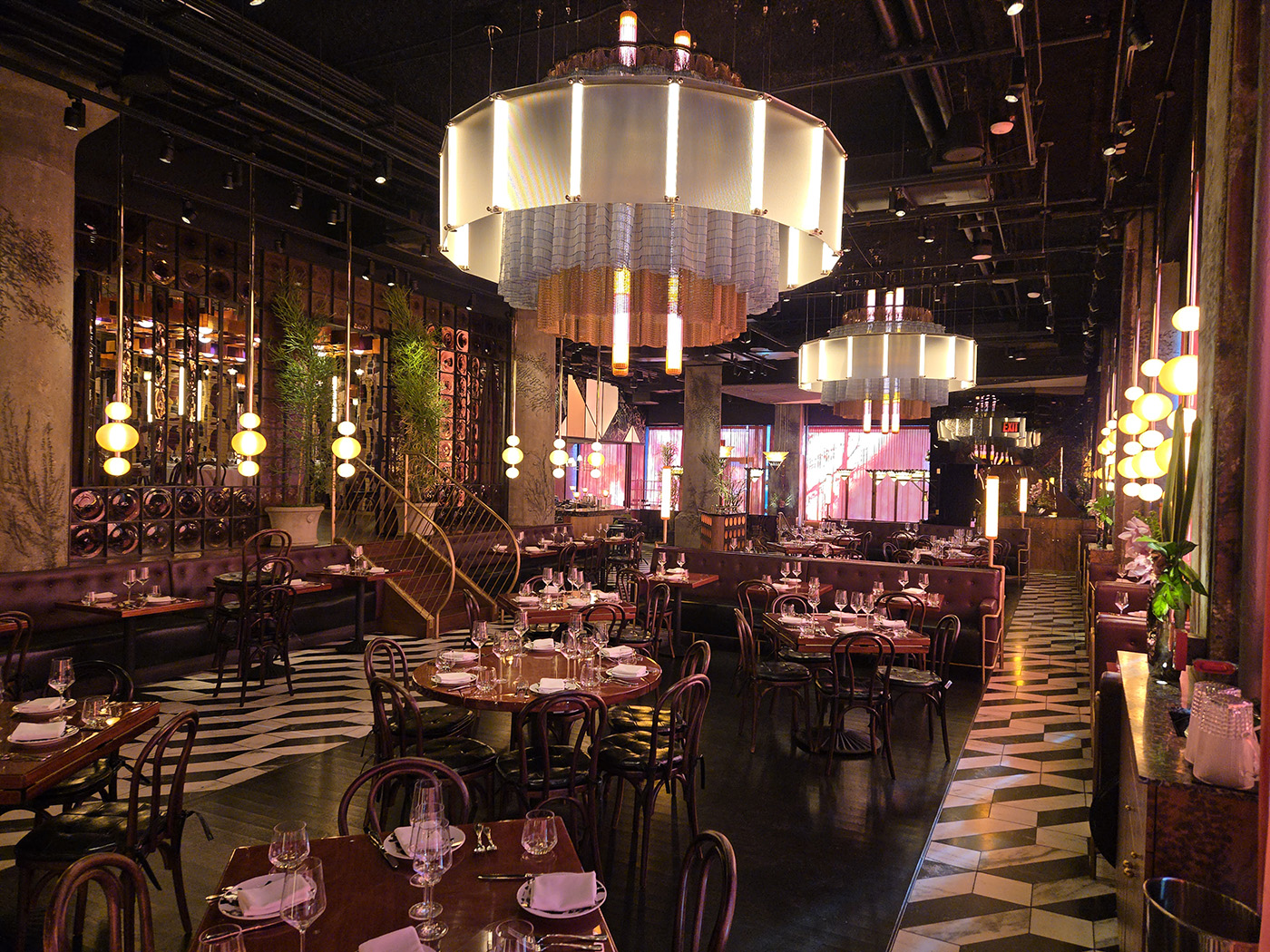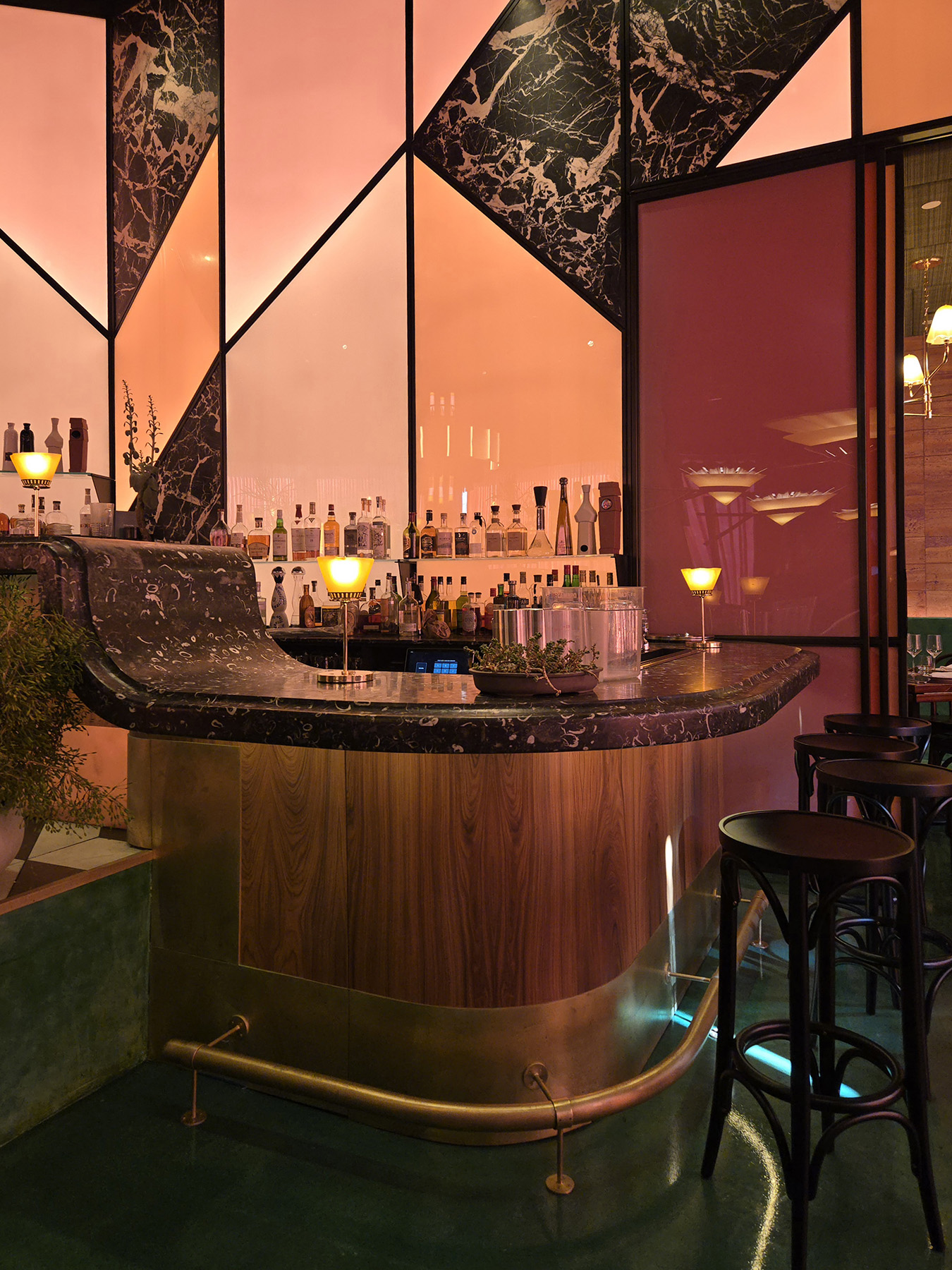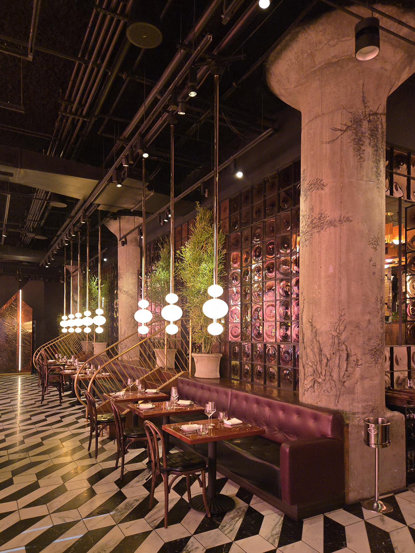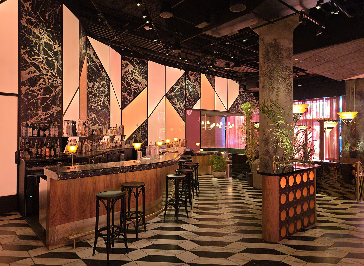 Flamed Oak, Walnut, Blackened Steel and Illuminated Acrylic merge to create an environment and delicious as the cuisine.