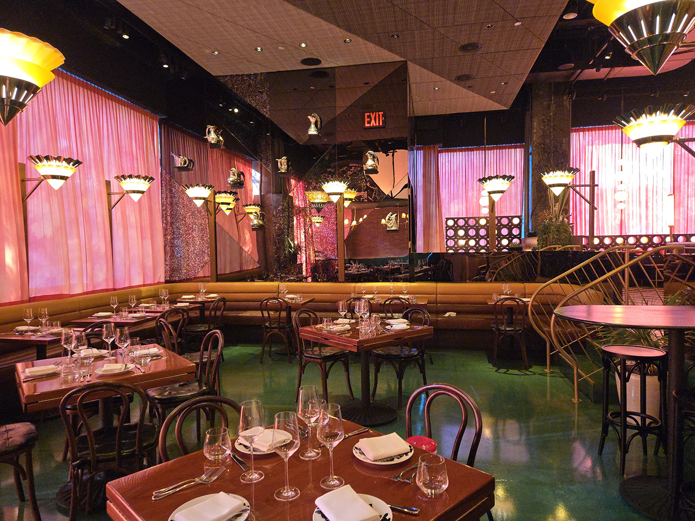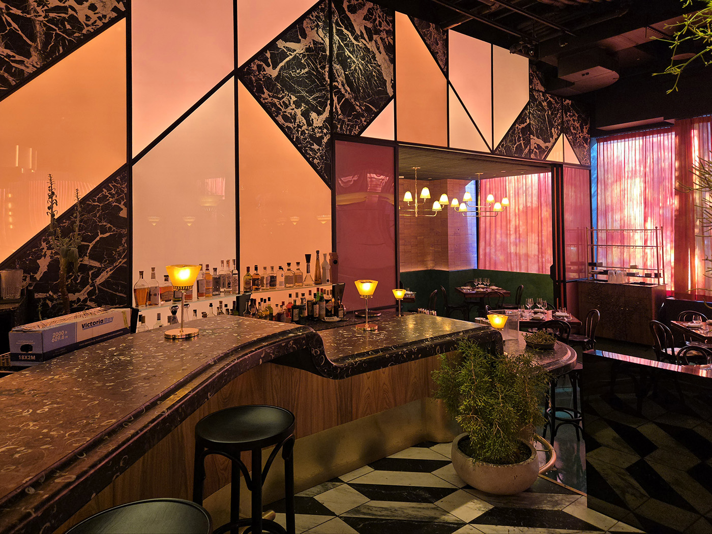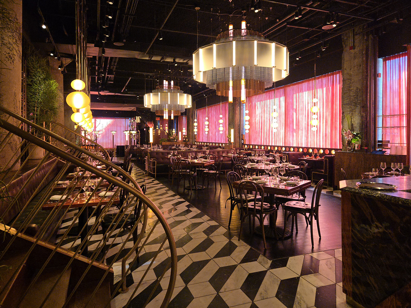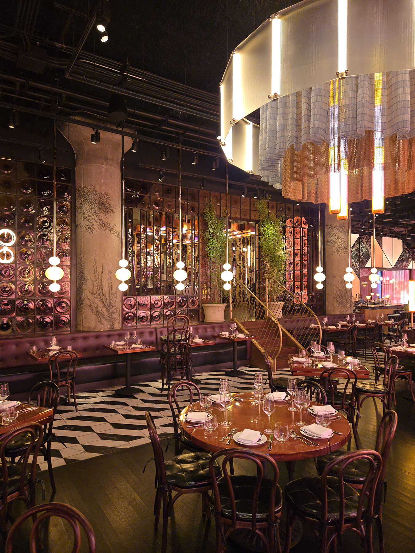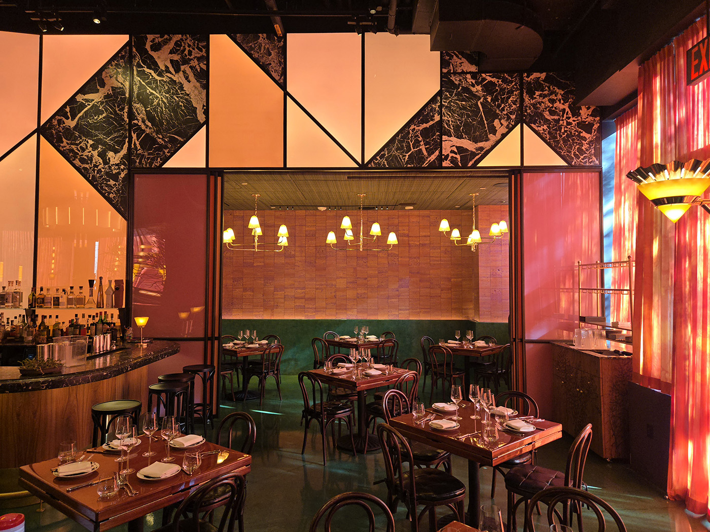 Flamed Oak, Walnut, Blackened Steel and Illuminated Acrylic merge to create an environment and delicious as the cuisine.