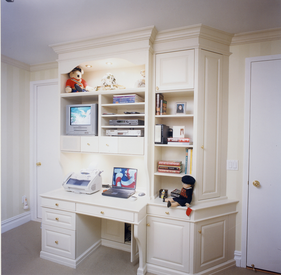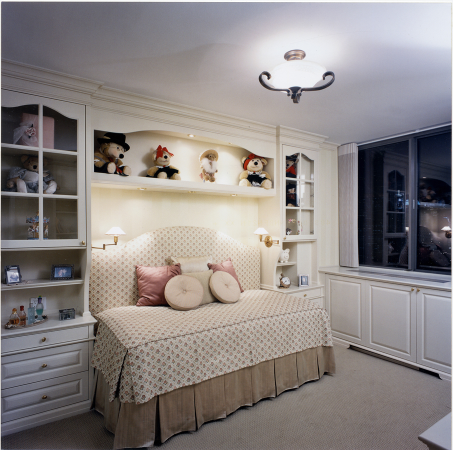 Sweet Traditional Child’s Bedroom in lacquer finish with day bed wrap around, HVAC enclosure and compact functional desk.
