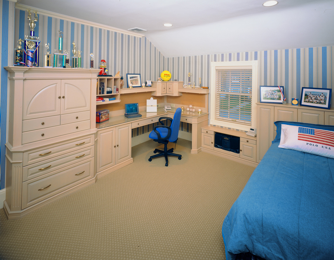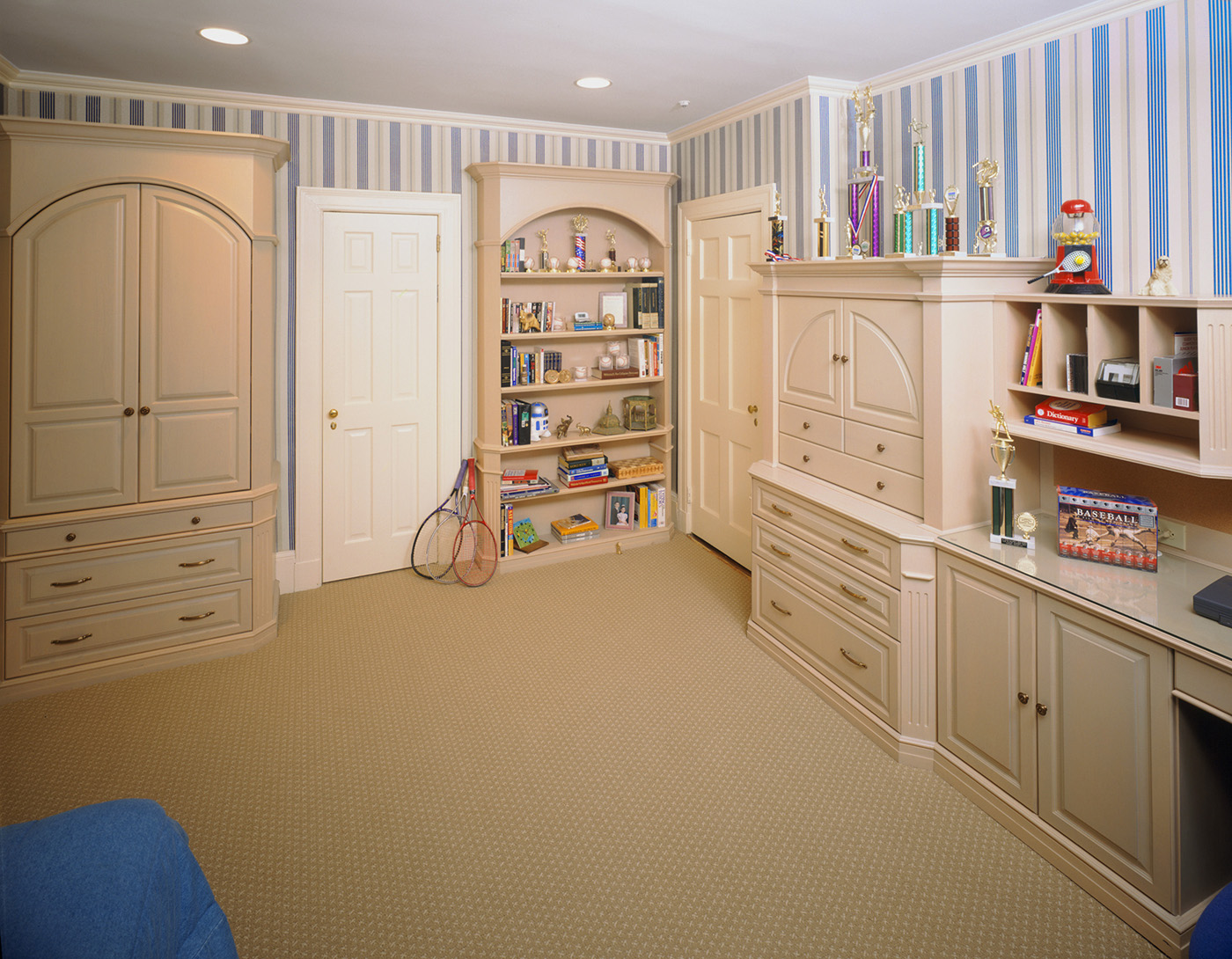Classic Traditional Boys Bedroom in washed Oak with raised panels, arched armoire and bookcase with storage bed and headboard.