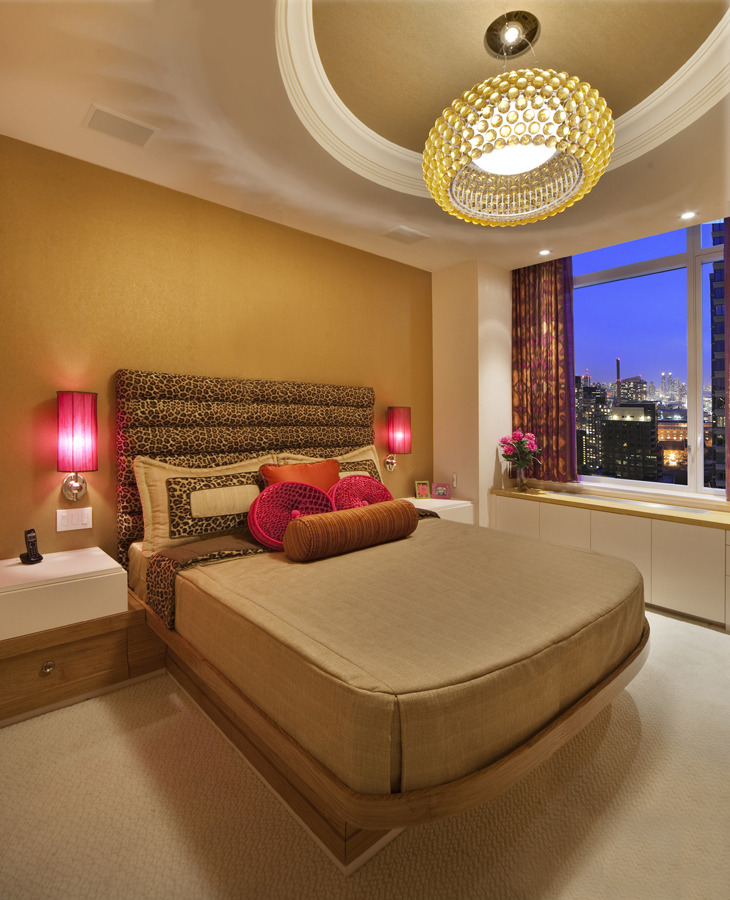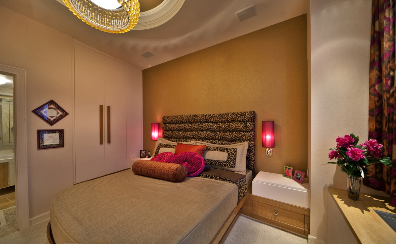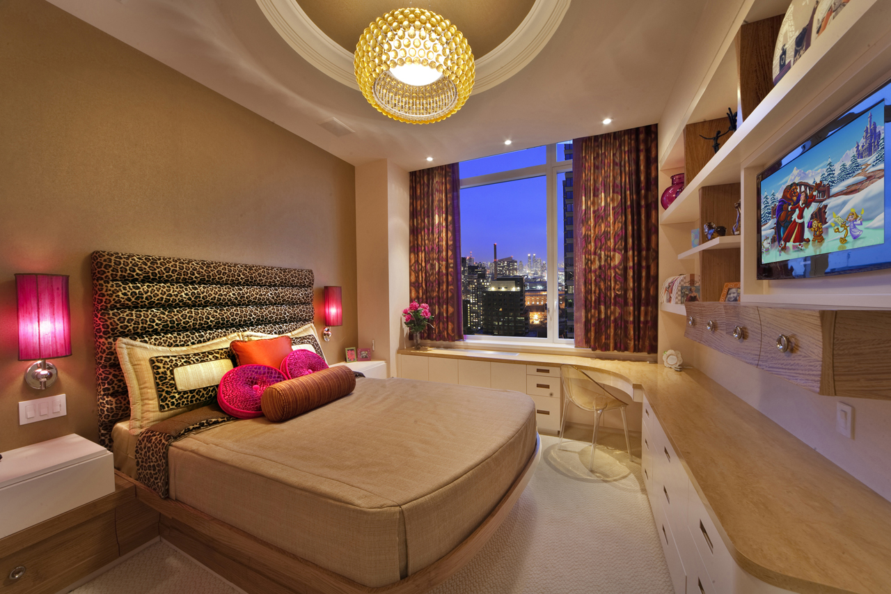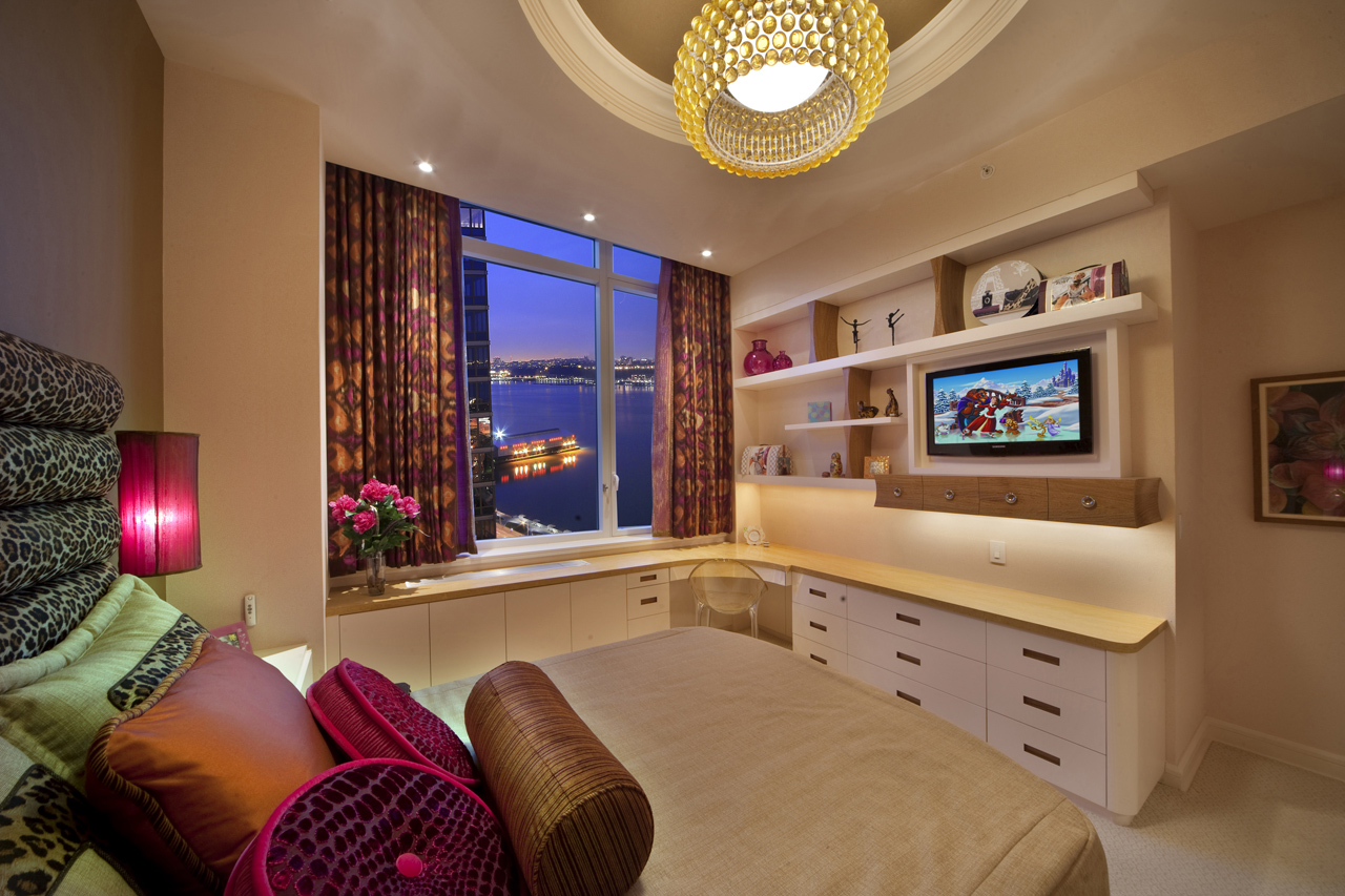 Girls Bedroom in Lacquer and Afromosia with Corian desk top, curved storage bed, concave drawer faces, custom armoire handles and rolled tigress headboard.