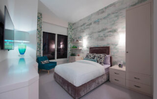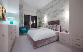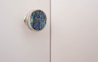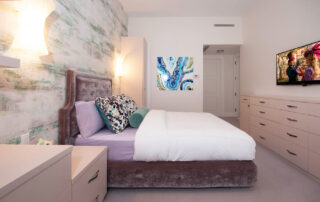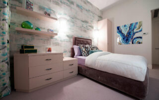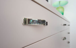 The furniture design elements for this peaceful and relaxing environment were conceived to provide maximum storage with an open and easy flow. The satin lacquer finished cabinetry and floating display shelves, along with the mother of pearl decorative hardware, compliment and merge with the artistic wall coverings and magnificent river view. The custom upholstered headboard, throw pillows and platform bed detailed with polished nickel feet complete this lovingly inspired custom design.