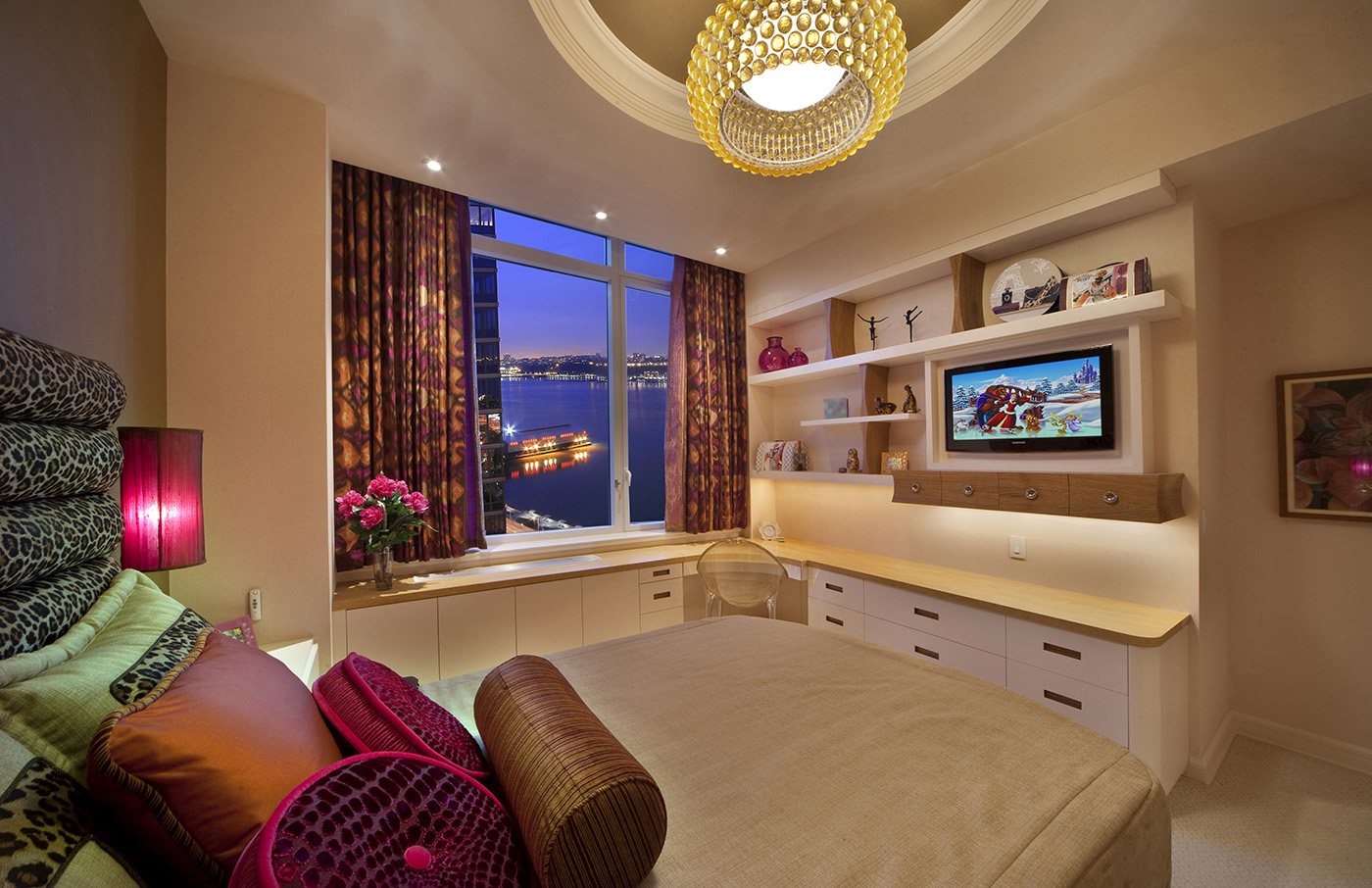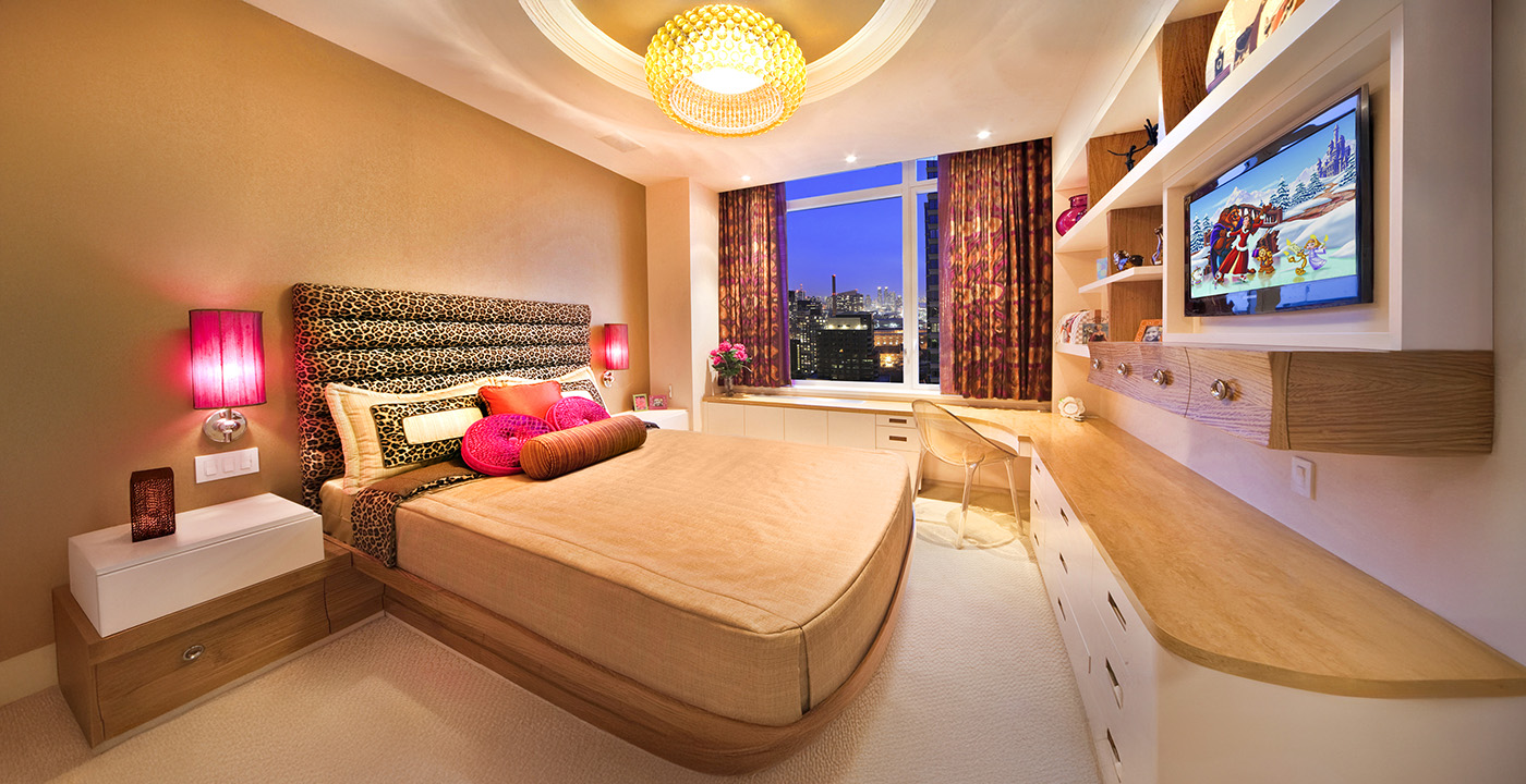 Girls Bedroom in Lacquer and Afromosia with Corian desk top, curved storage bed, concave drawer faces, custom armoire handles and rolled tigress headboard.