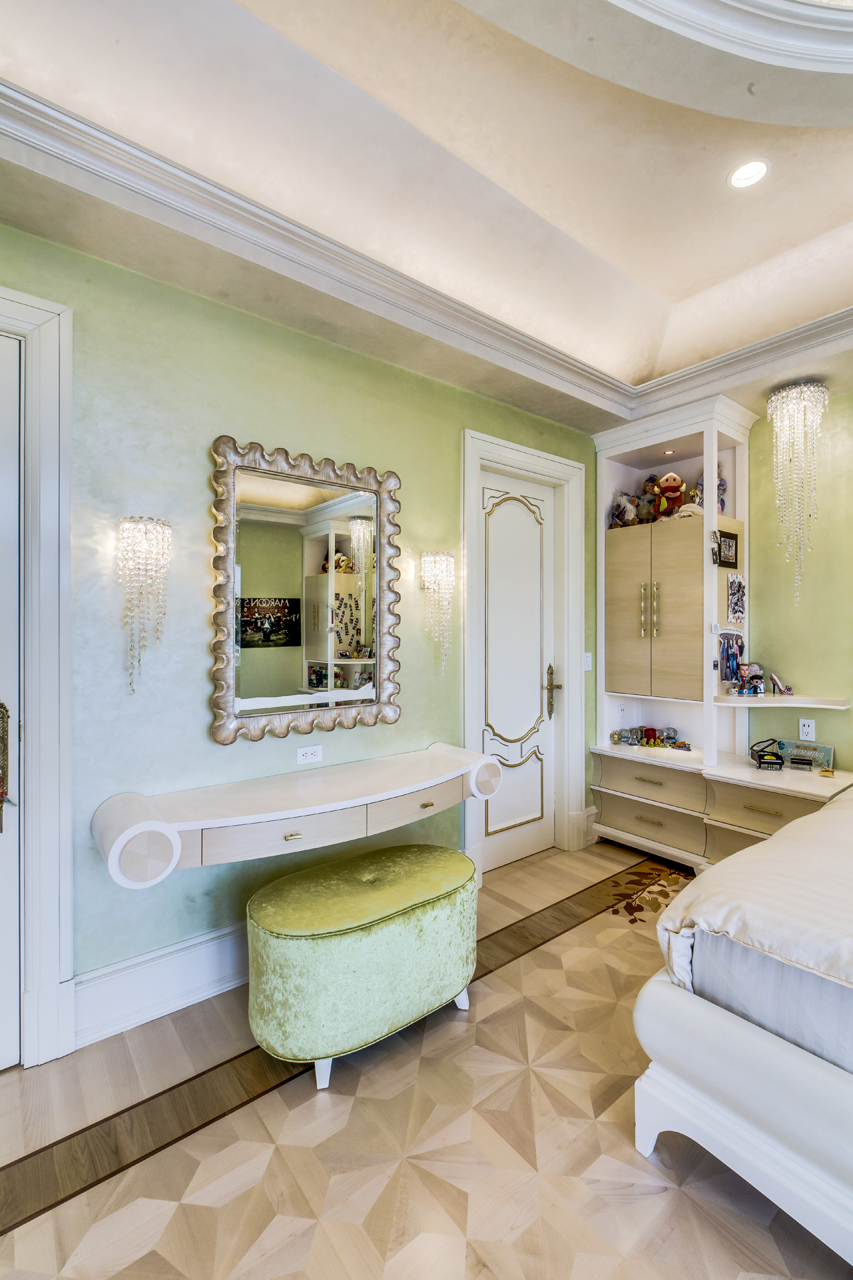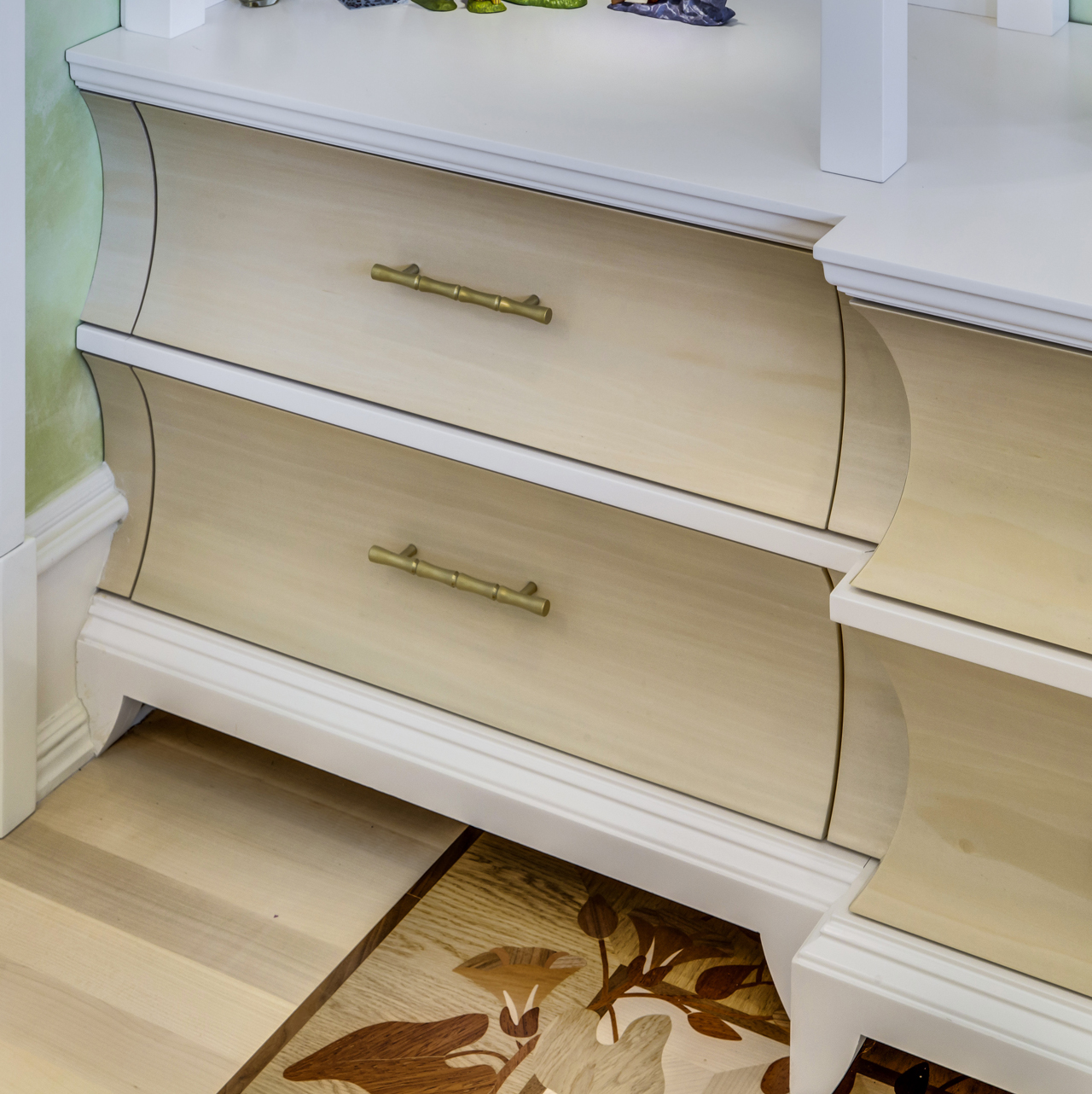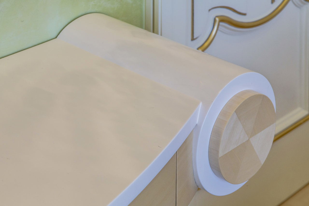 This radiant girl’s bedroom design features curved drawer faces, a bombayed floating dressing table, open shelving, desk, upholstered upper bed frame and rolled headboard, and is finished in a combination of satin lacquer with a creamy Sycamore Tabu veneer.