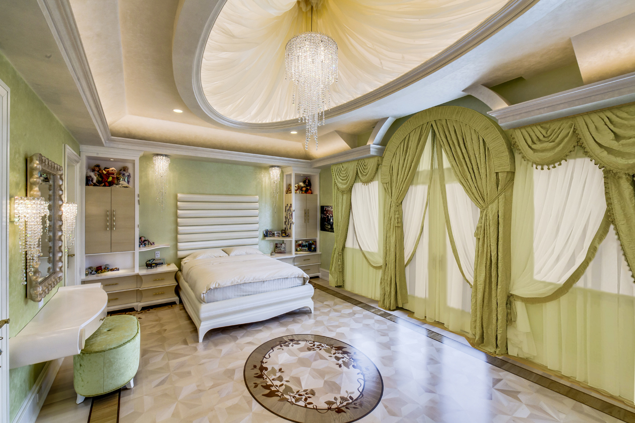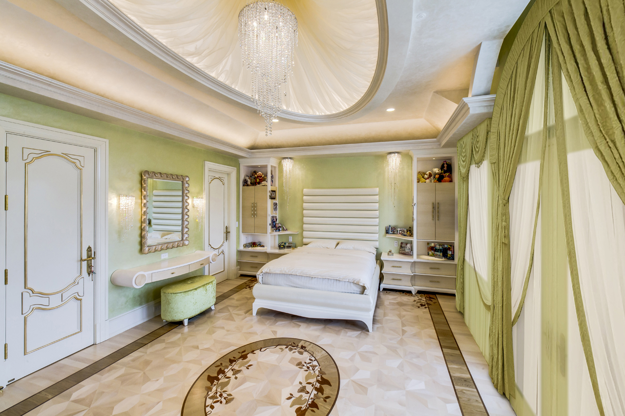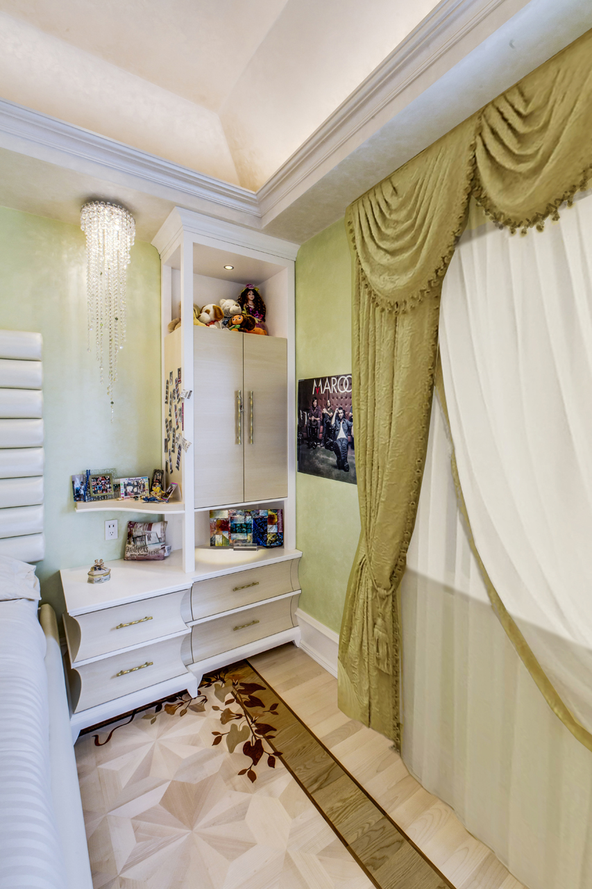 This radiant girl’s bedroom design features curved drawer faces, a bombayed floating dressing table, open shelving, desk, upholstered upper bed frame and rolled headboard, and is finished in a combination of satin lacquer with a creamy Sycamore Tabu veneer.