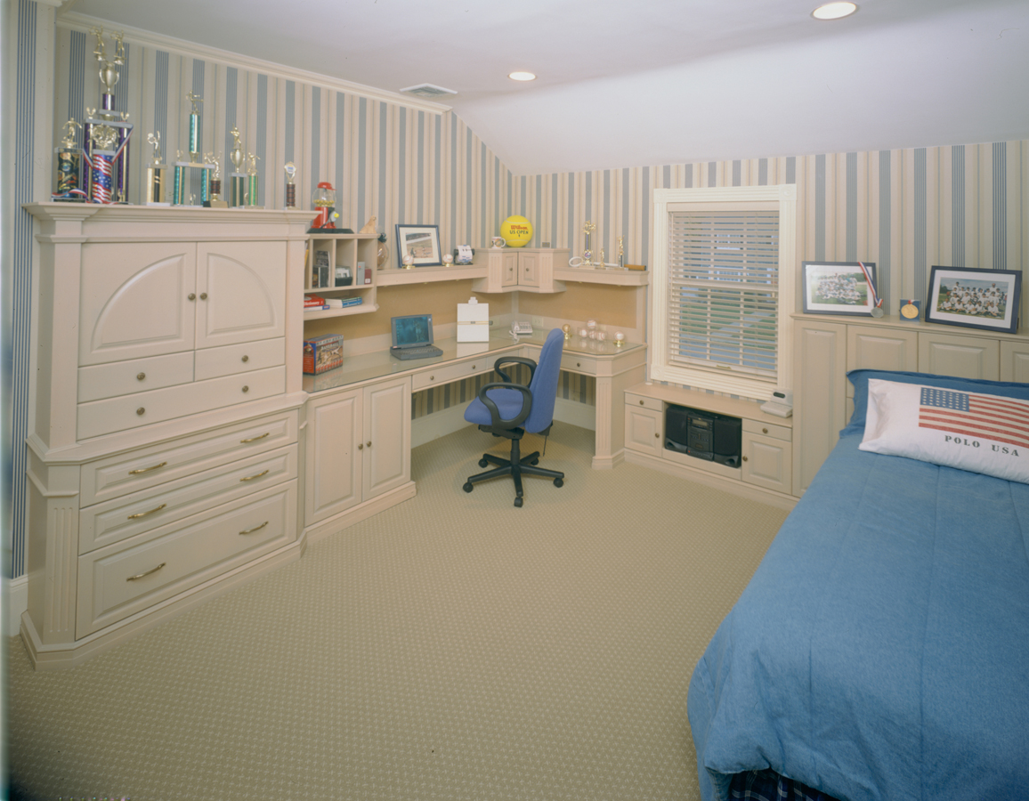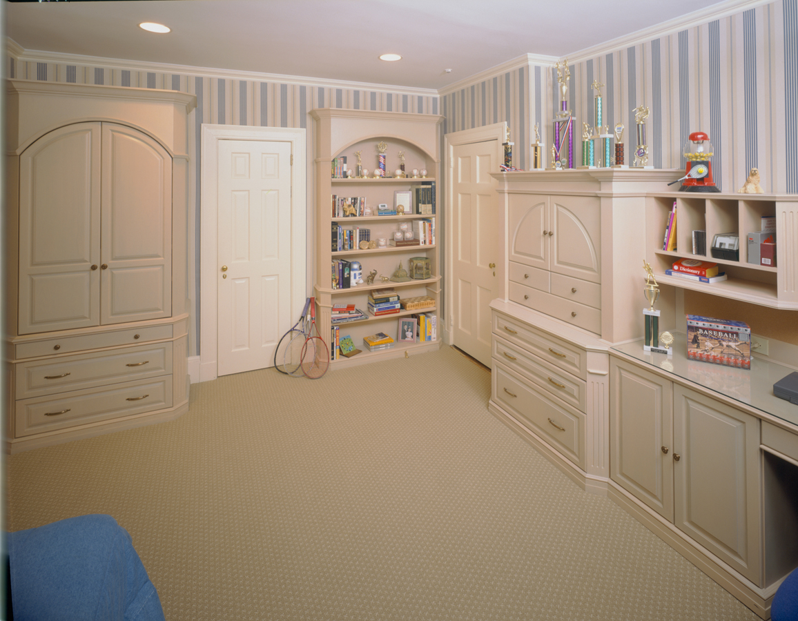 Classic Traditional Boys Bedroom in washed Oak with raised panels, arched armoire and bookcase with storage bed and headboard.