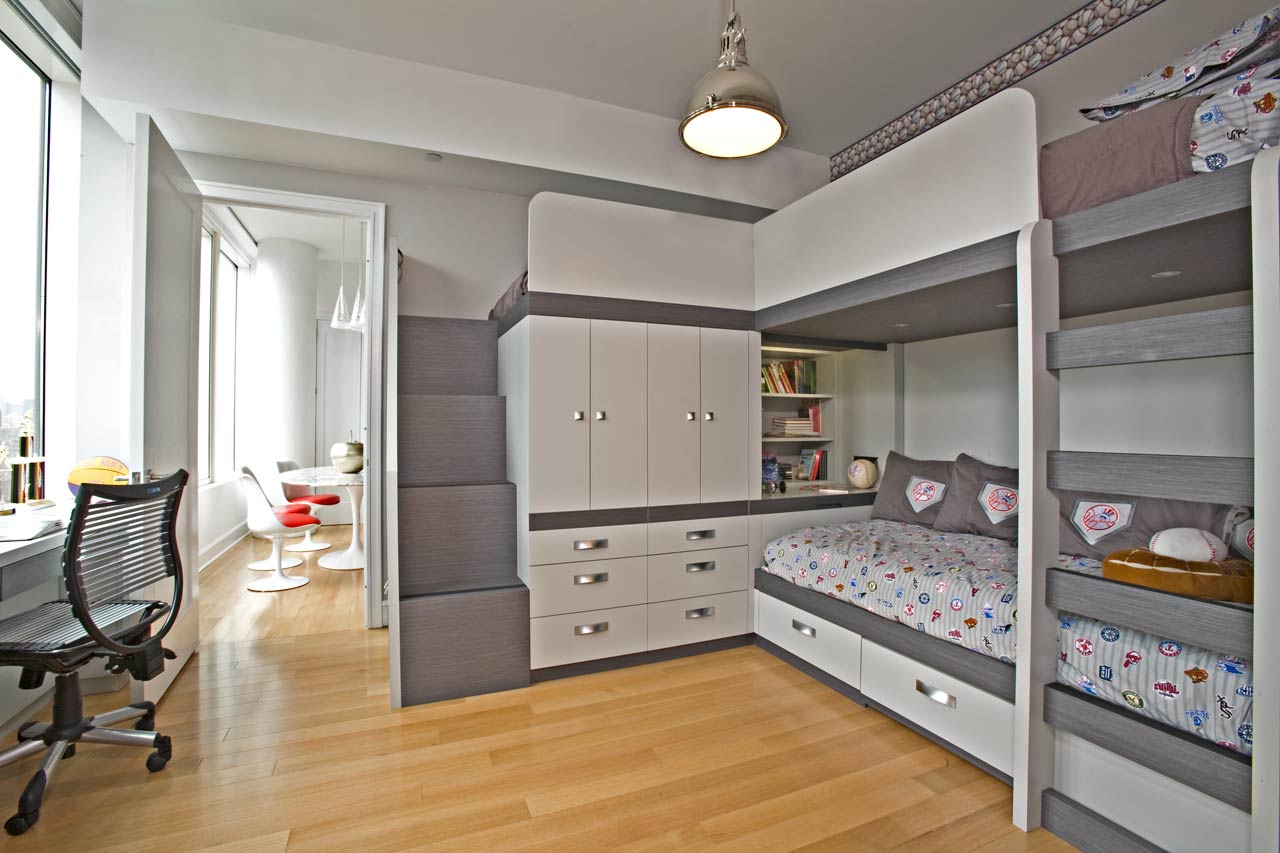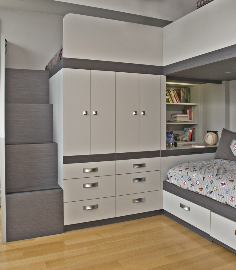 Contemorary Loft Bed For Three in Tree Frog Laminate with staircase, ladder and deep storage.