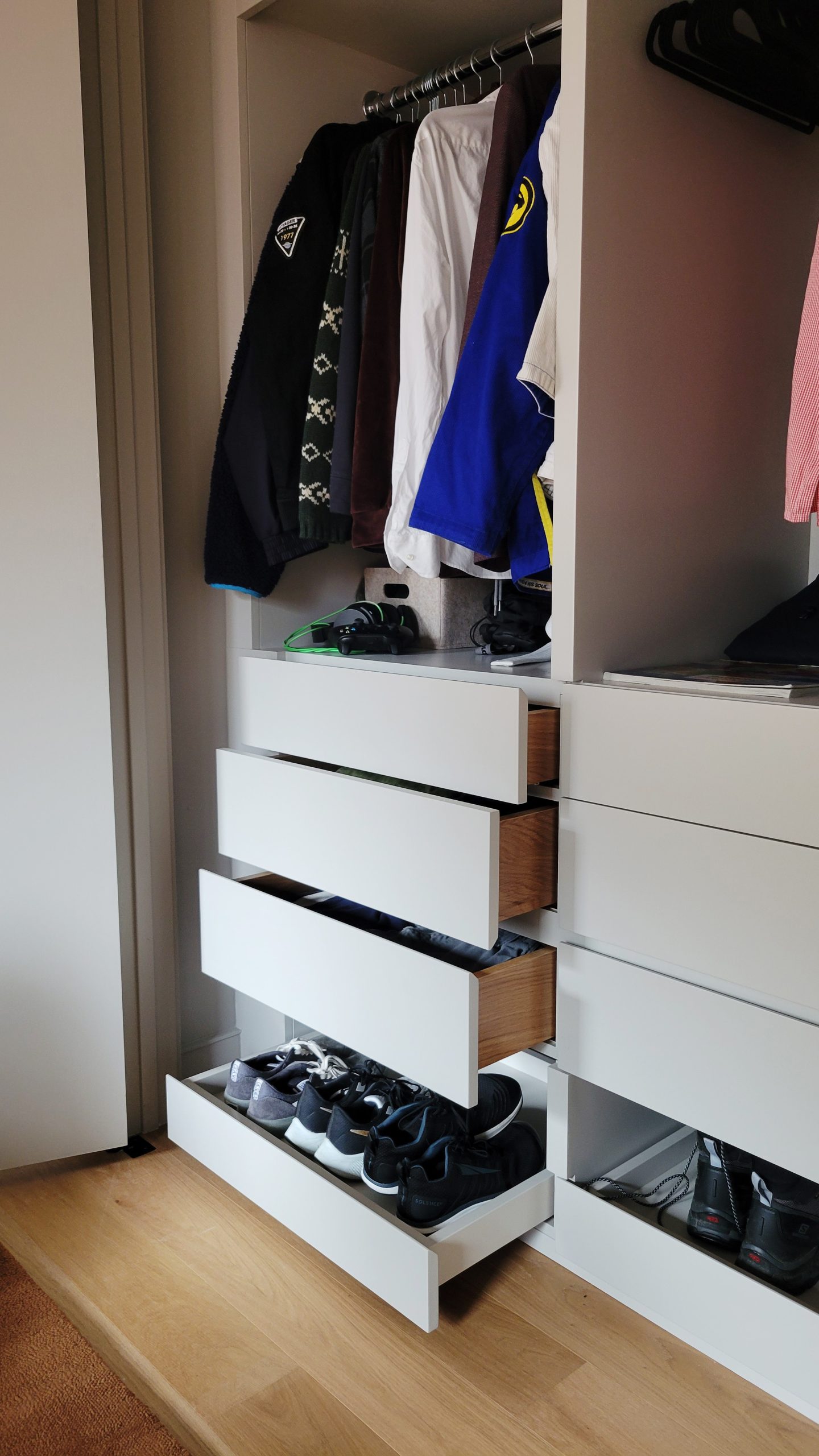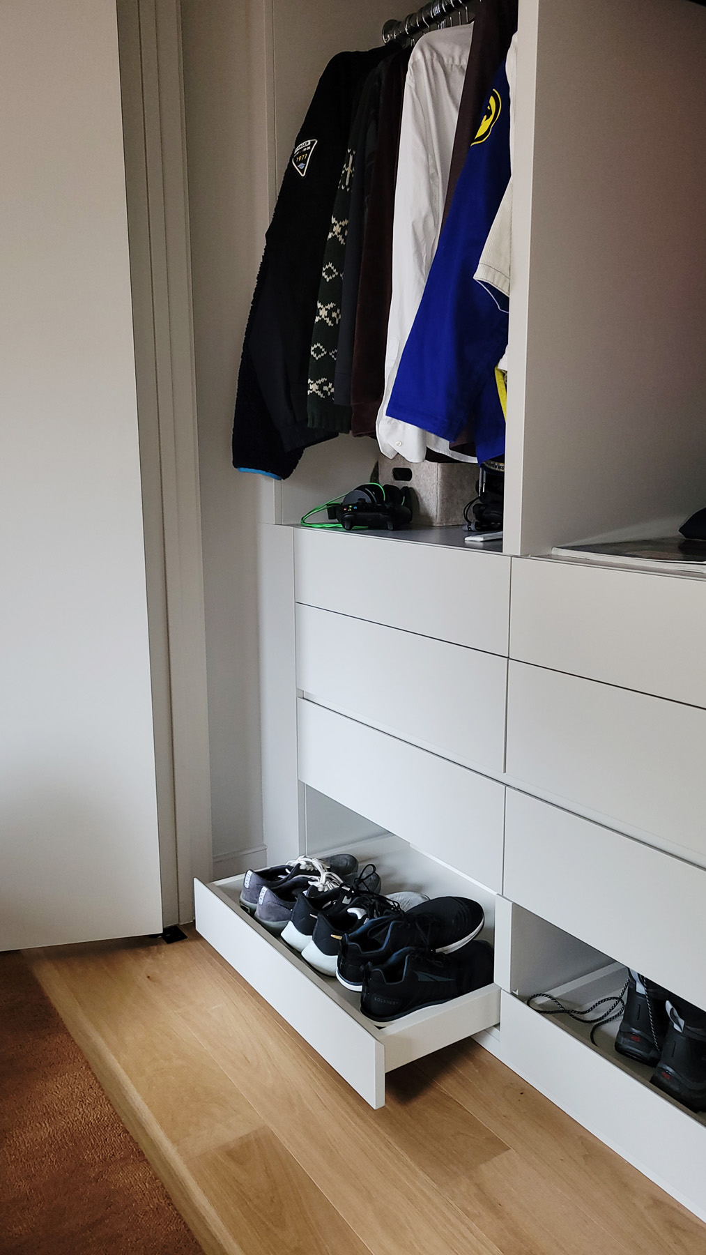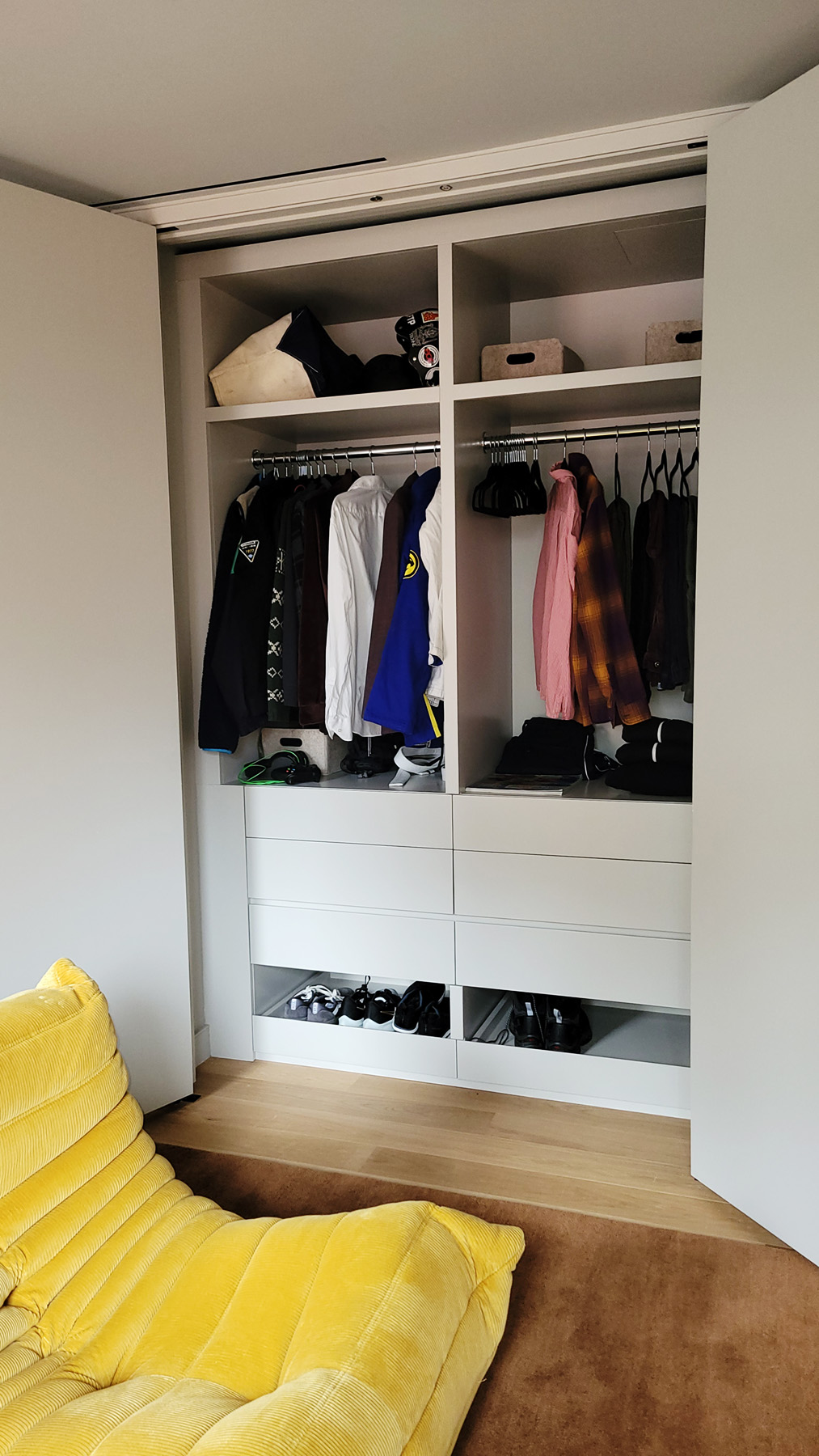 This completely built-in satin lacquered closet is scribed all around provides dresser drawers, pull-out shoe trays, and over six feet of hanging space in this boy’s bedroom.