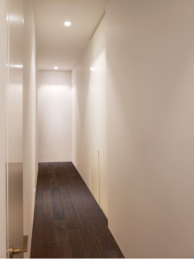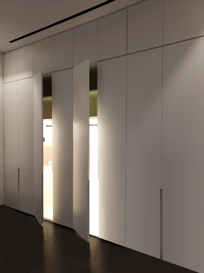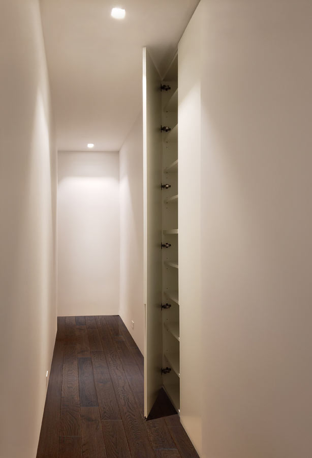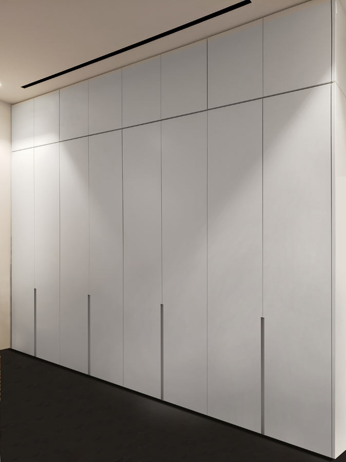 These examples of modern closet additions, finished in satin lacquer and featuring flush finger pulls and with optional automatic interior lighting, are floor to ceiling built-in designs that fit seamlessly within the architectural environment.