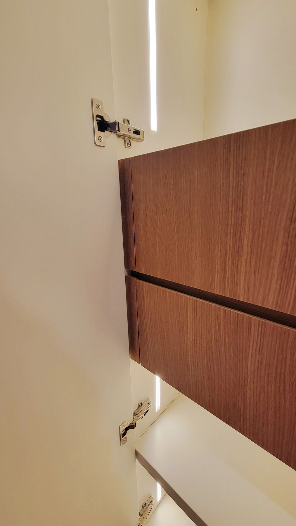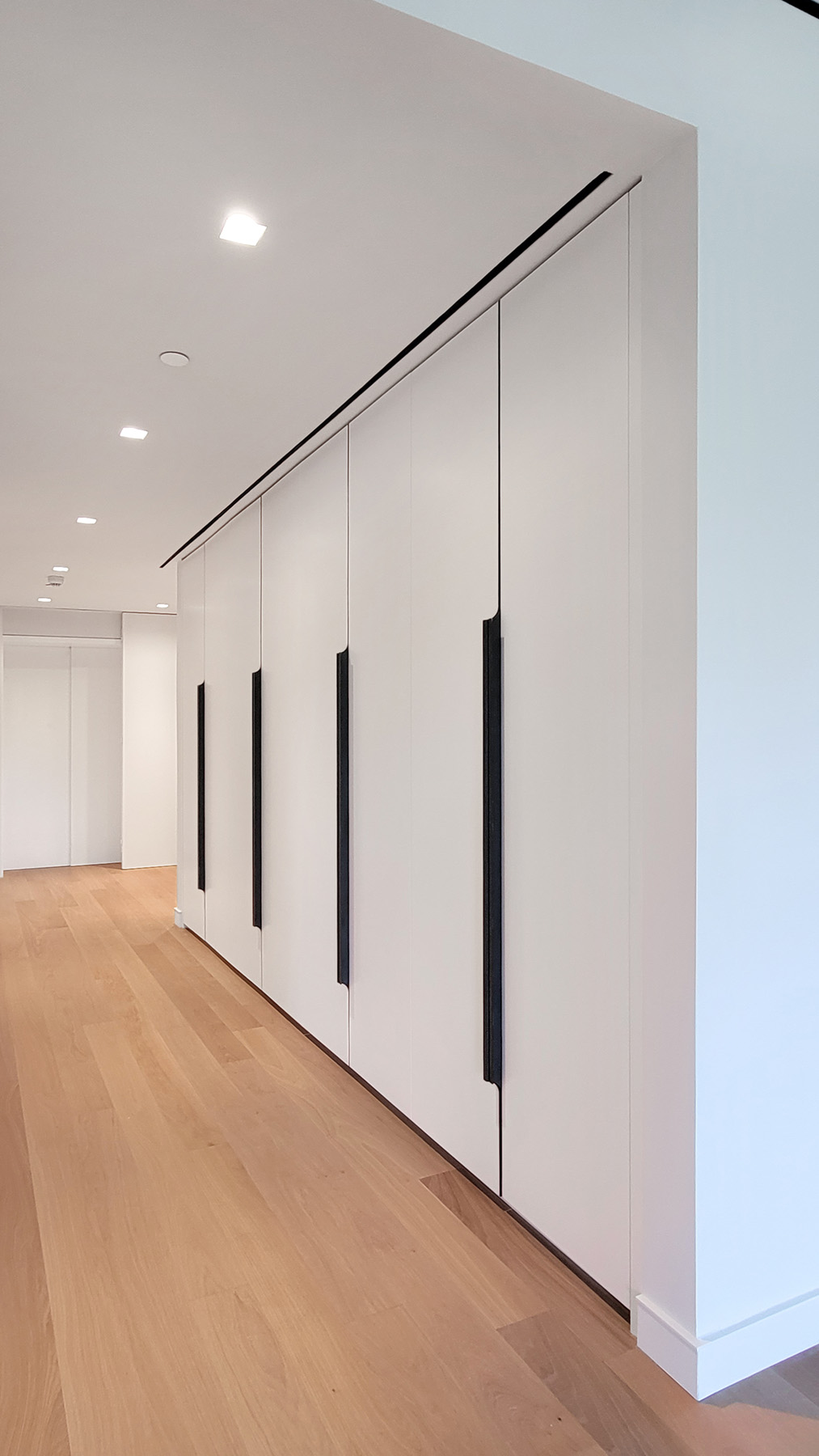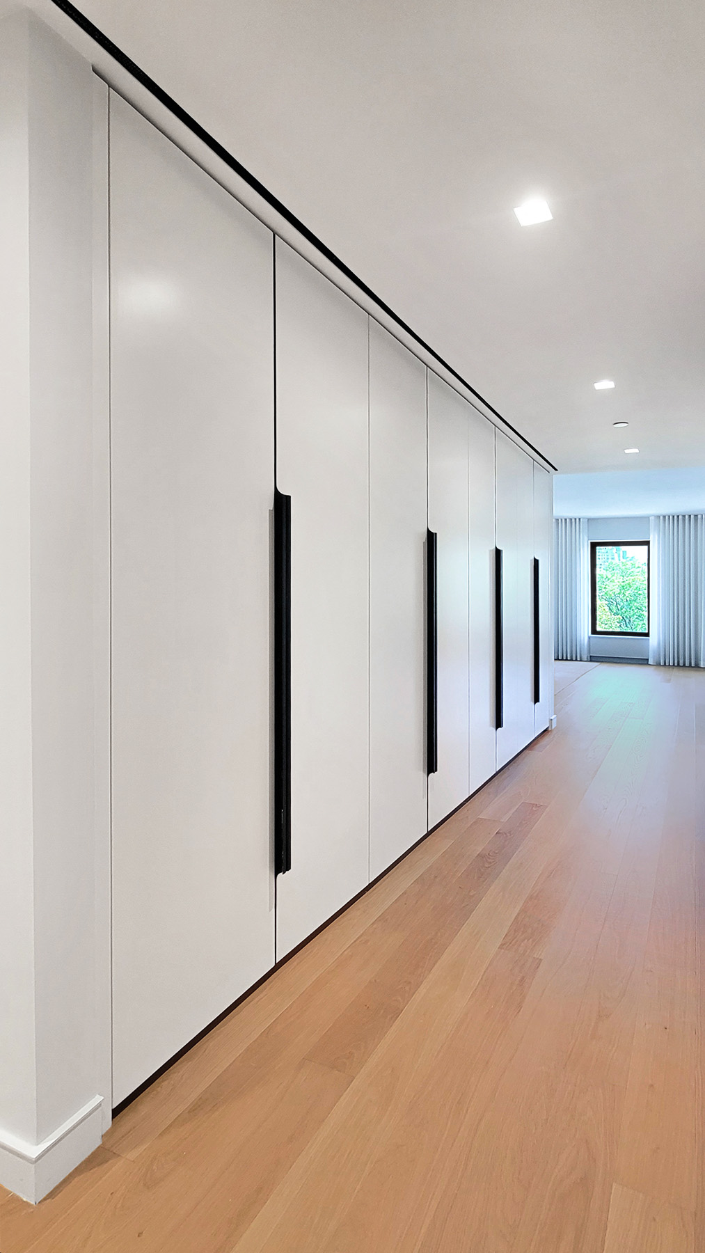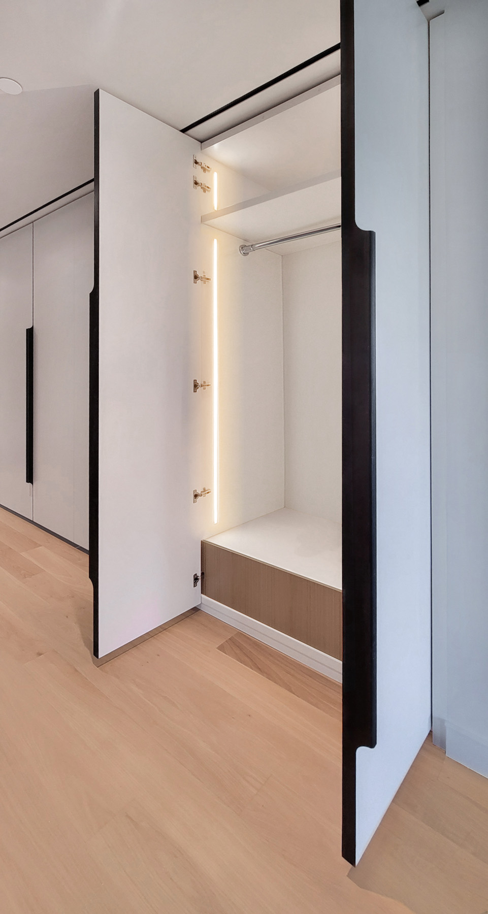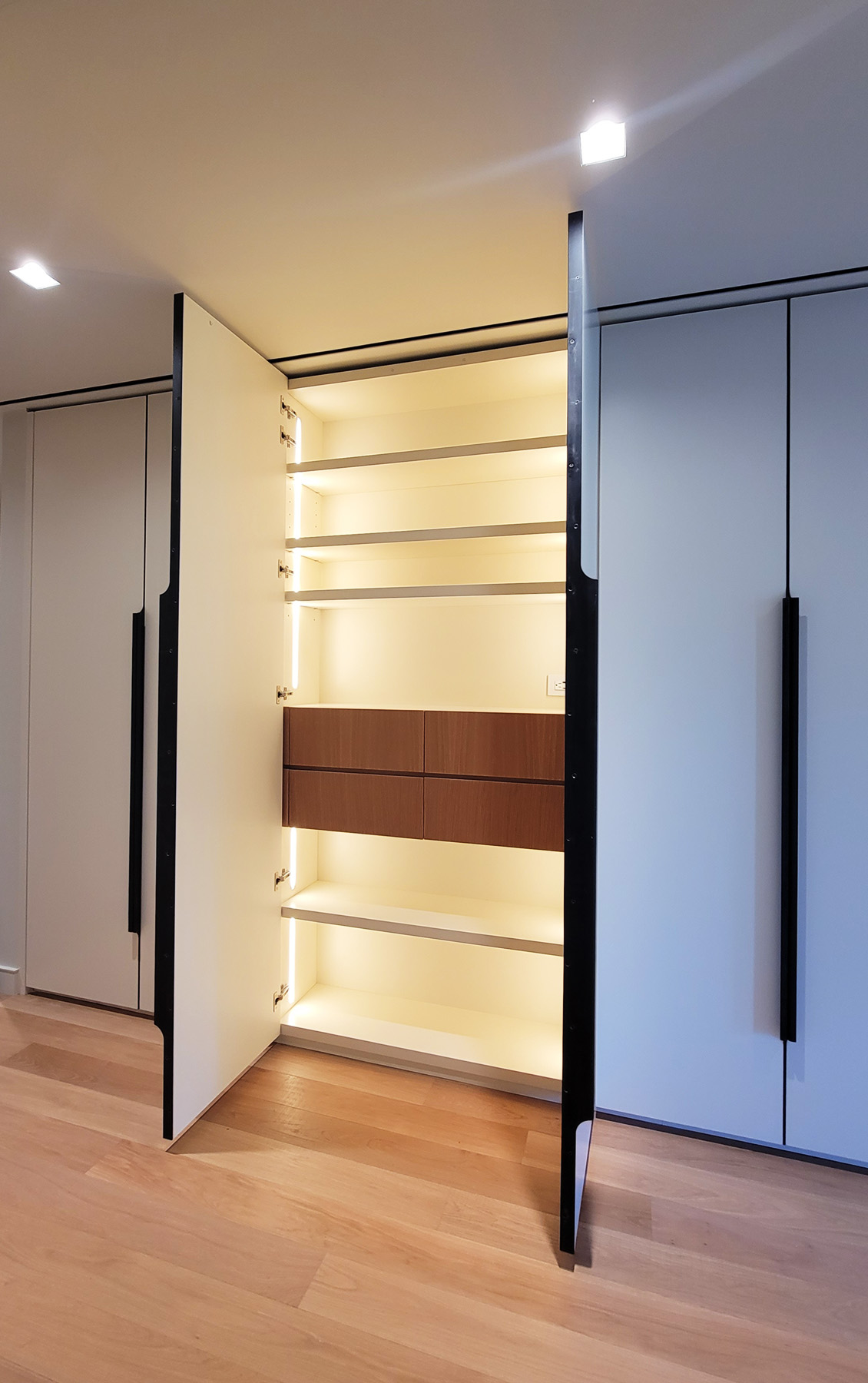 This grand, impeccably installed wall-to-wall, floor-to-ceiling Modern Entry Hallway Closet features custom made nine-foot doors, elegant Bronze Edge Pulls, and Illuminated Interiors, with lighting that is activated as each section is opened. This highly functional custom millwork provides long and short hanging for coats and jackets, shelving for shoes and drawers in Stained White Oak with integrated edge pulls for gloves and scarves.