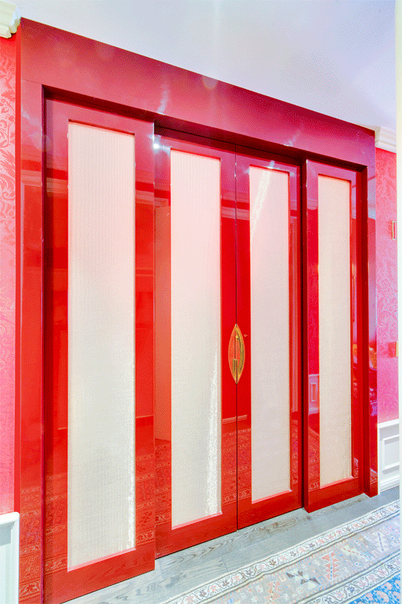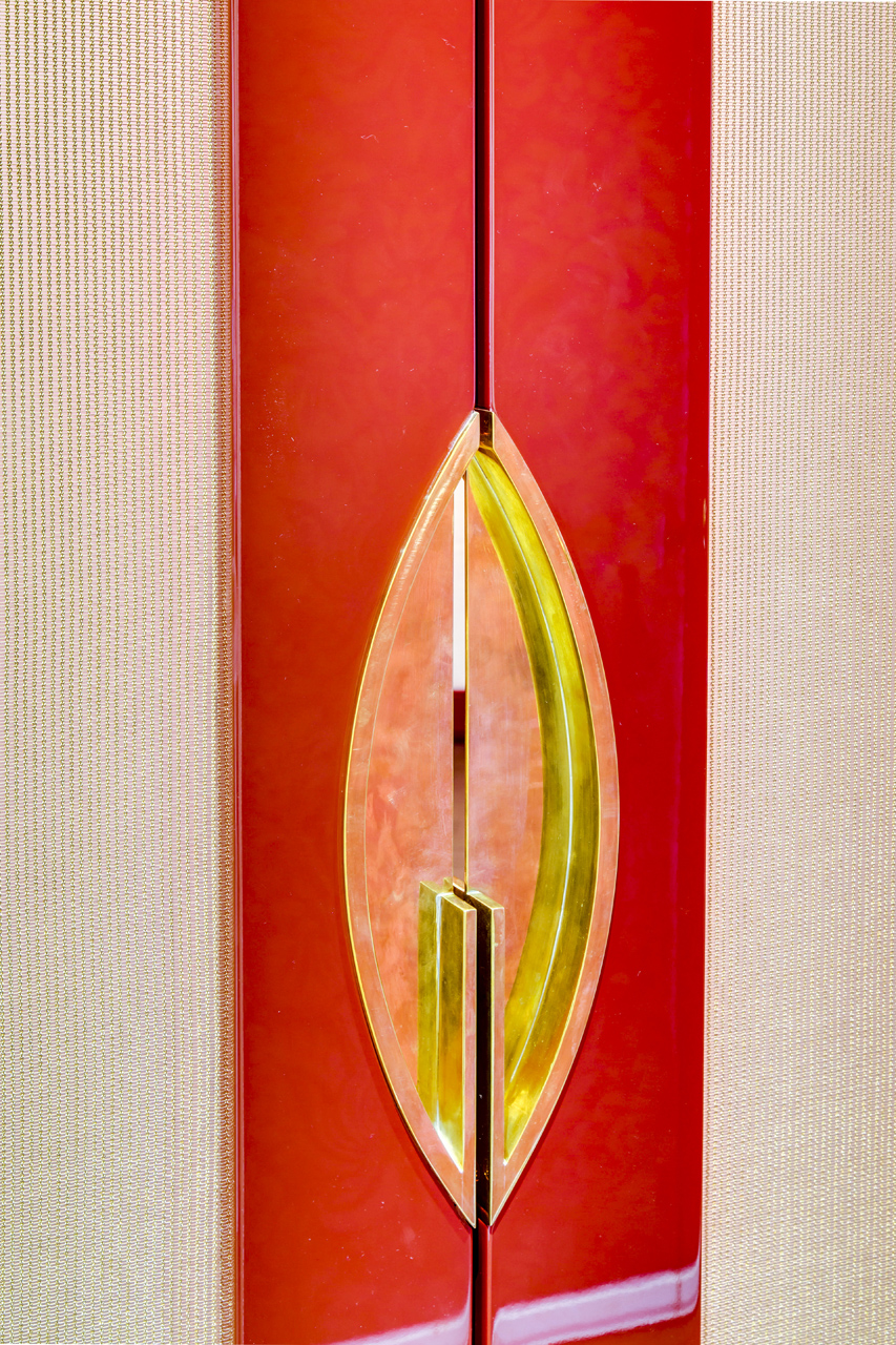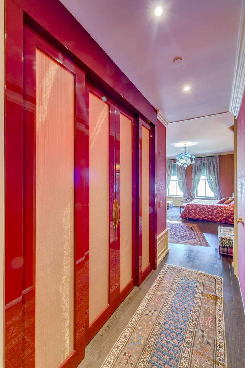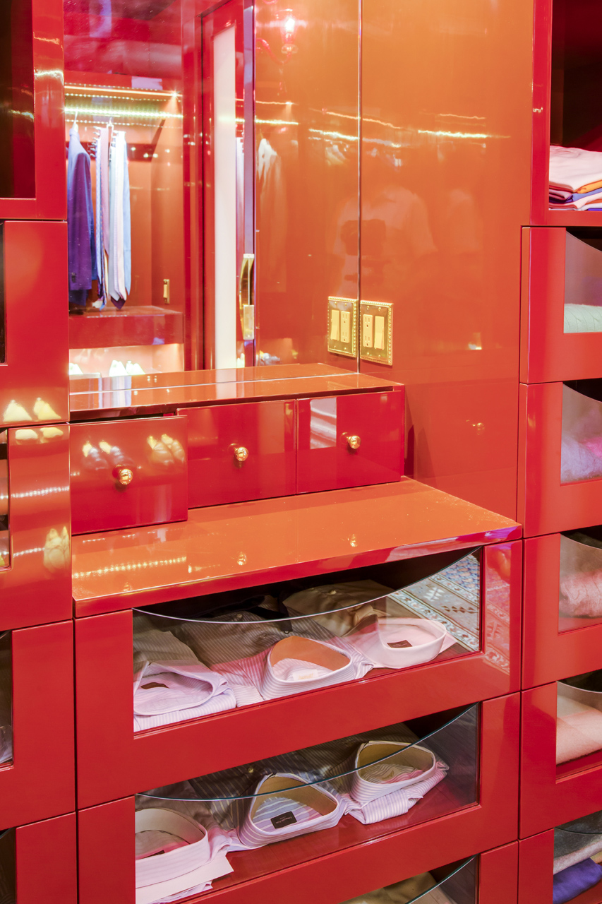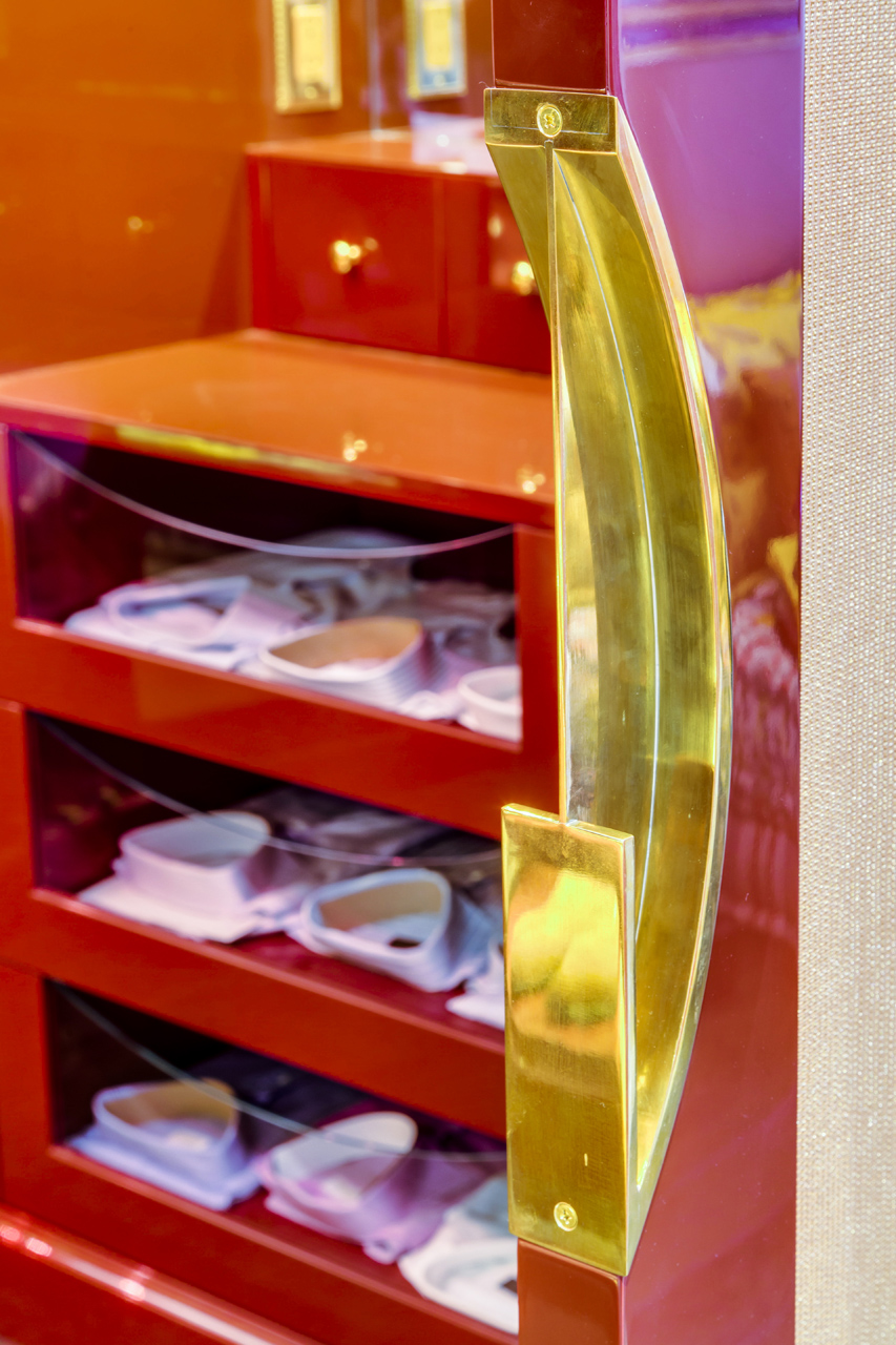 This elegant and highly functional high gloss polished lacquer walk-in closet features sliding entry doors with woven mesh panels and custom brass hardware, 3 way mirrors, see through drawers and complete LED clothing illumination.