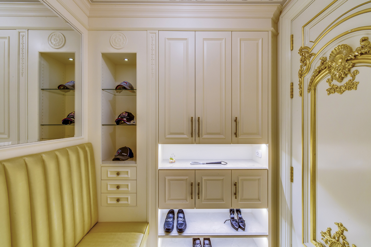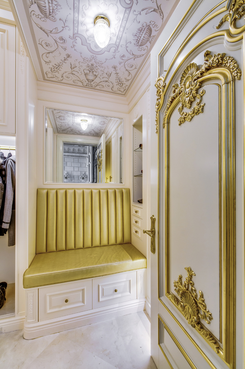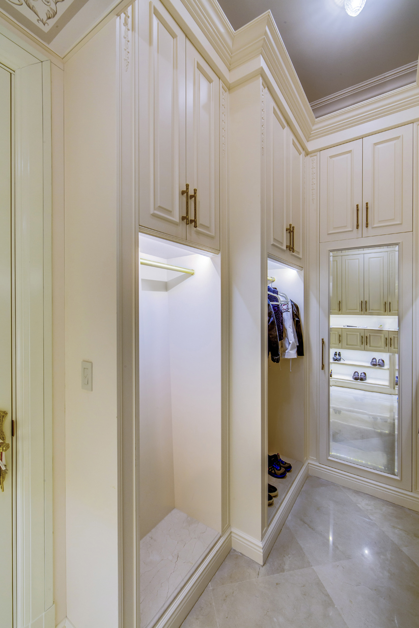 This walk-in coat closet features fine traditional detailing, and offers ample hanging space, shoe shelving, drawers and cabinetry with a comfortable bench that is upholstered in an elegant and practical faux leather.