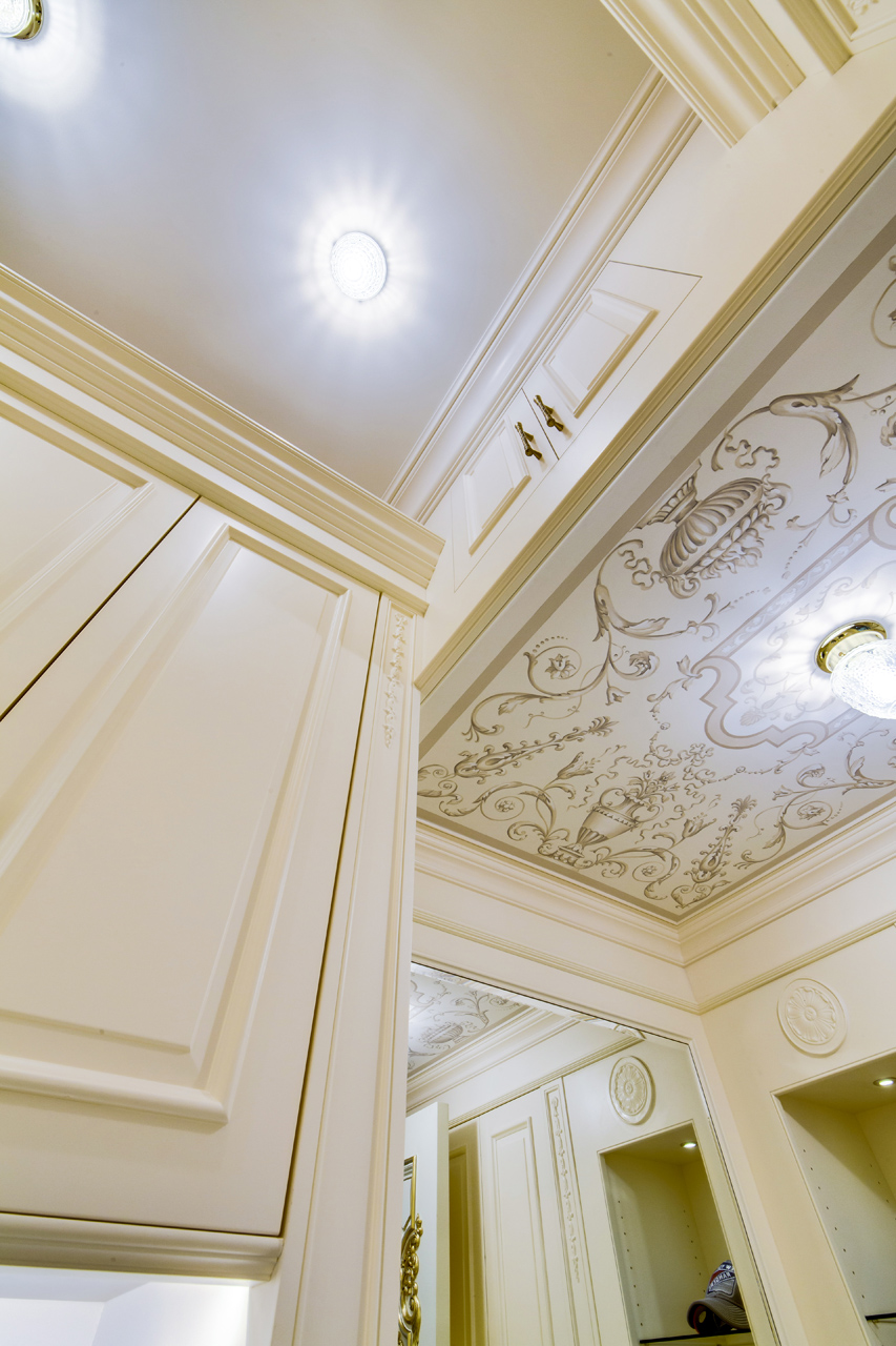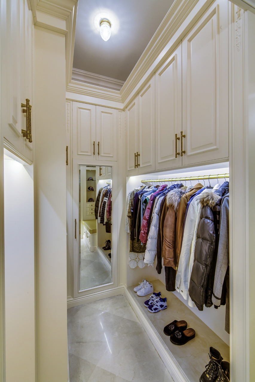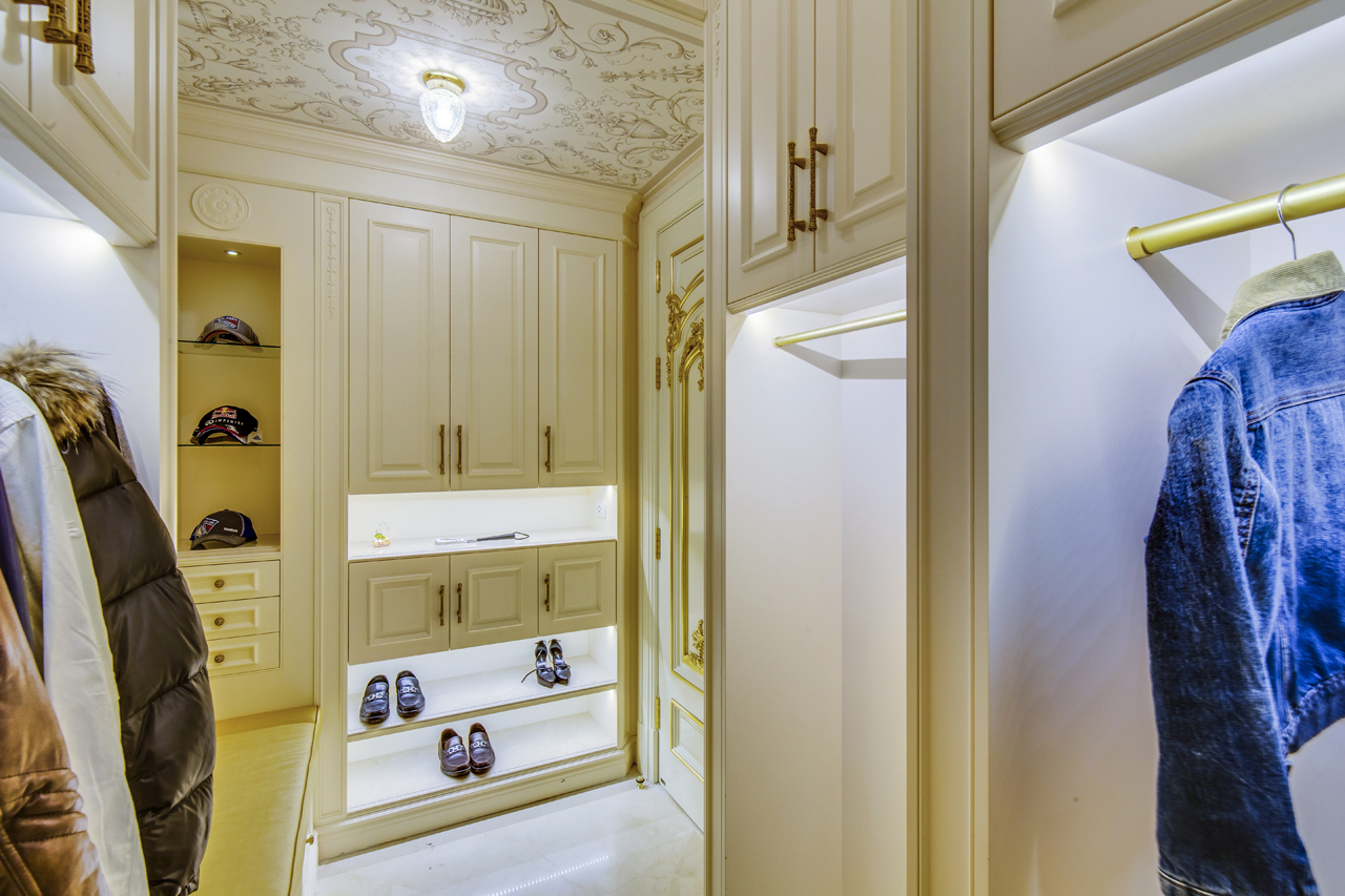 This walk-in coat closet features fine traditional detailing, and offers ample hanging space, shoe shelving, drawers and cabinetry with a comfortable bench that is upholstered in an elegant and practical faux leather.