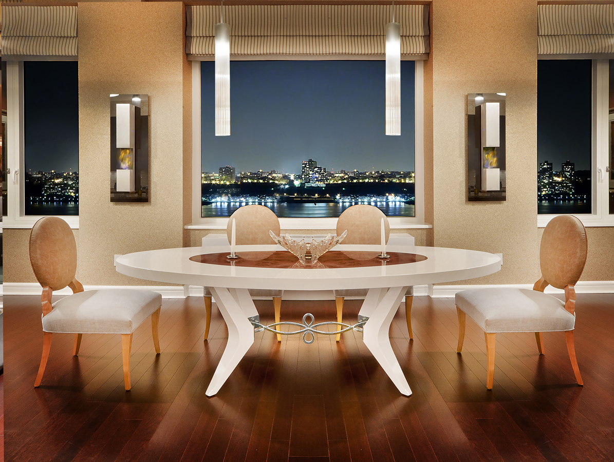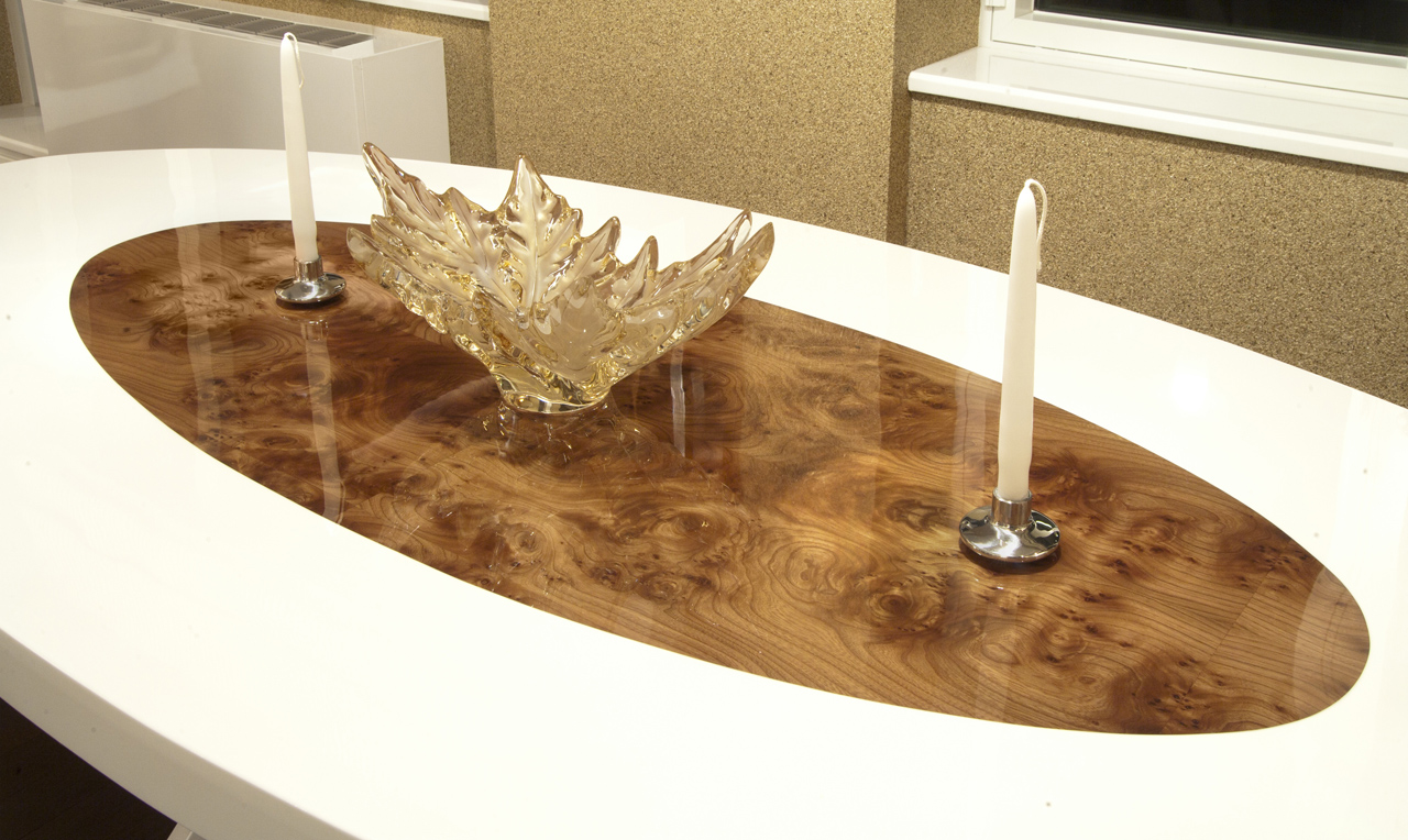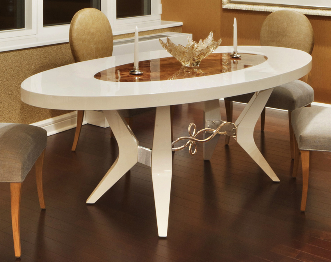 Infinity Bow Dining Table in high gloss polished Polyester with bleached Walnut Burl inset top and polished Nickel sculpted accents.