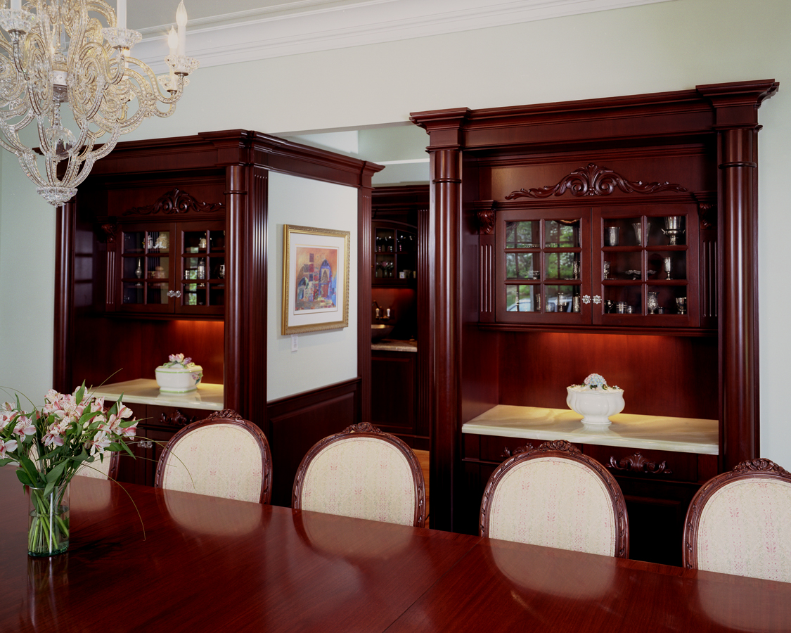 Inviting Dining Room Millwork with exquisite traditional details throughout, from the entry to the twin serving areas and around to the wine pantry and vessel sink cabinetry.