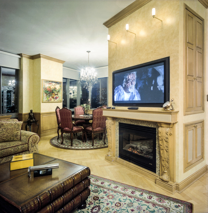 Wainscoting Warms City Dining Room and flows seamlessly with the architectural millwork in the adjoining living room area.